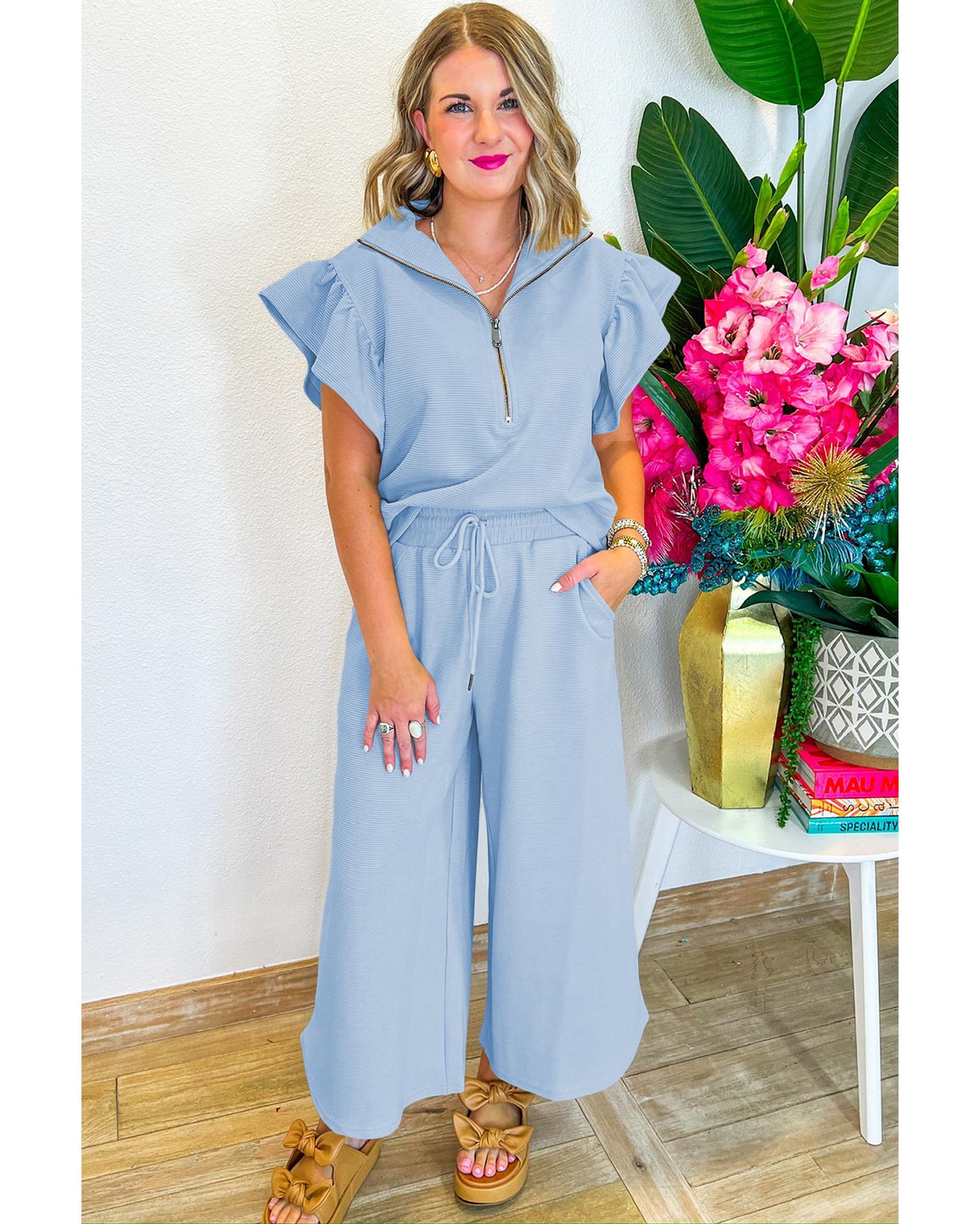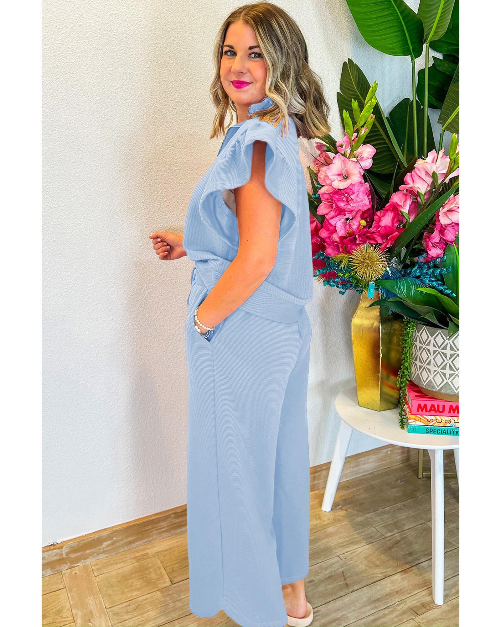 Beau Blue Textured Ruffled Sleeve Zipped Top and Wide Leg Pants Set - XL