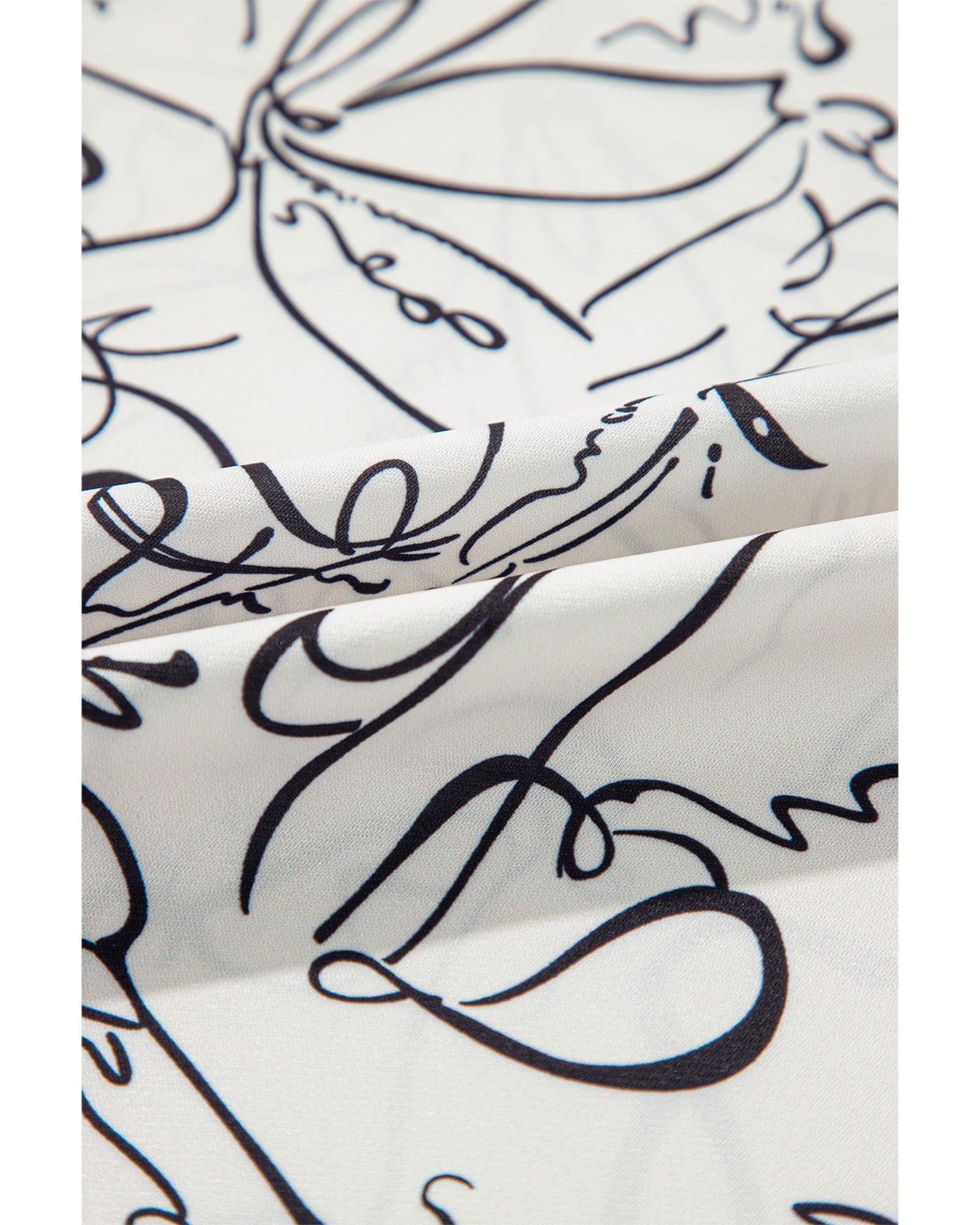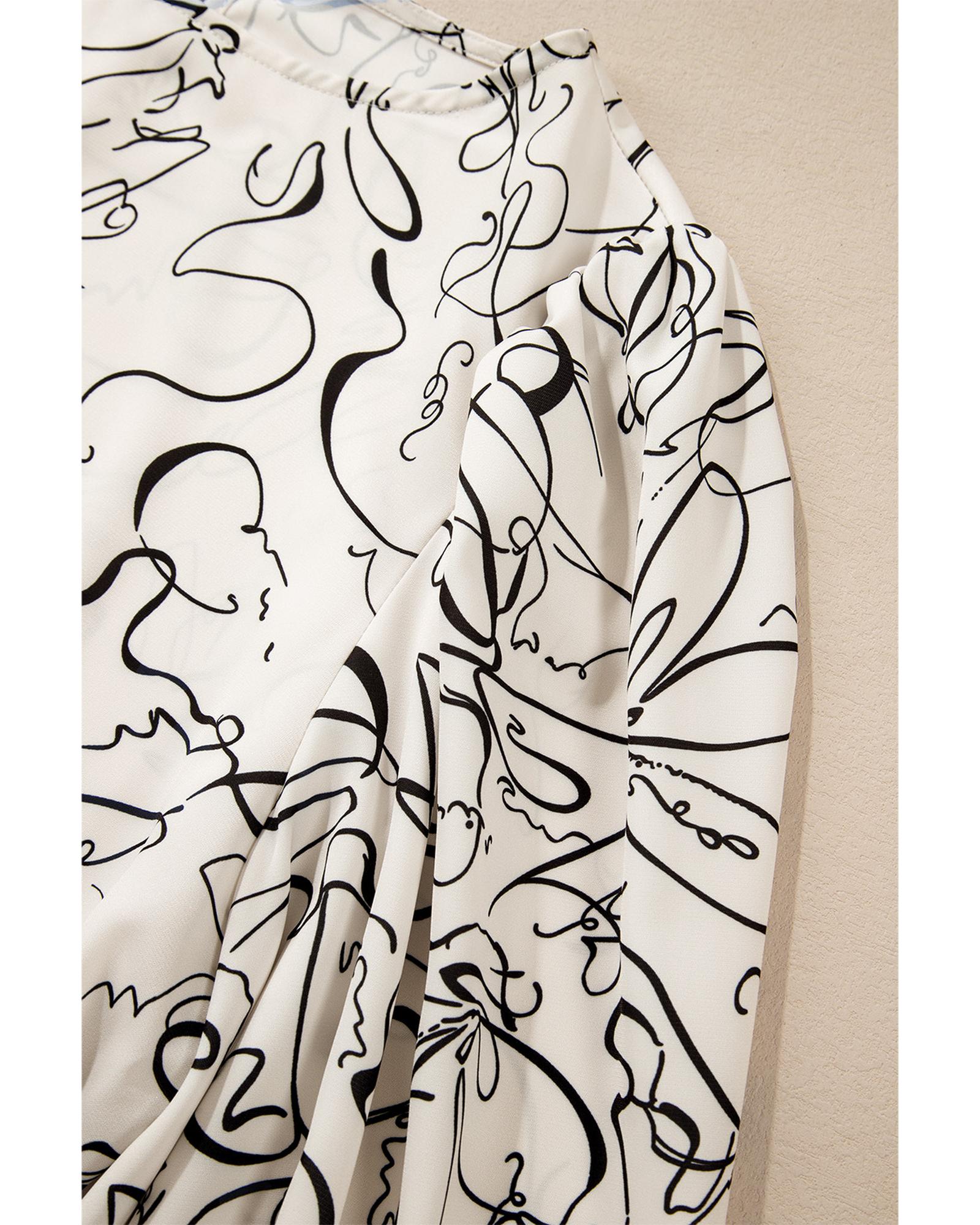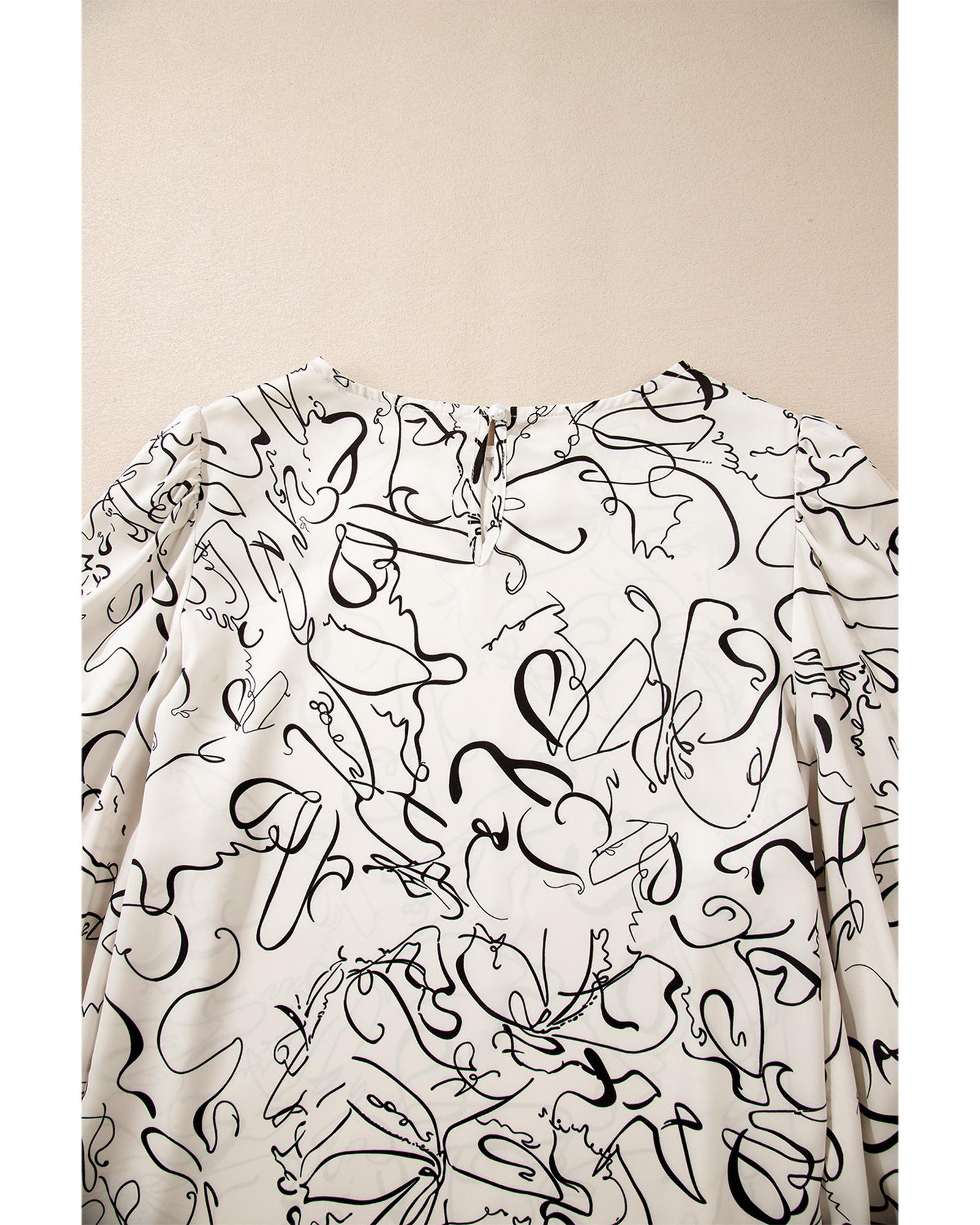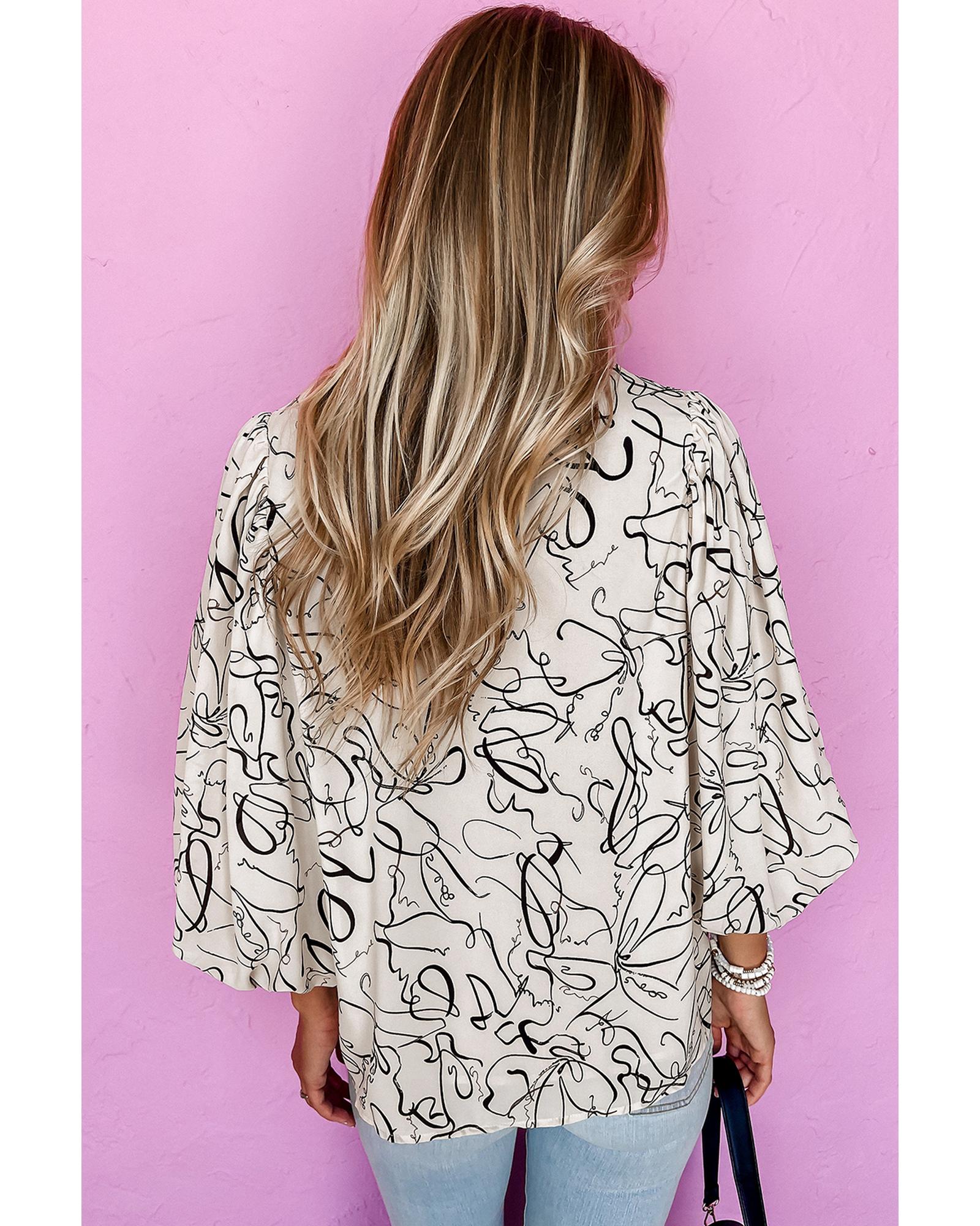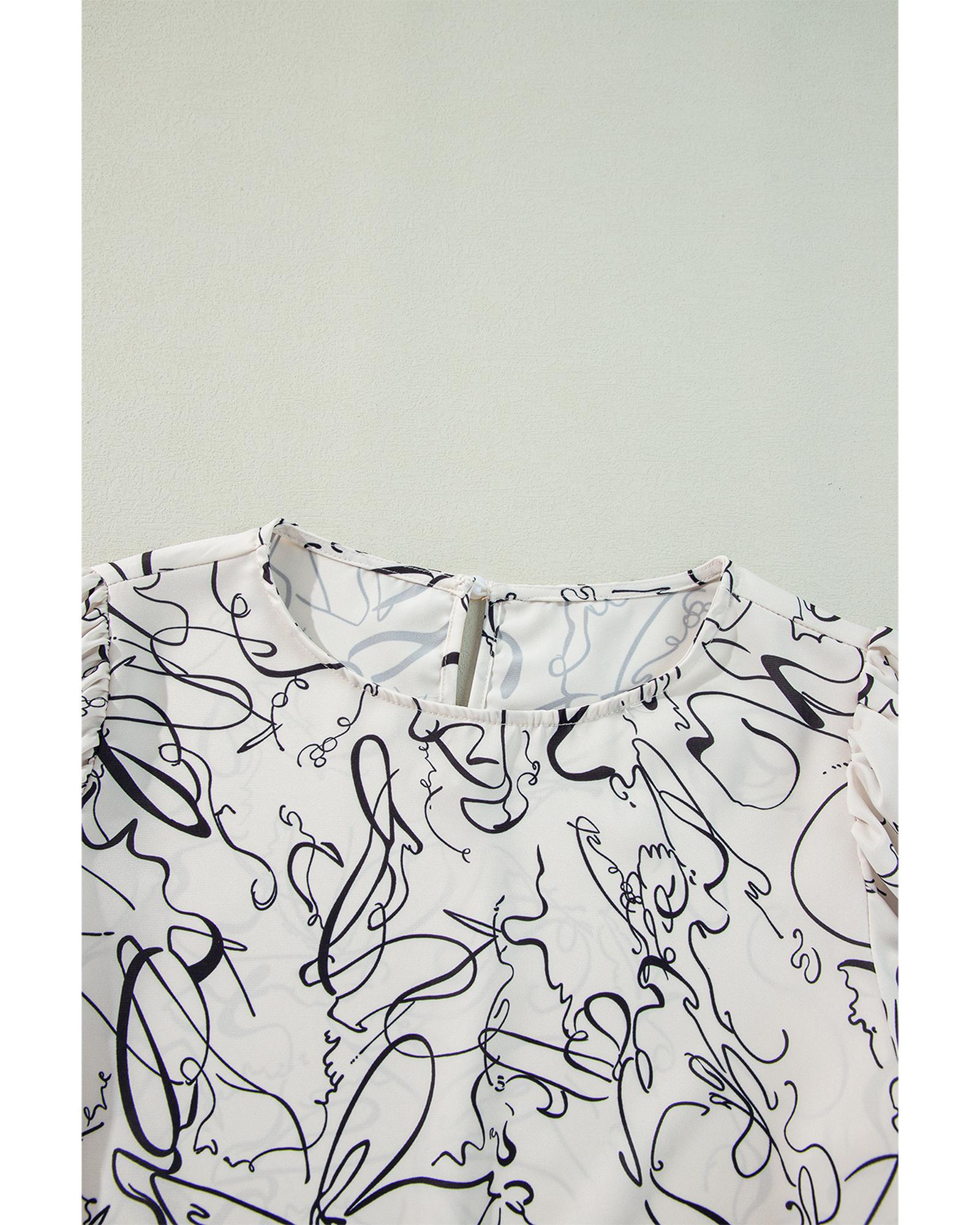 Beige Abstract Print Balloon Sleeve Crew Neck Blouse – XL