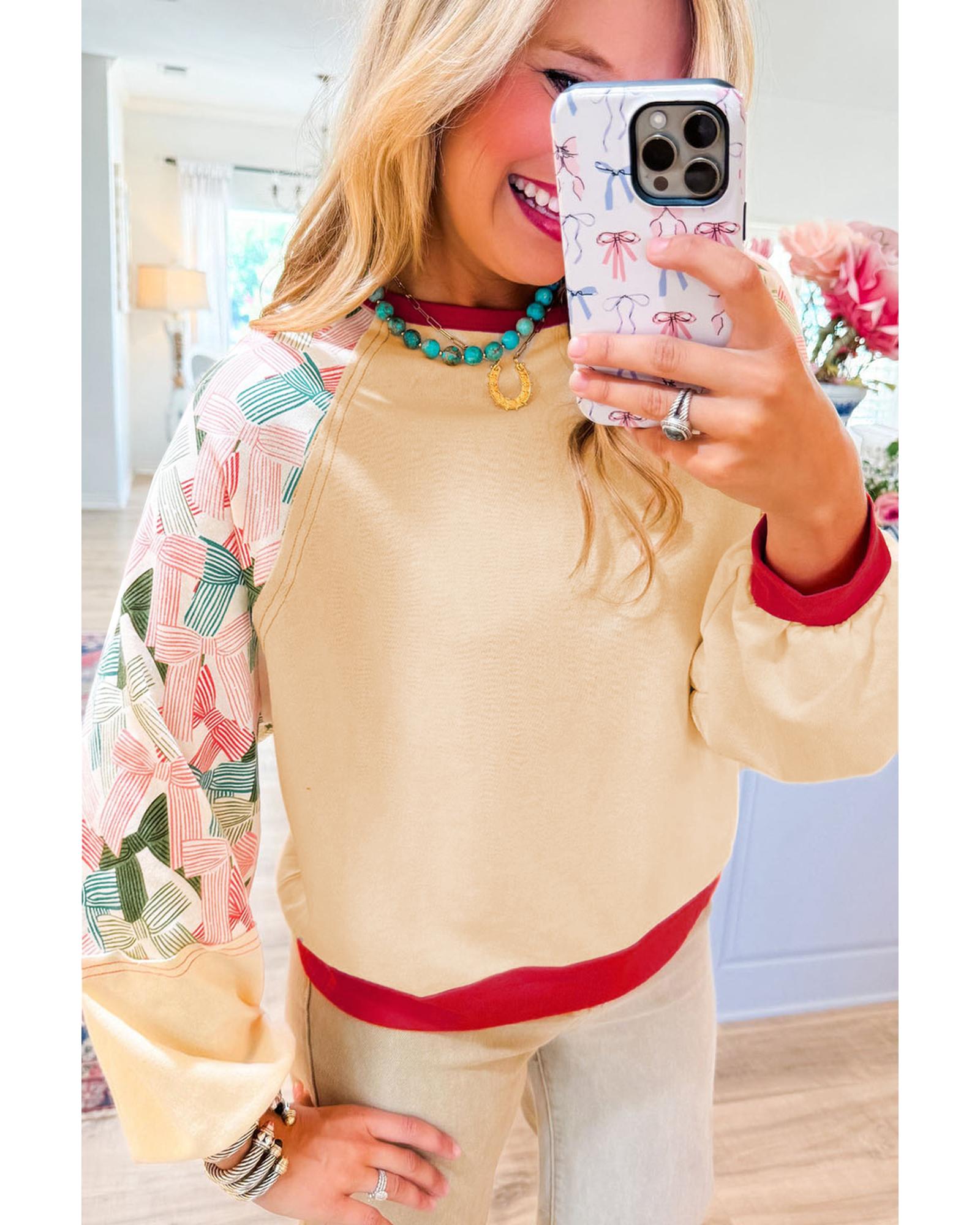 Beige Bowknot Printed Patchwork Raglan Sleeve Colorblock Edge Top – XL