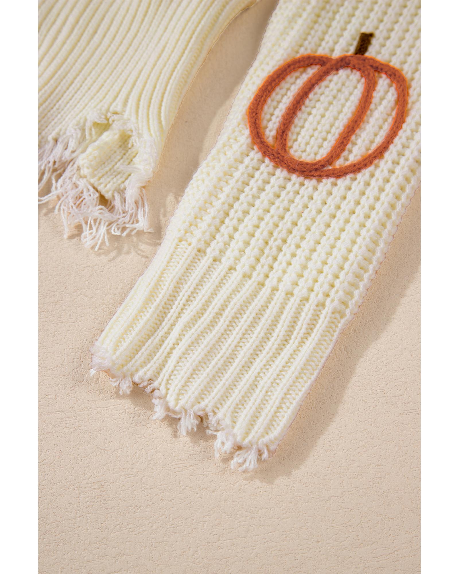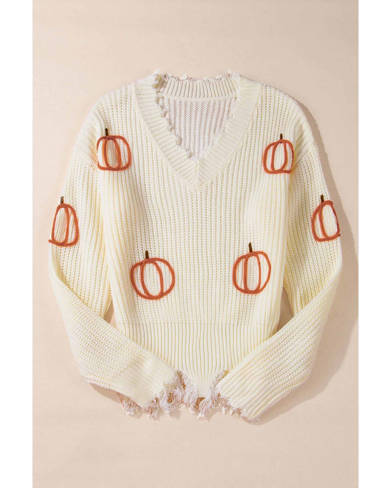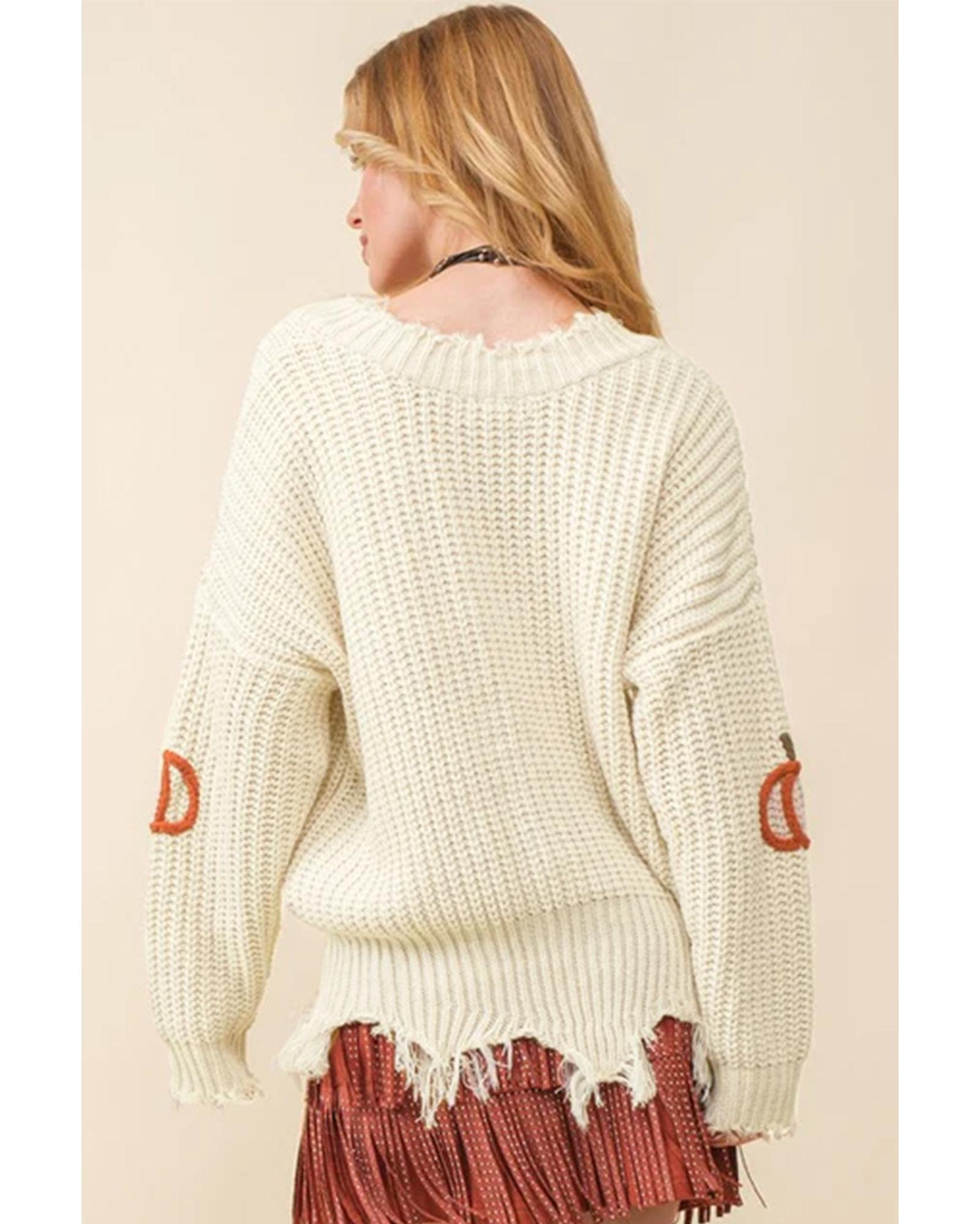 Beige Cable Knit Pumpkin Raw Hem V Neck Loose Sweater – L