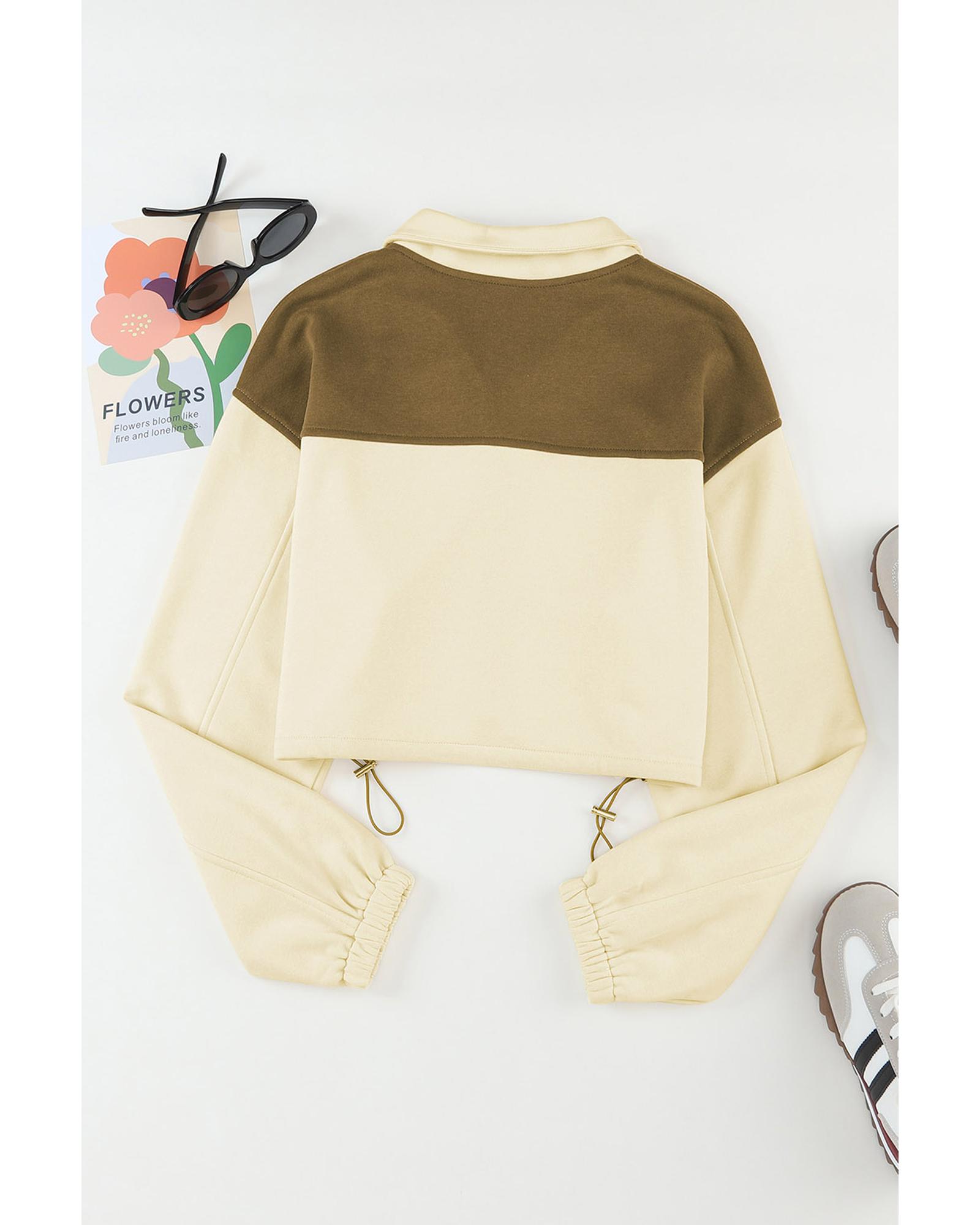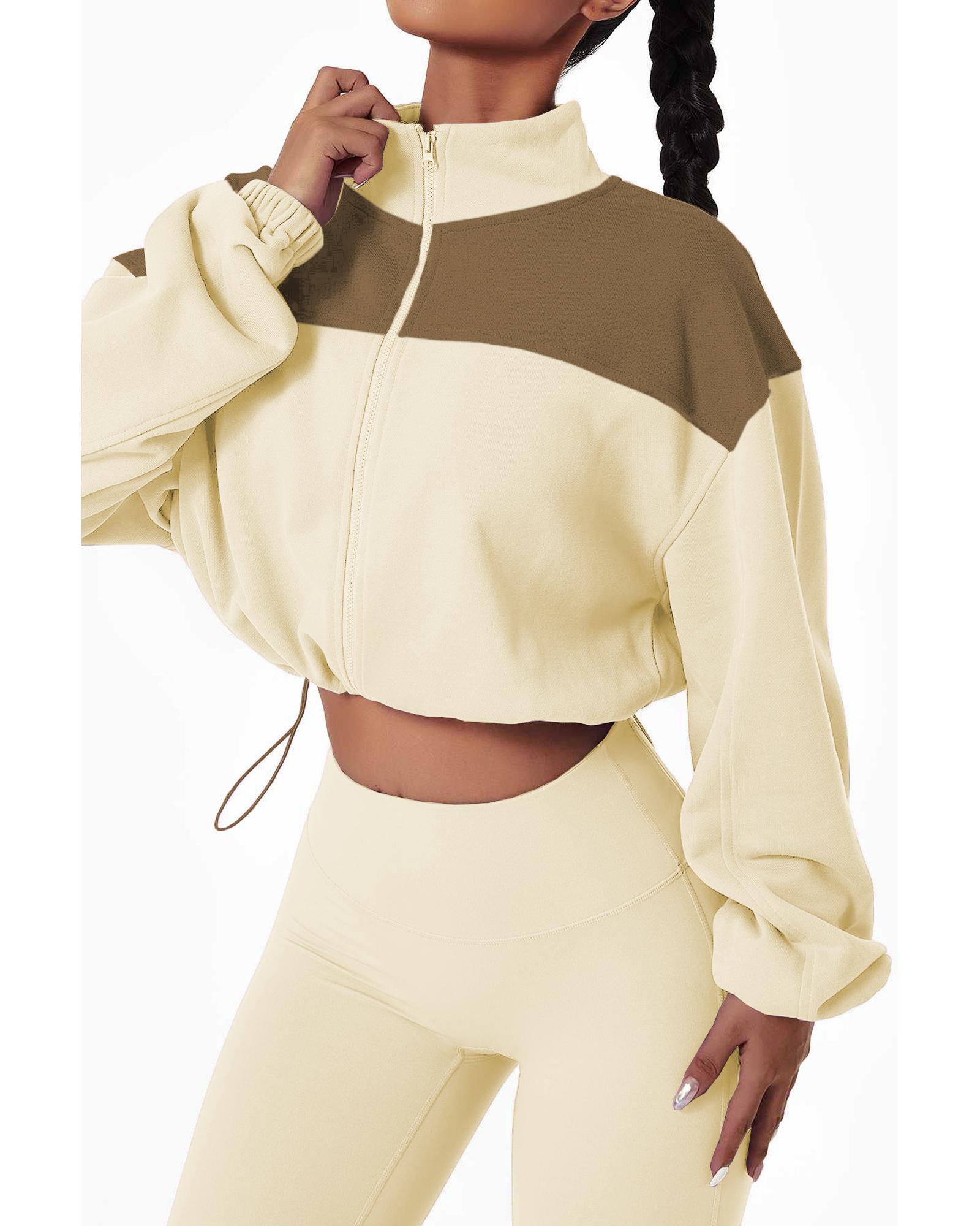 Beige Color Block Drawstring Cropped Athleisure Jacket – 2XL