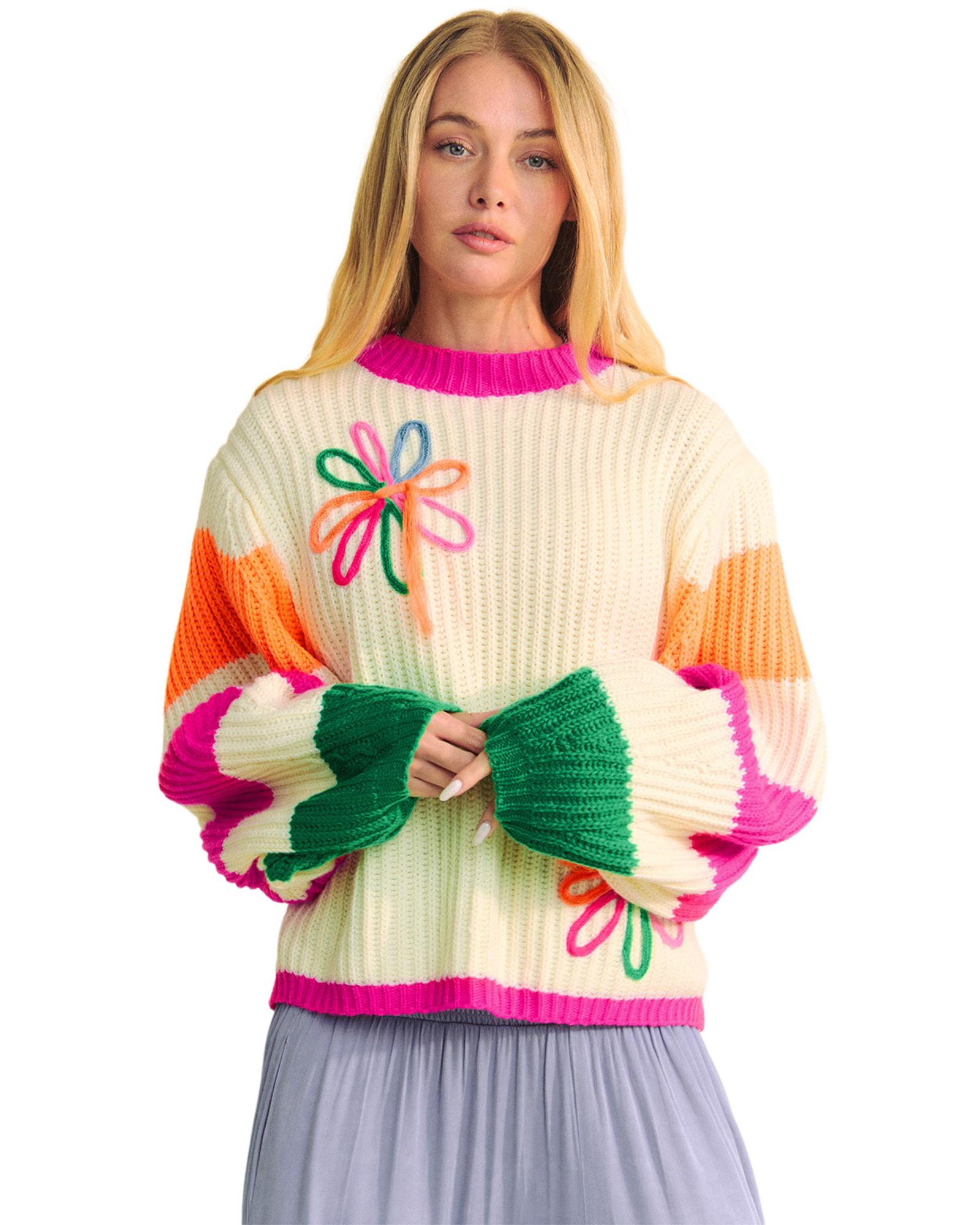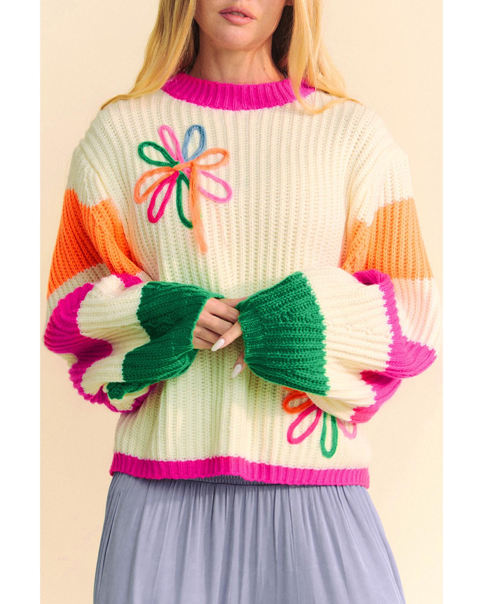 Beige Colorblock Flower Print Cable Knit Loose Sweater – L