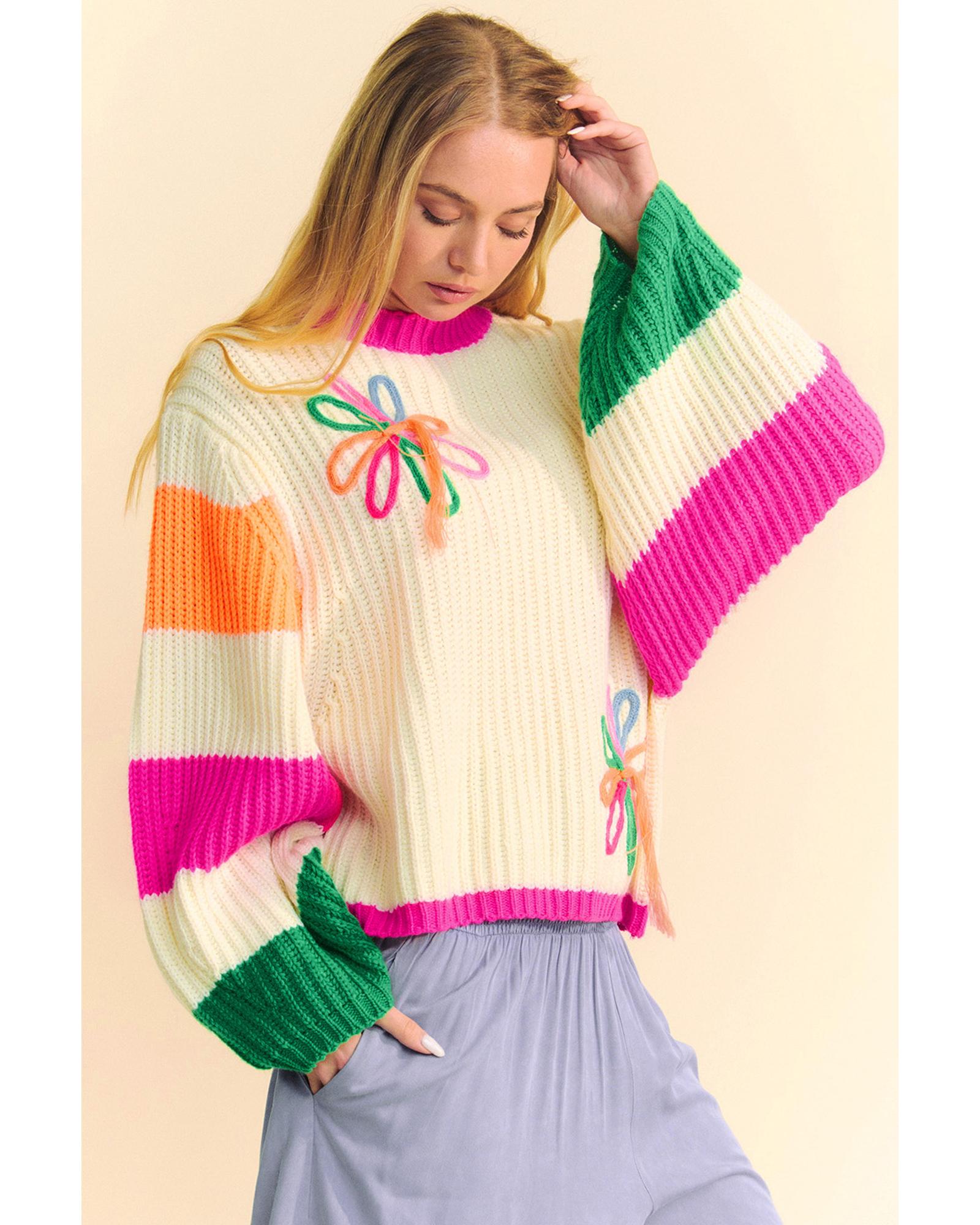 Beige Colorblock Flower Print Cable Knit Loose Sweater – XL
