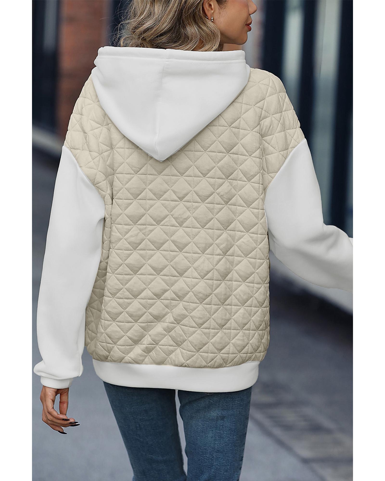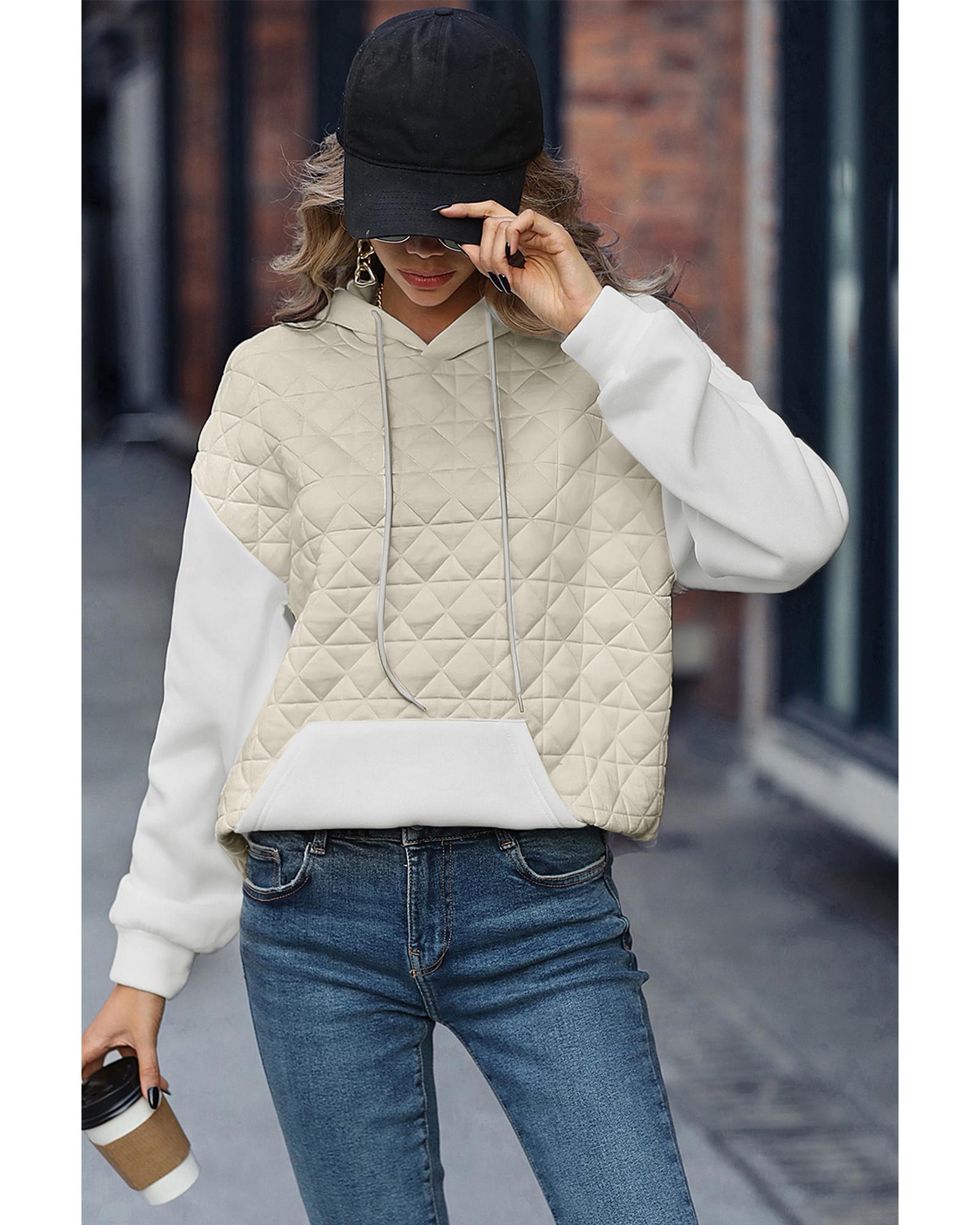 Beige Drop Shoulder Quilted Patchwork Kangaroo Pocket Hoodie – XL