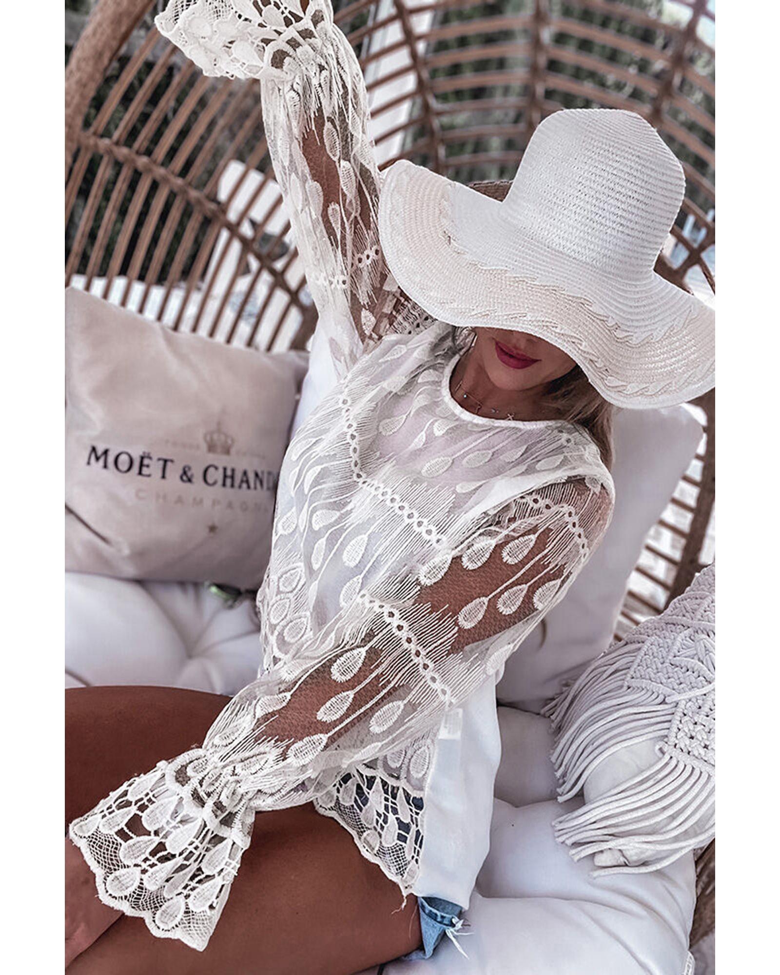 Beige Embroidered Mesh Flounce Sleeve Blouse – S