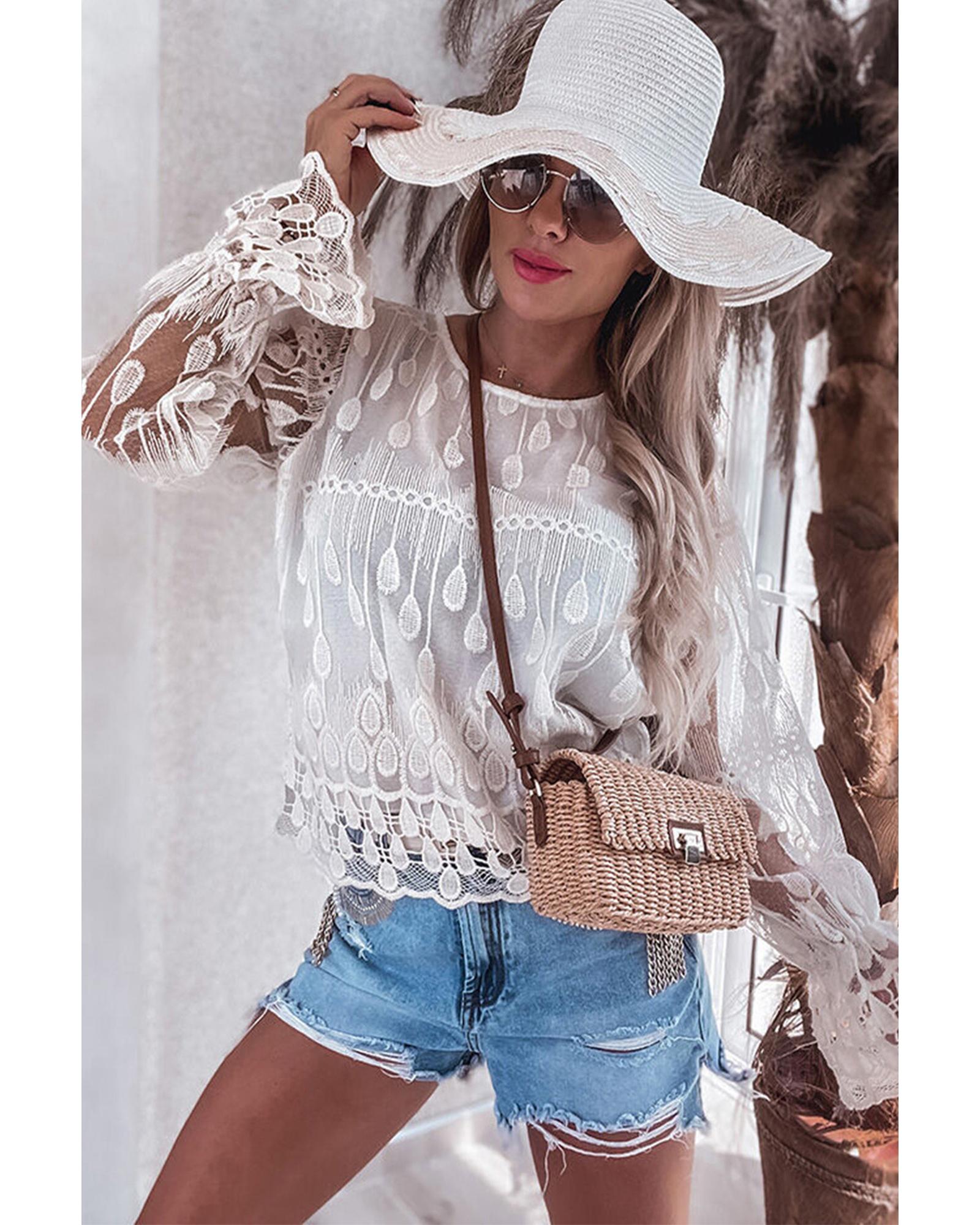 Beige Embroidered Mesh Flounce Sleeve Blouse – XL