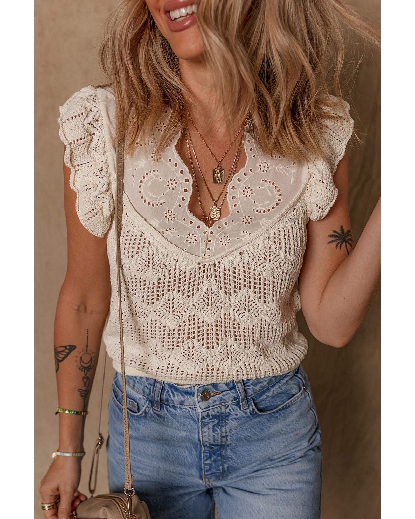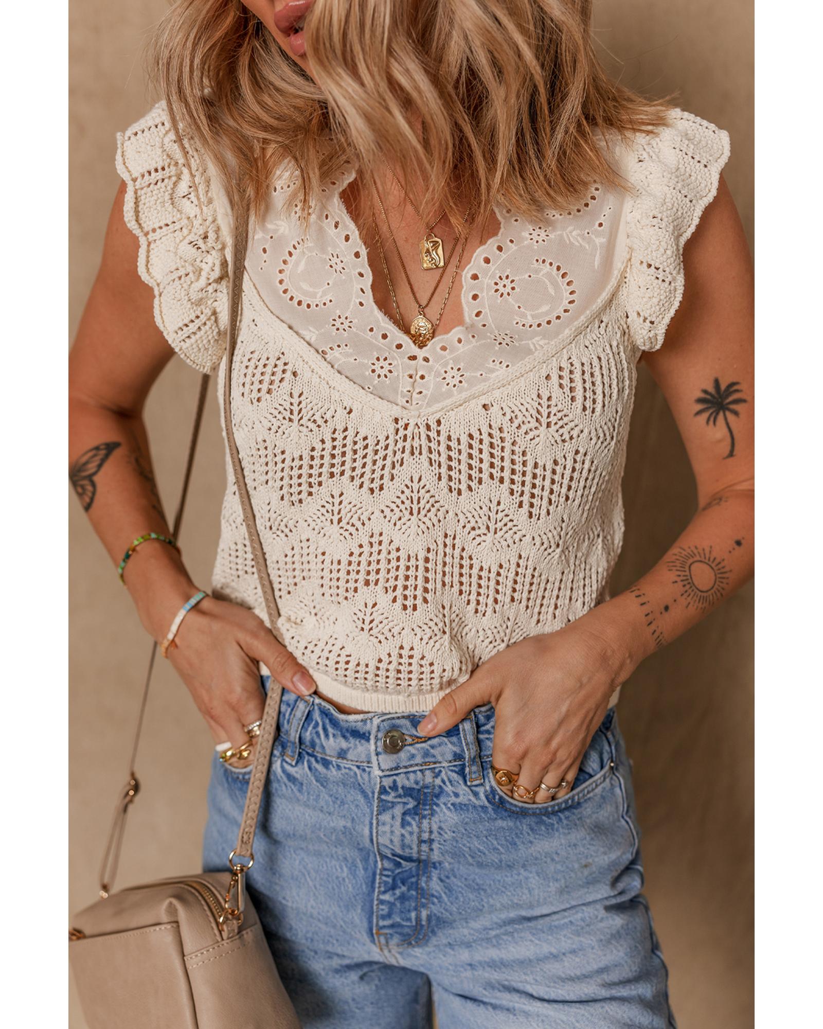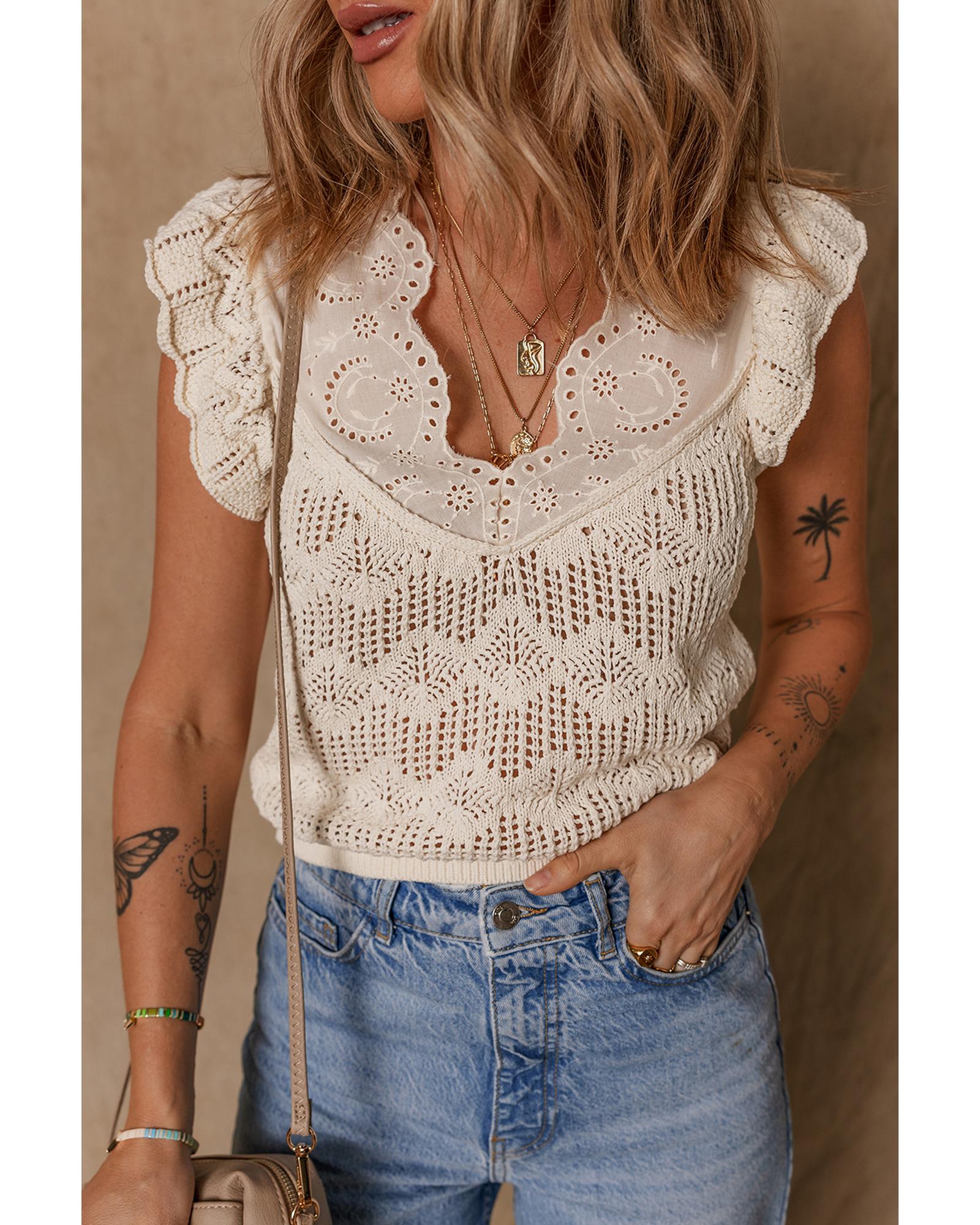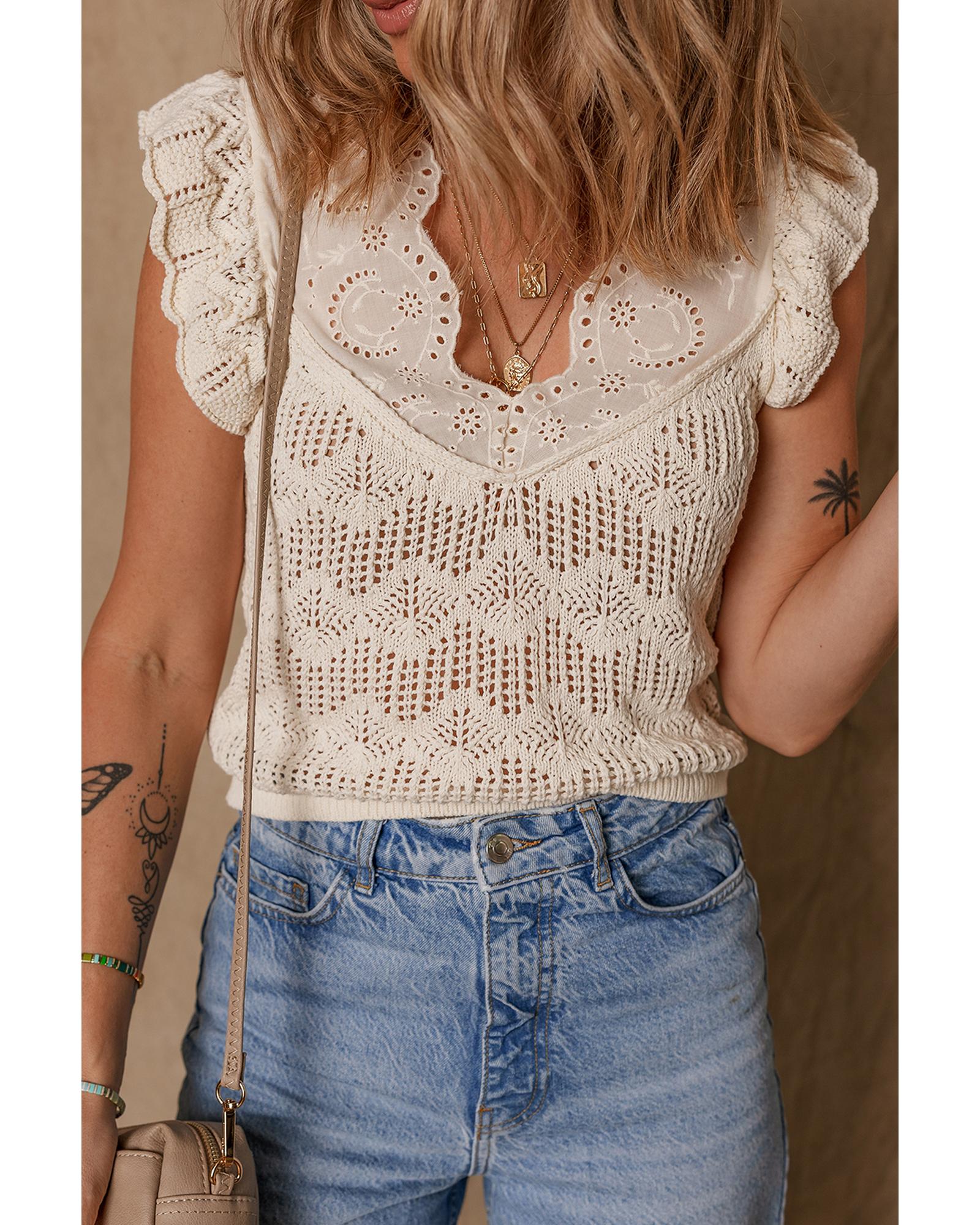 - Beige embroidered patchwork hollow out knitted ruffle sweater vest