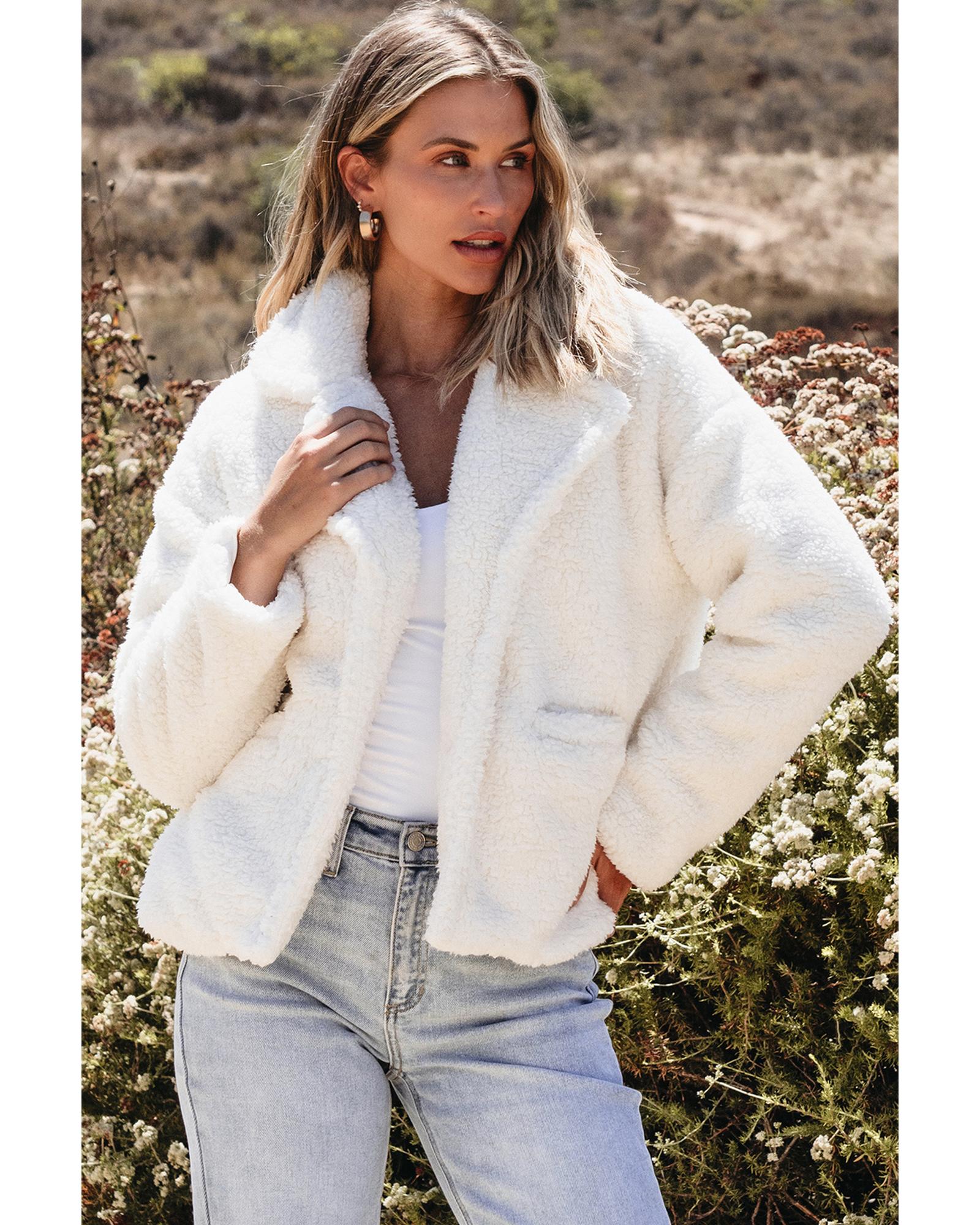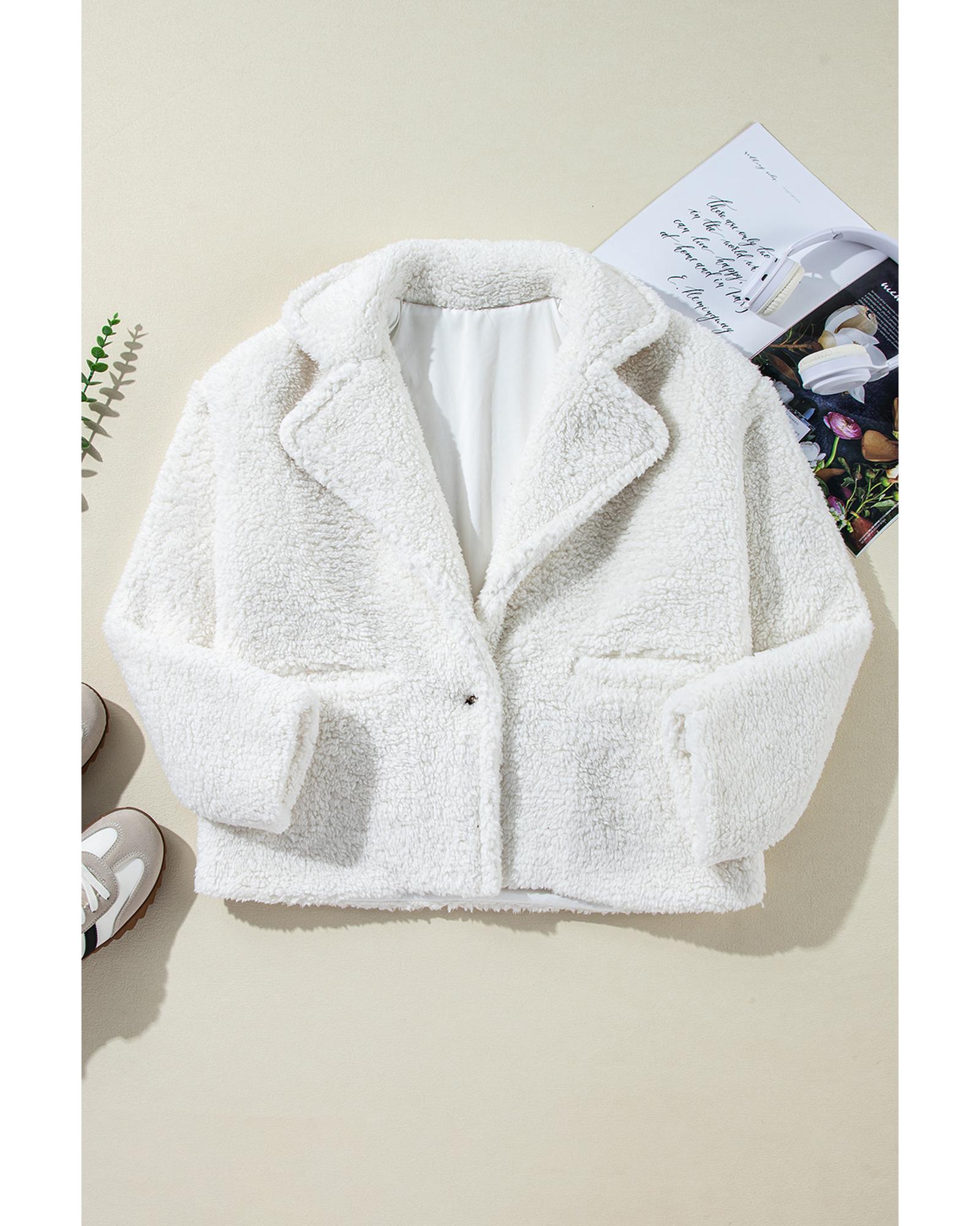 Beige Faux Fur Button Pocketed Lapel Collar Jacket – L
