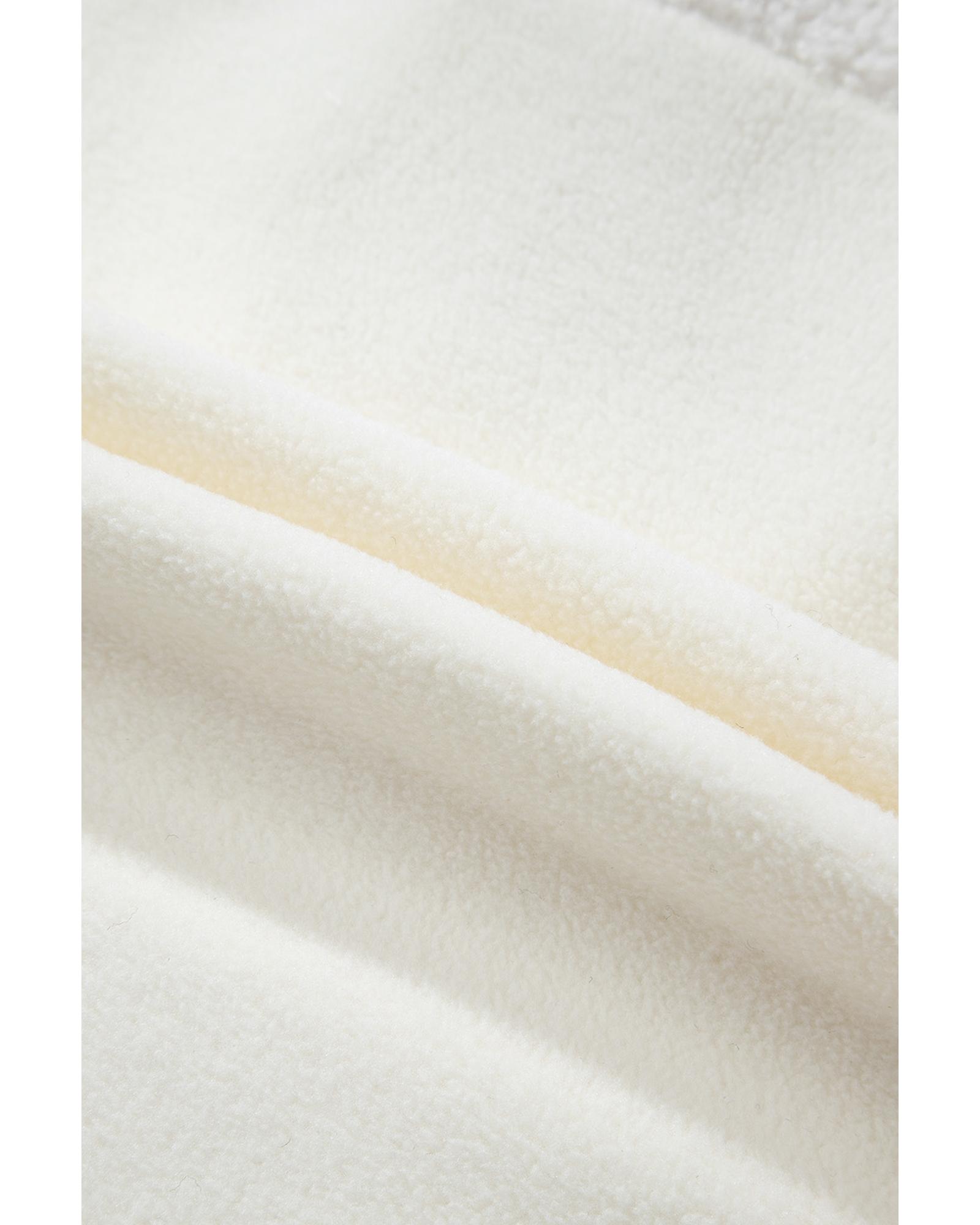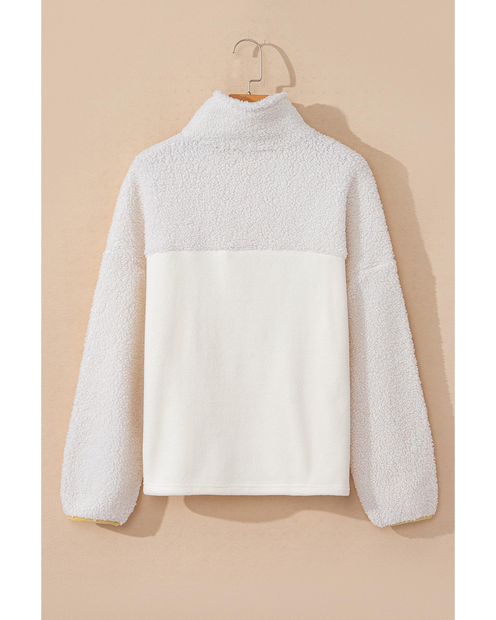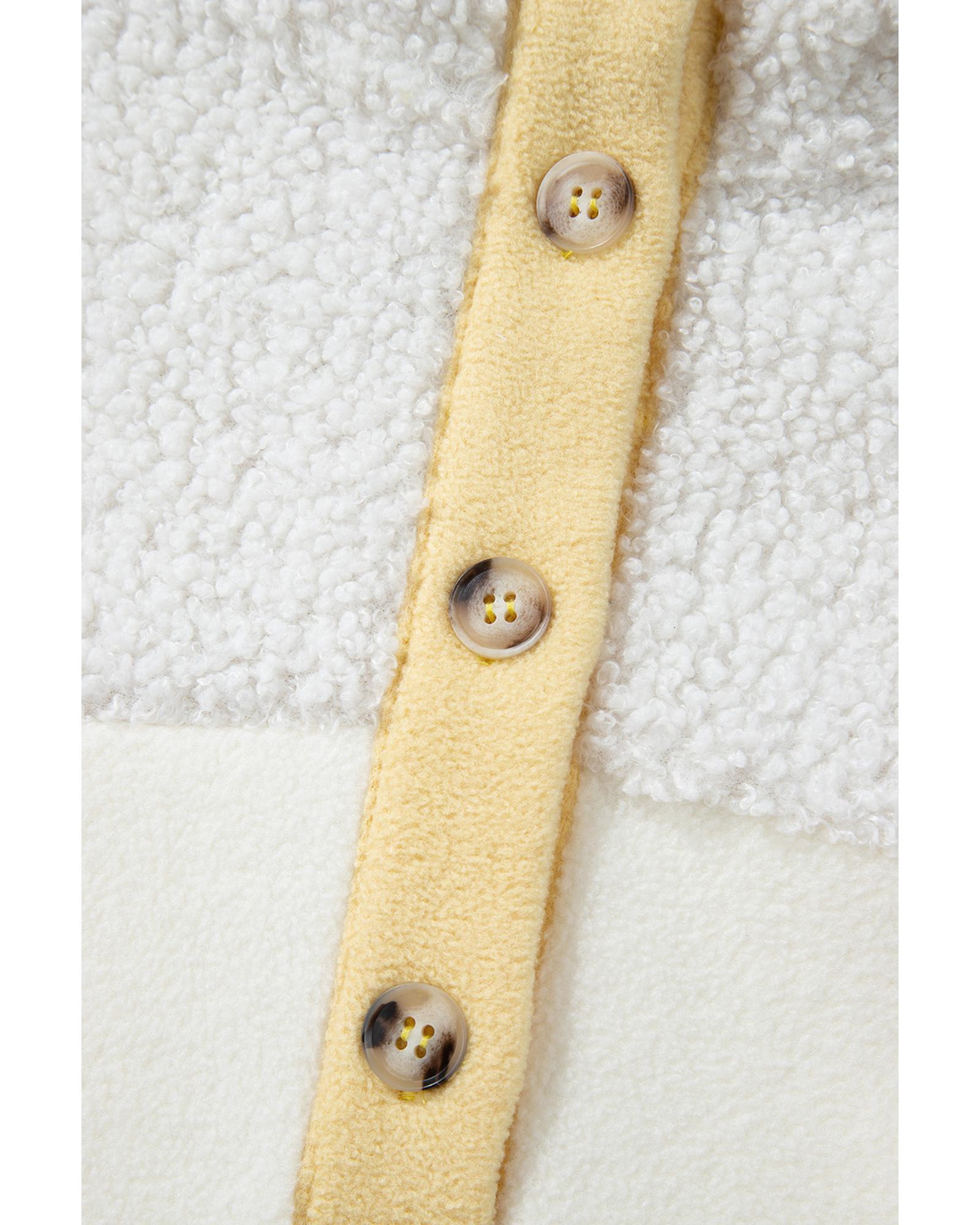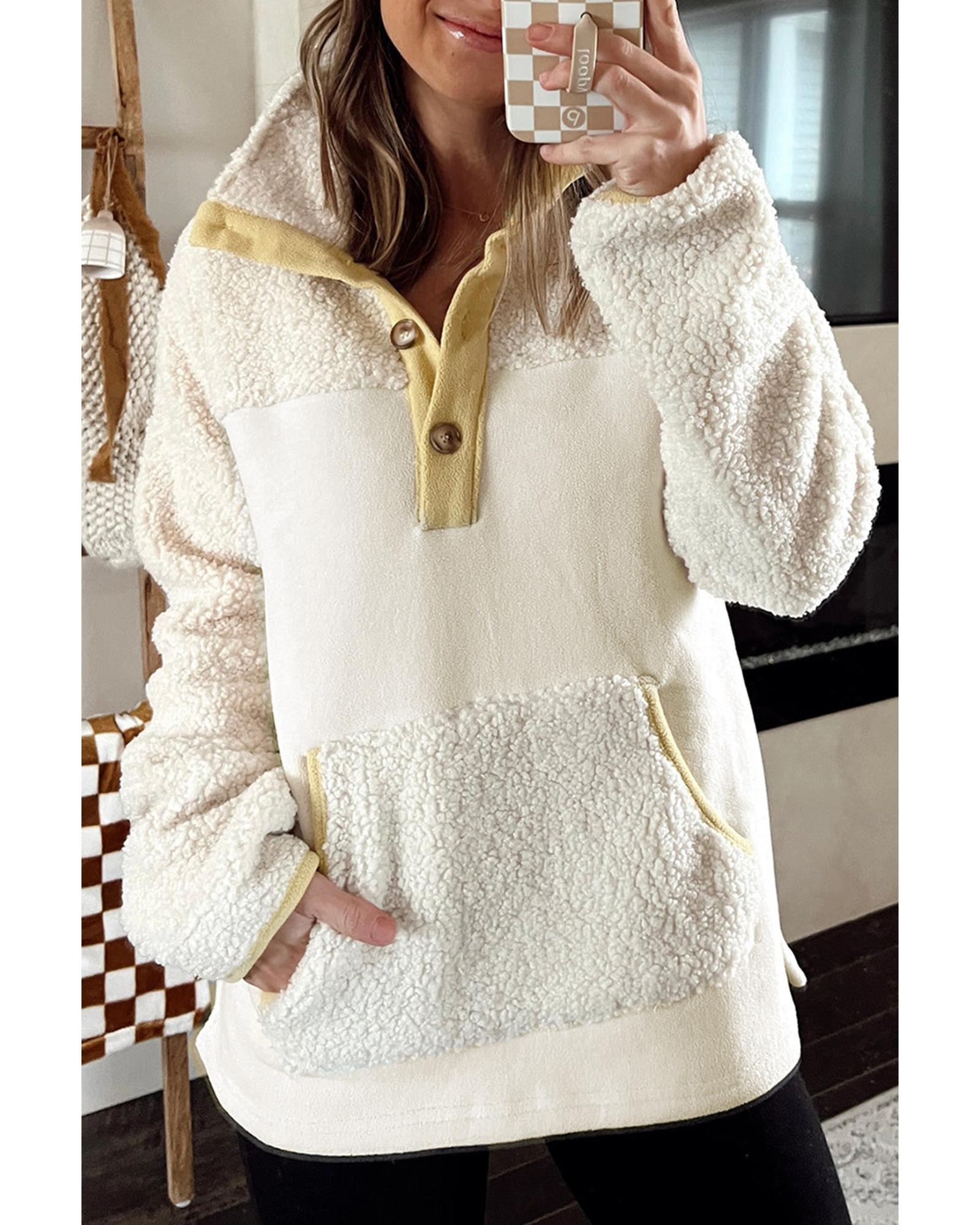 Beige Fleece Colorblock Trim Buttons Collar Sweatshirt with Pocket – L