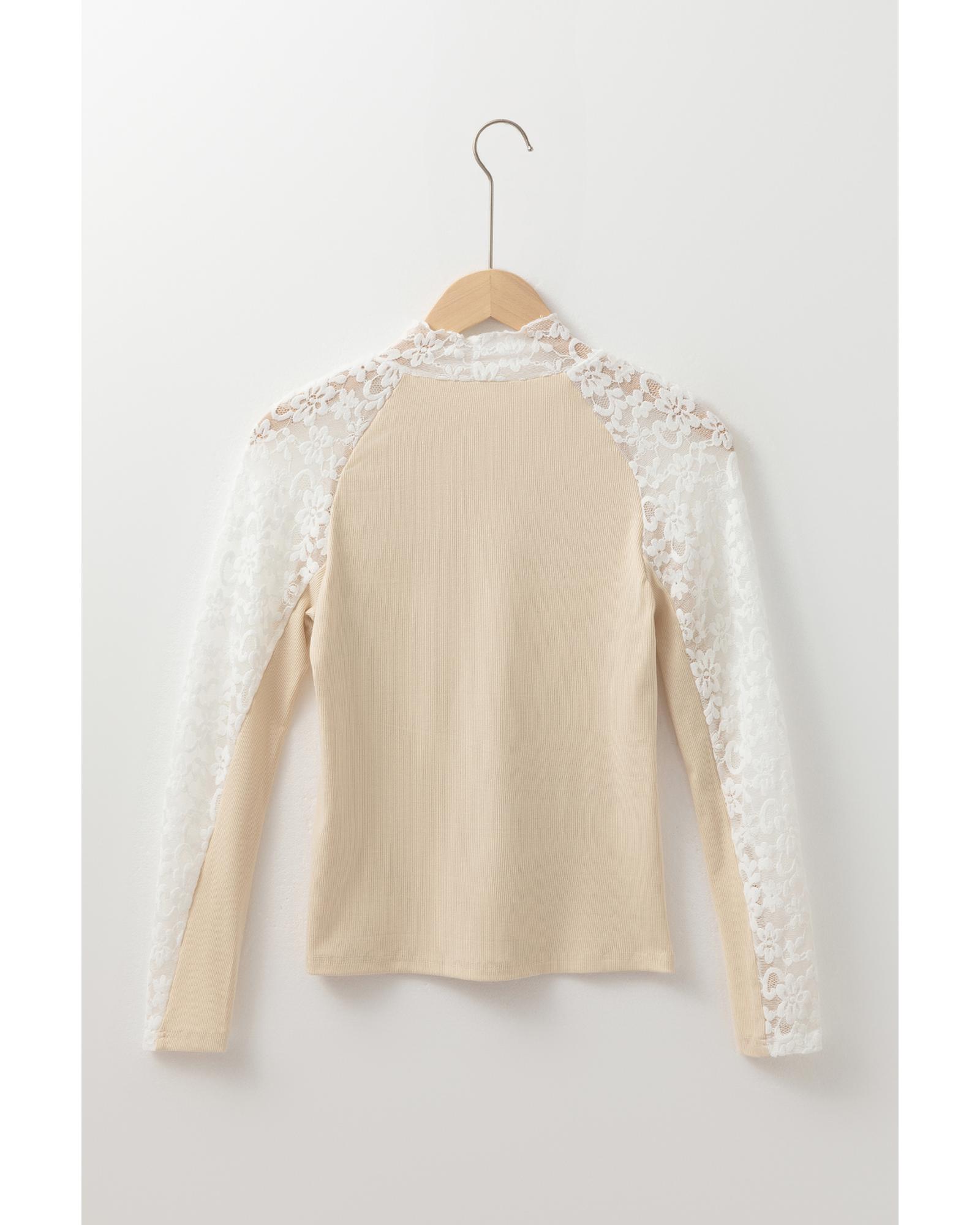 Beige Floral Lace Patchwork Long Sleeve High Neck Slim Top – L