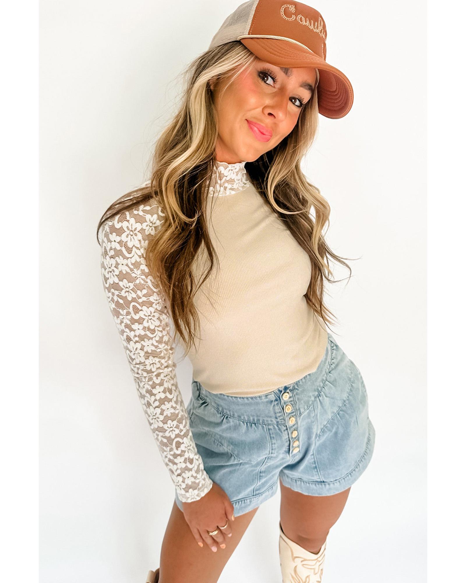 Beige Floral Lace Patchwork Long Sleeve High Neck Slim Top – XL