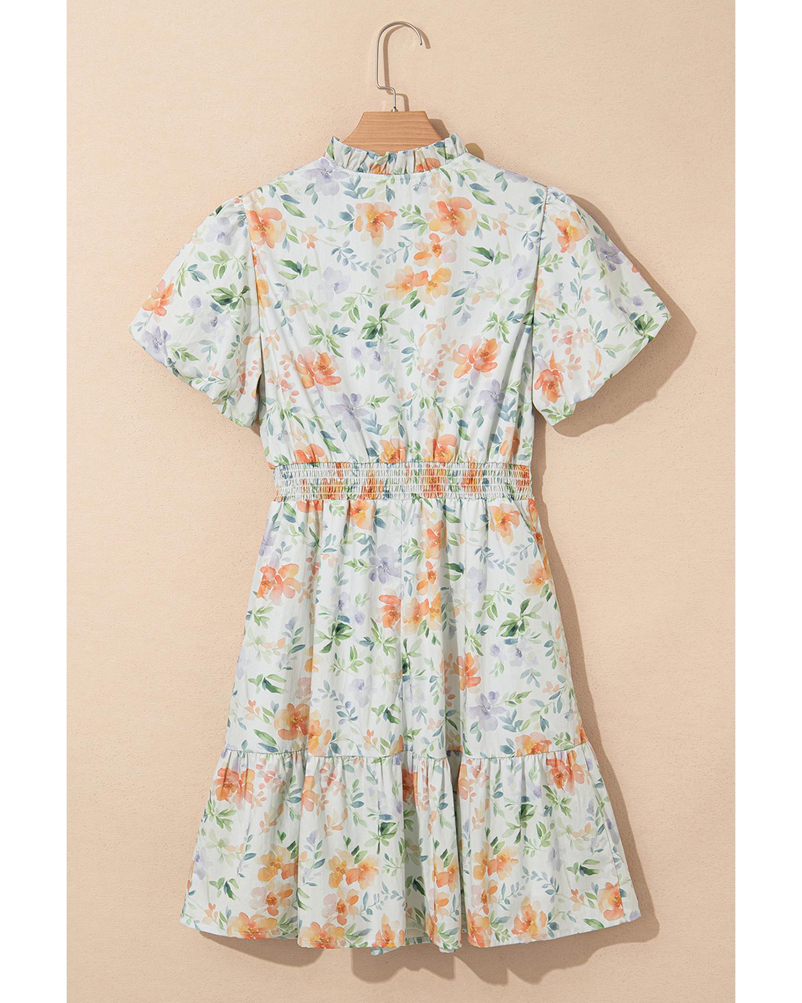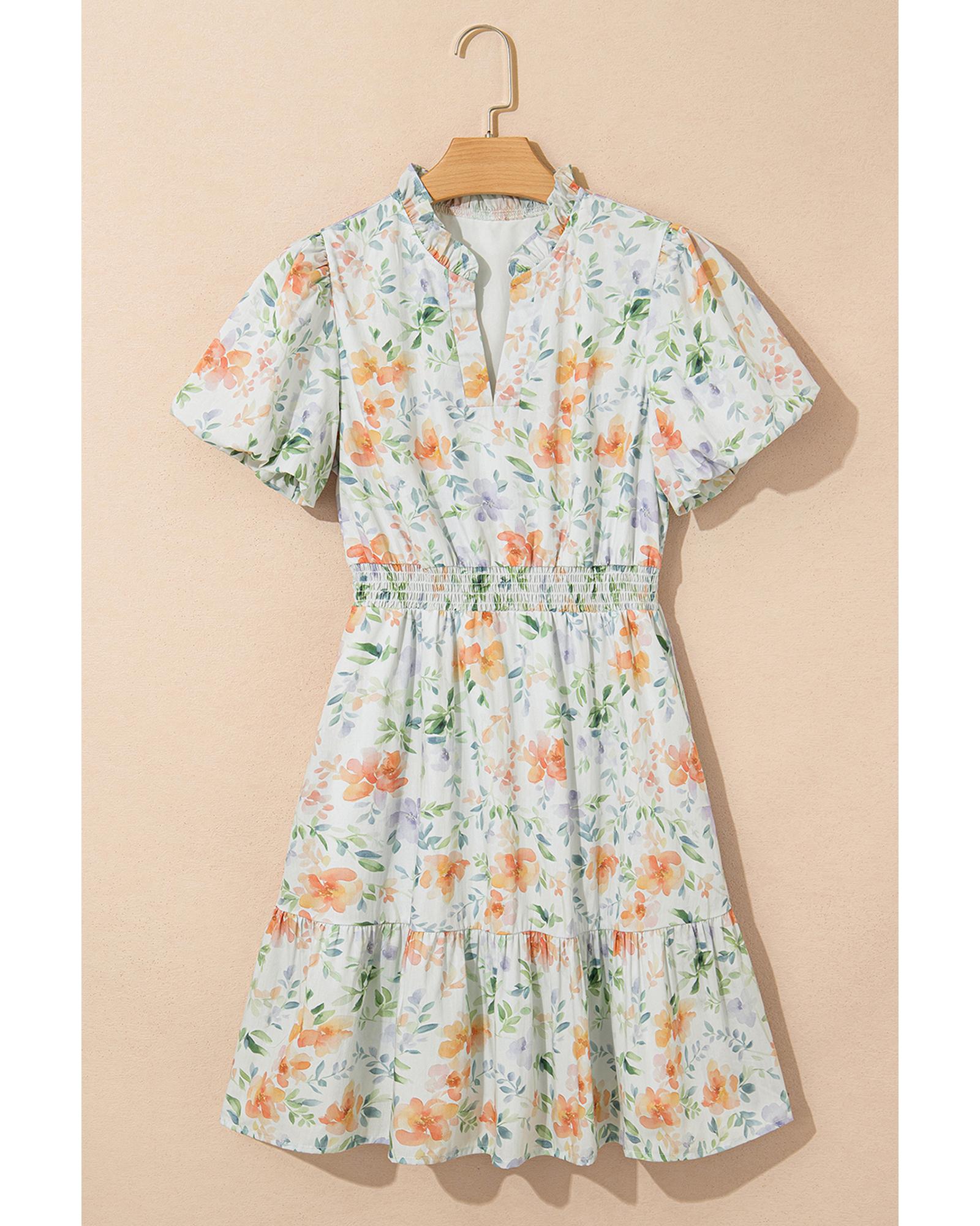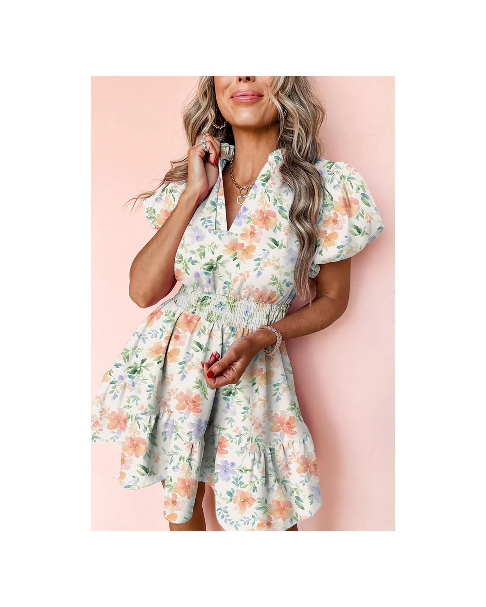 Beige Floral Print Shirred High Waist Puff Sleeve Mini Dress – L