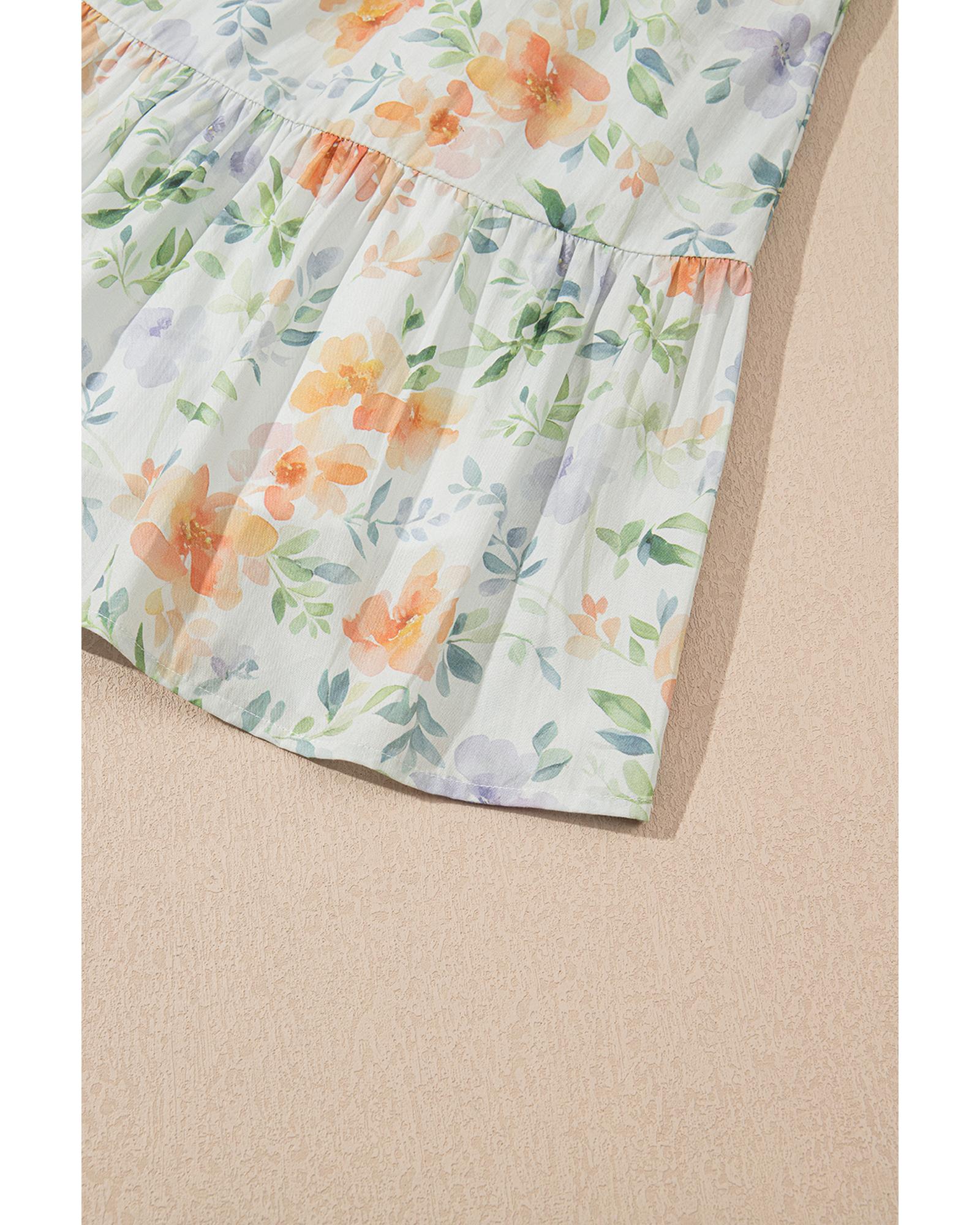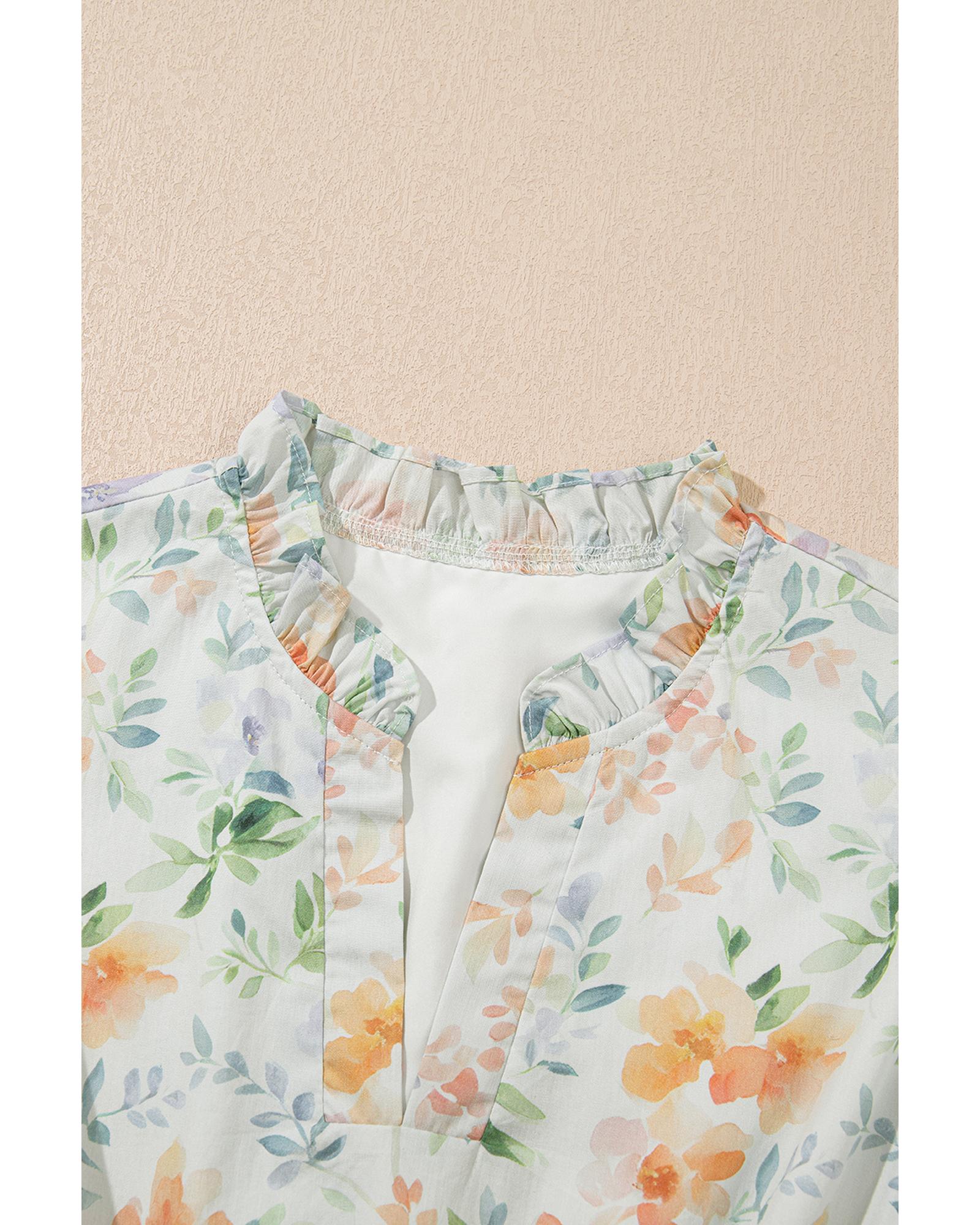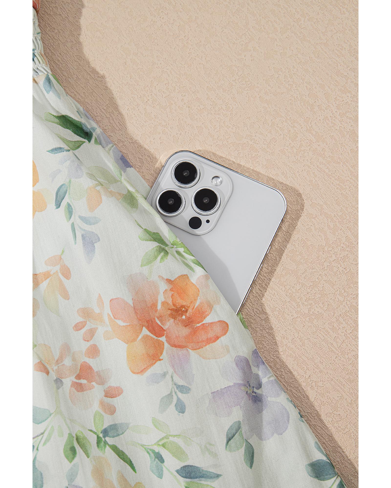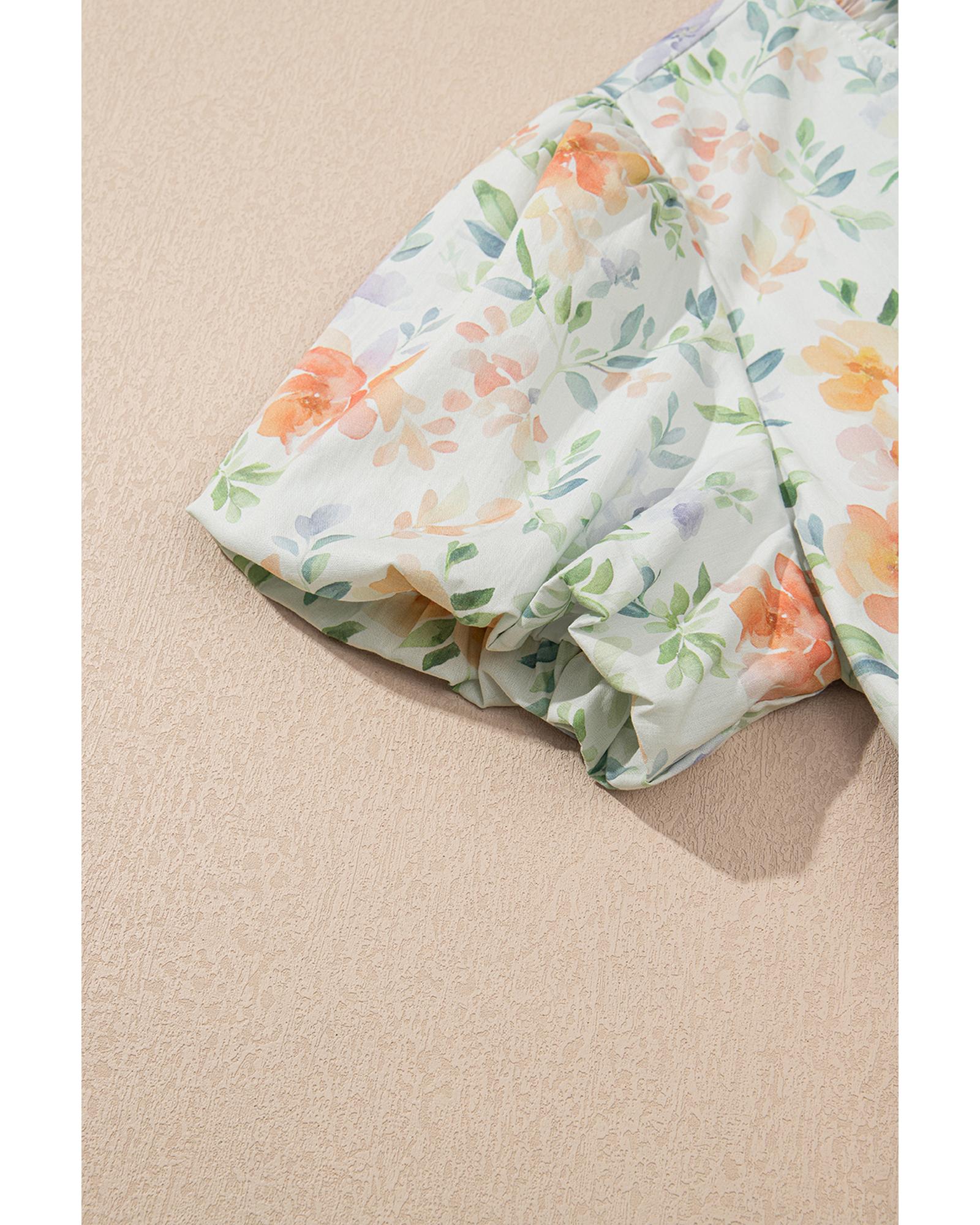 Beige Floral Print Shirred High Waist Puff Sleeve Mini Dress – L