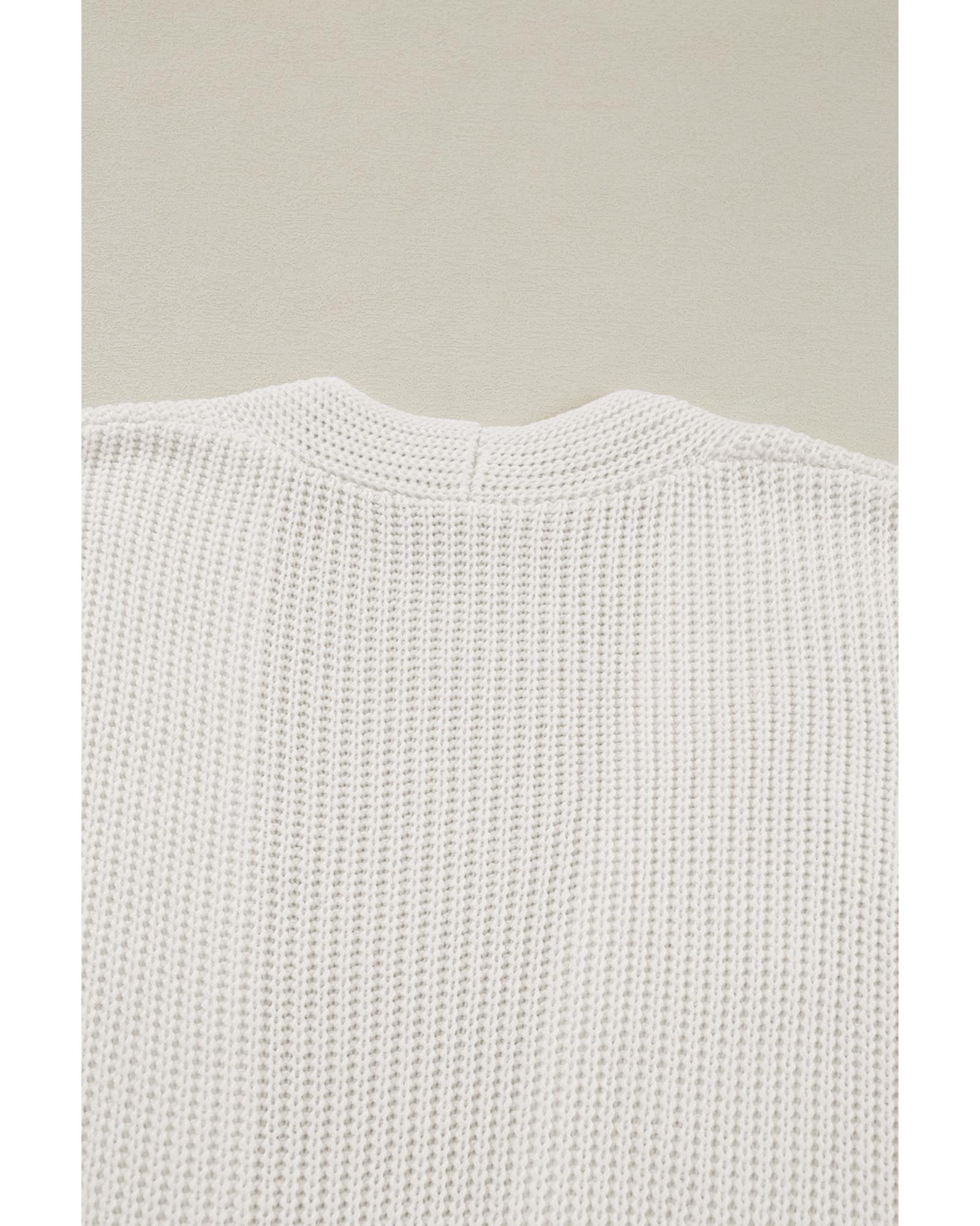 White V neck Drop Shoulder Knitted Sweater - L