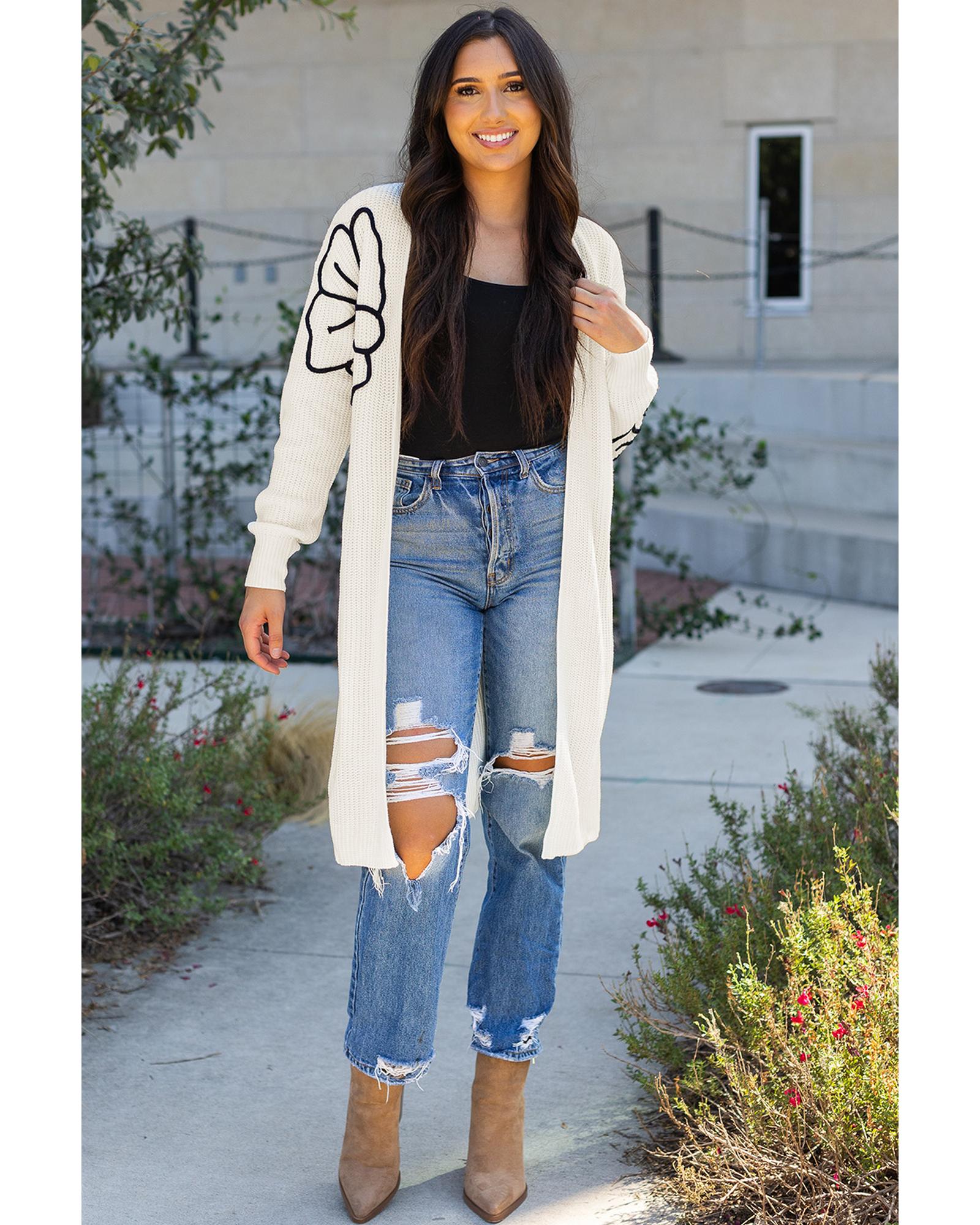 - Beige Flower Embroidered Drop Shoulder Open Front Duster Cardigan