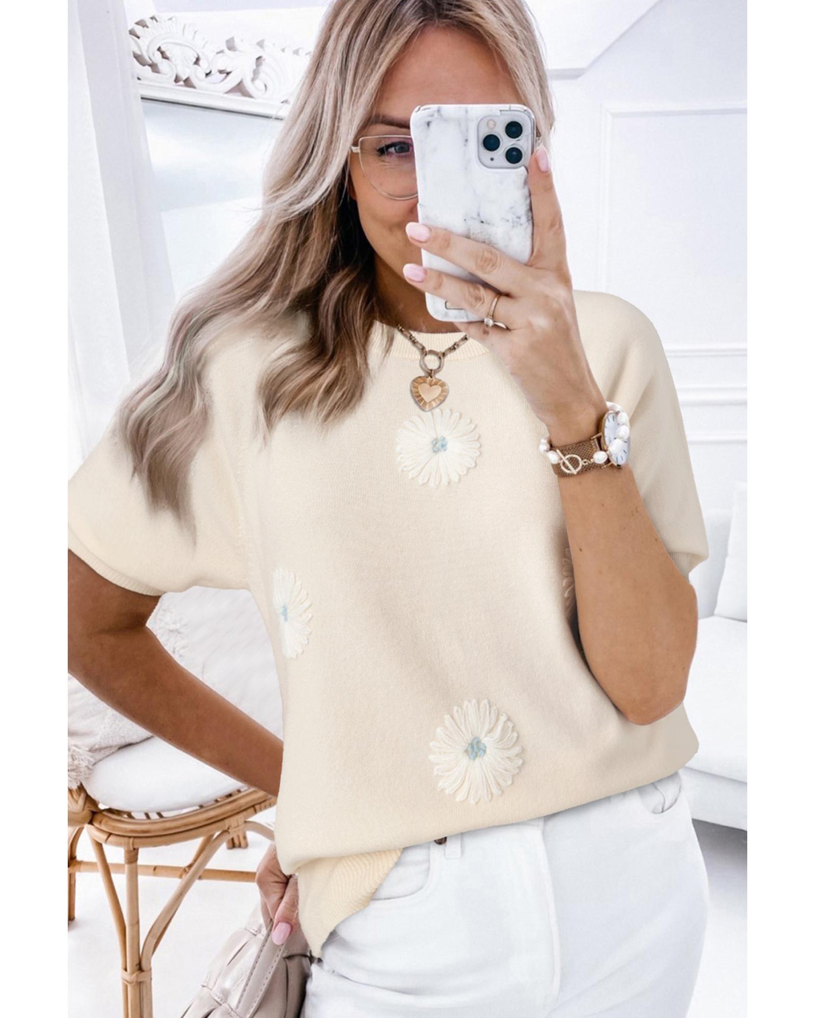 - Beige flower pattern short sleeve knitted top