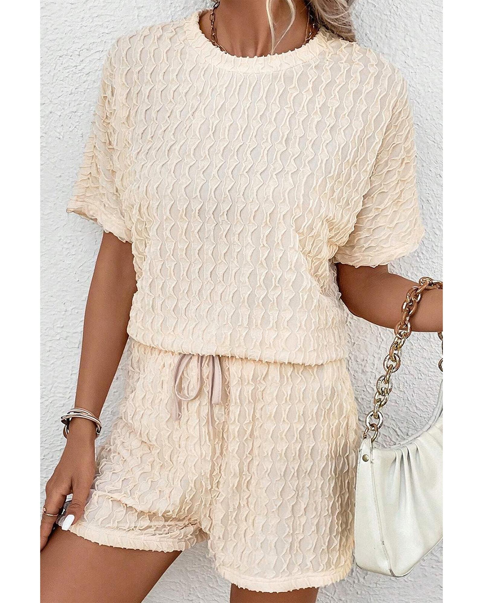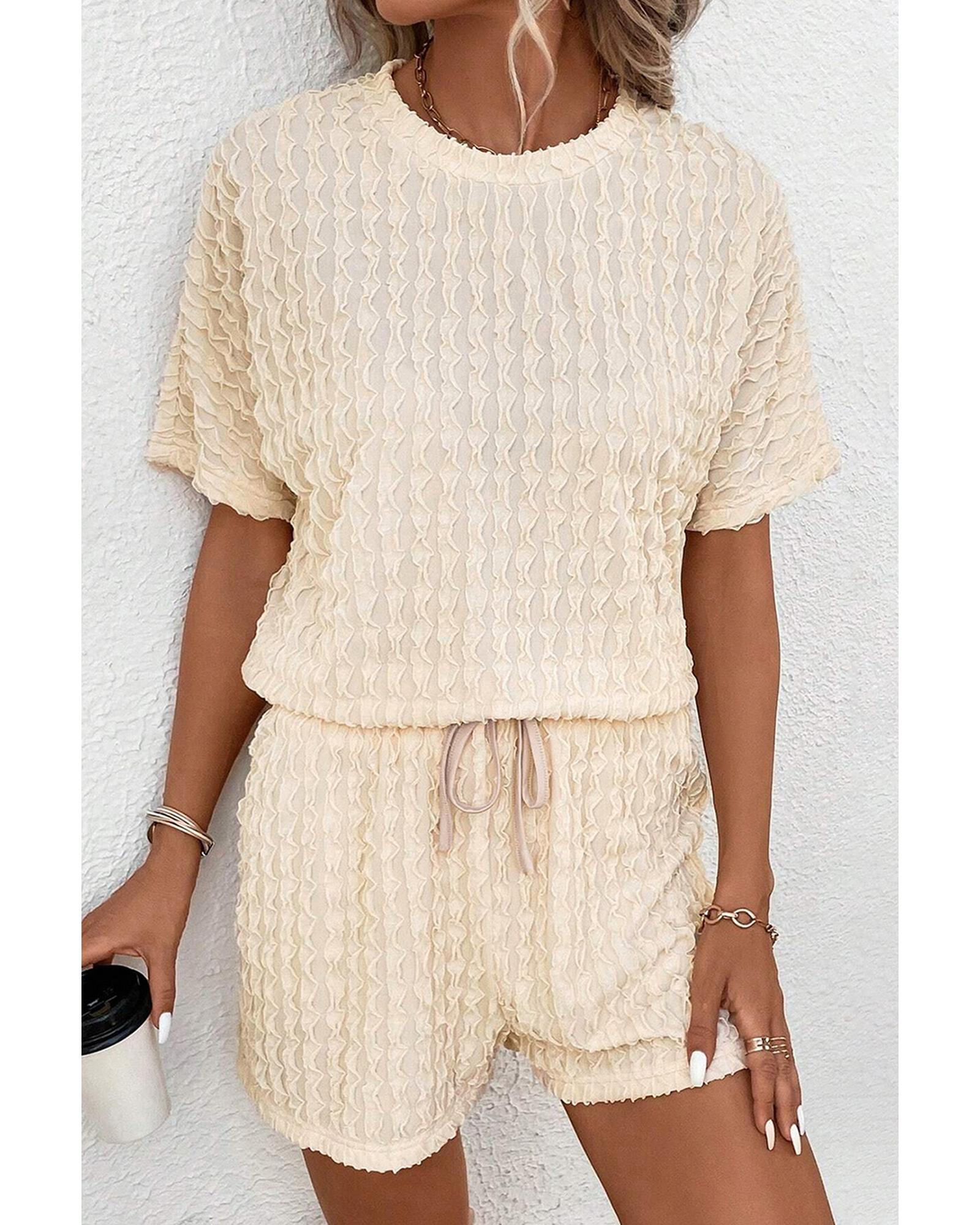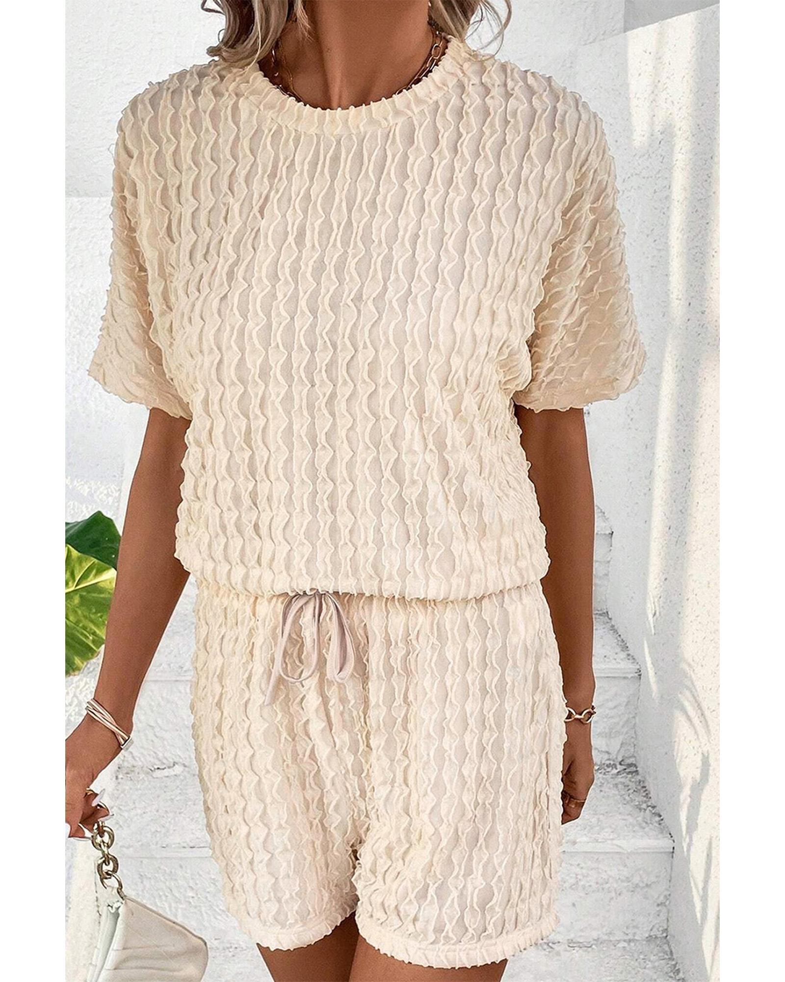 Beige Frill Textured Short Sleeve Top and Drawstring Shorts Set – XL