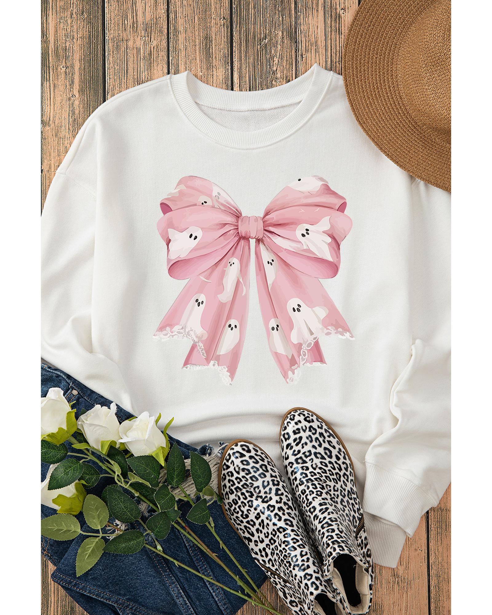 - Beige Ghost Bowknot Graphic Crew Neck Drop Shoulder Sweatshirt