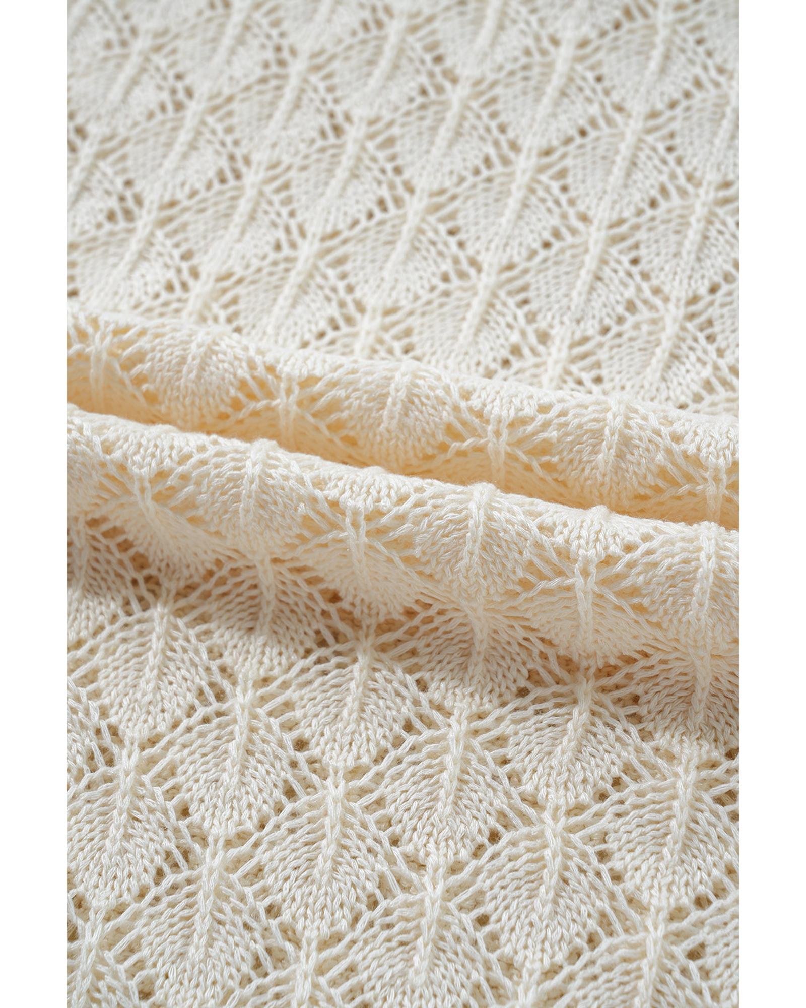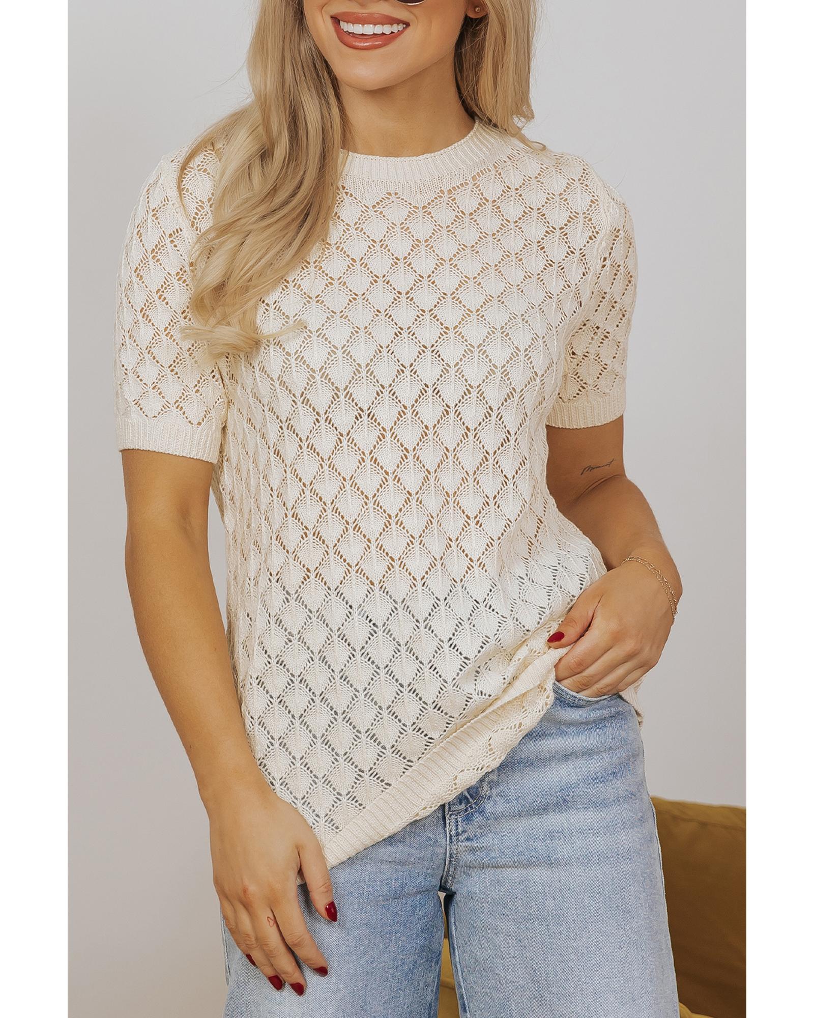 - Beige Hollow Out Crochet O Neck Short Sleeve Sweater Tee