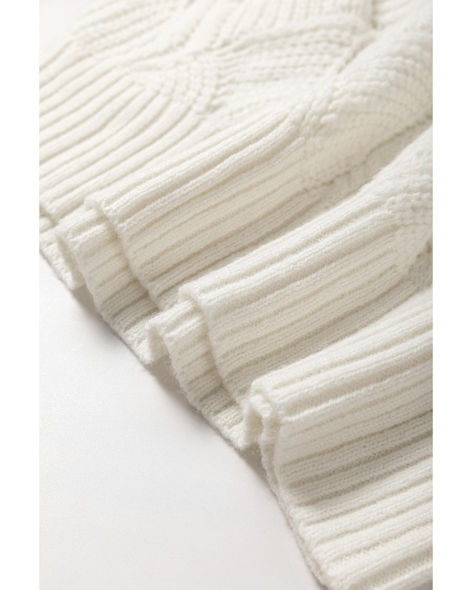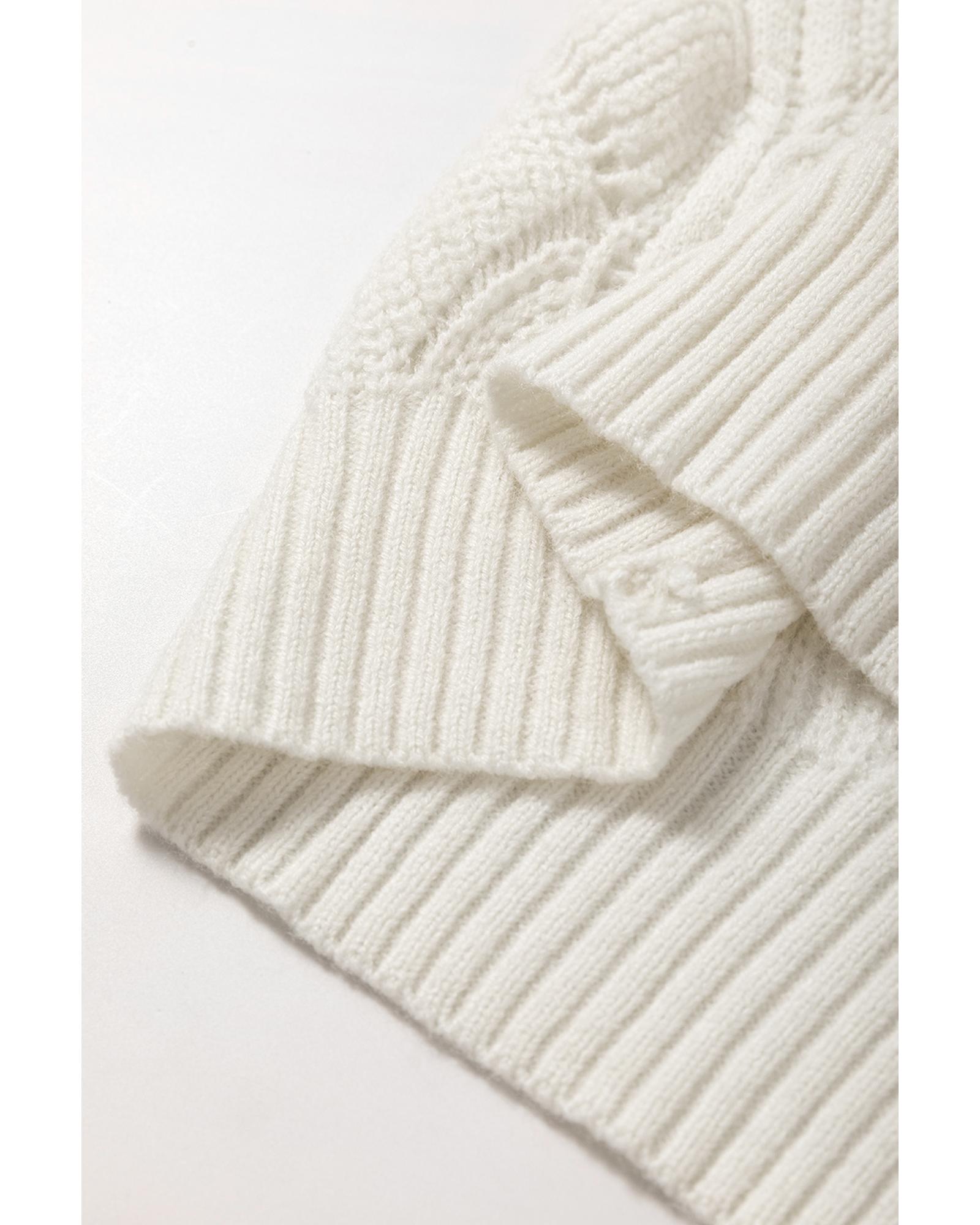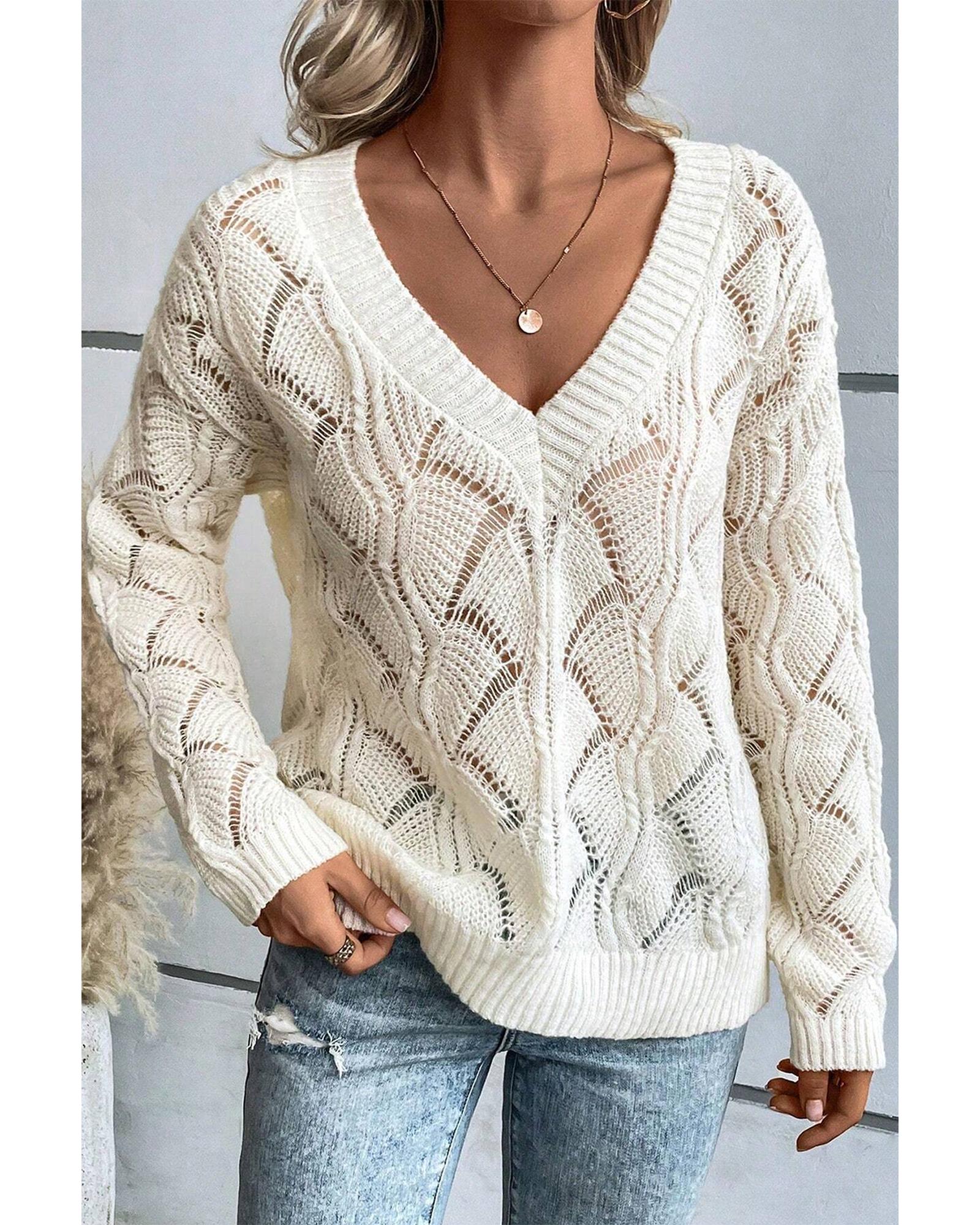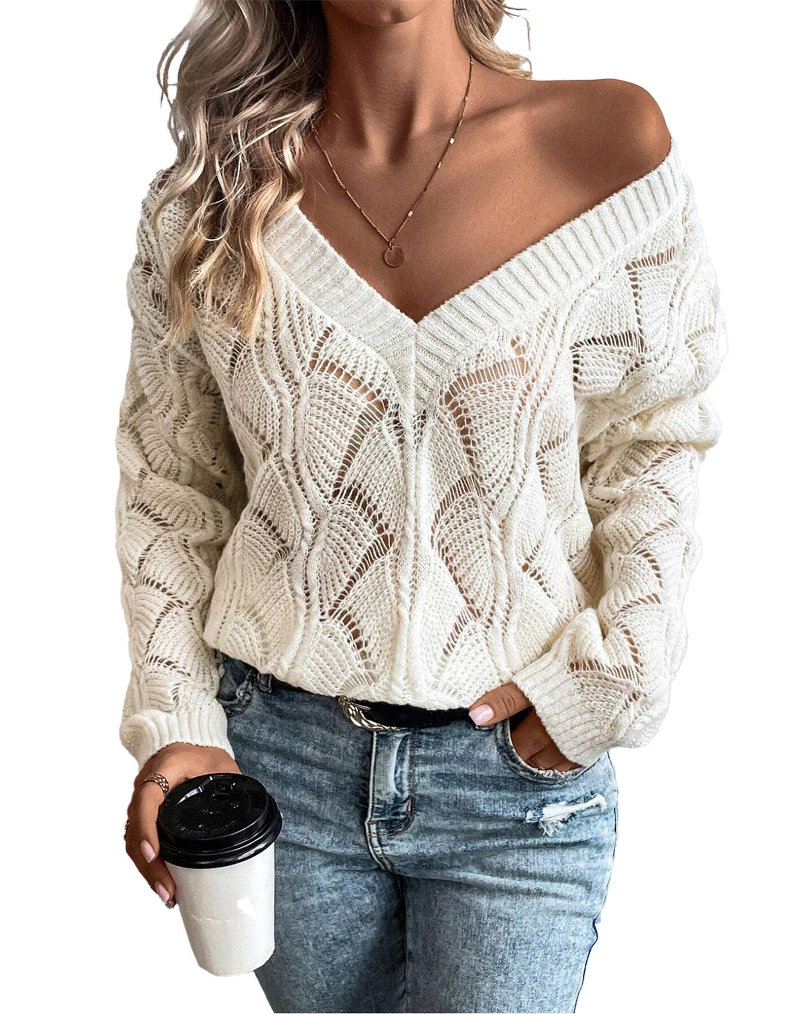 Beige Hollow Out Knit V Neck Drop Shoulder Sweater – XL