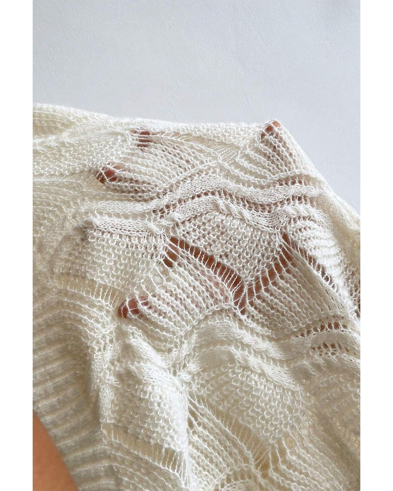 Beige Pointelle Knit Flutter Sleeve Sweater - L
