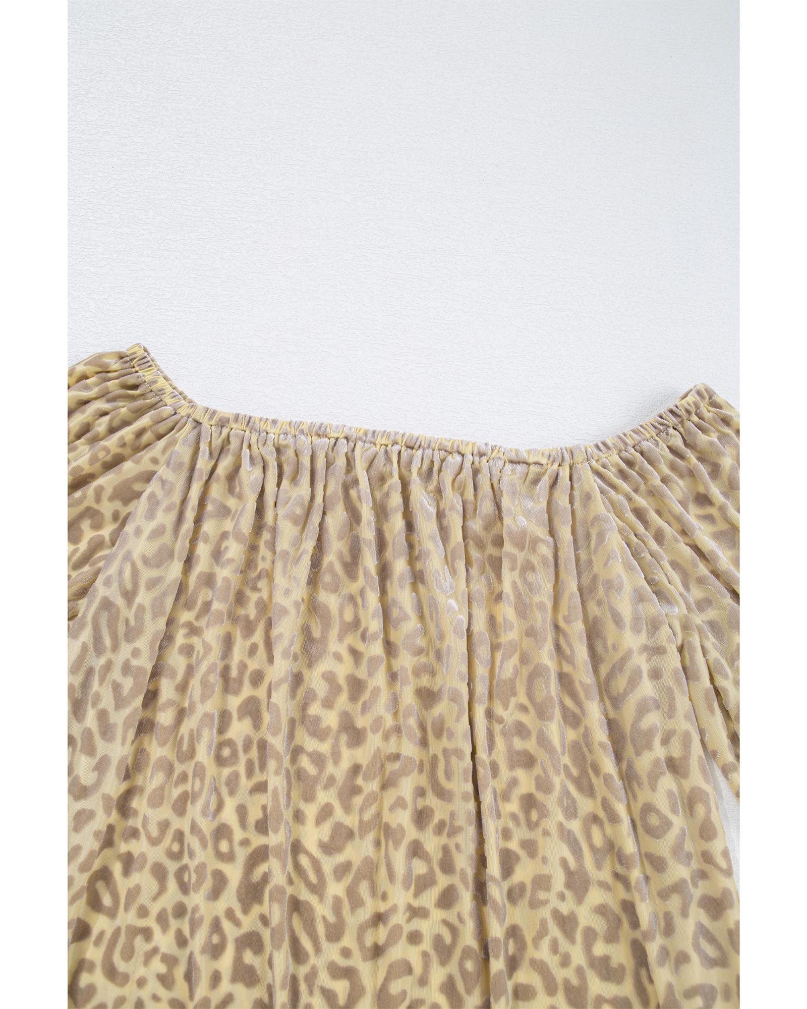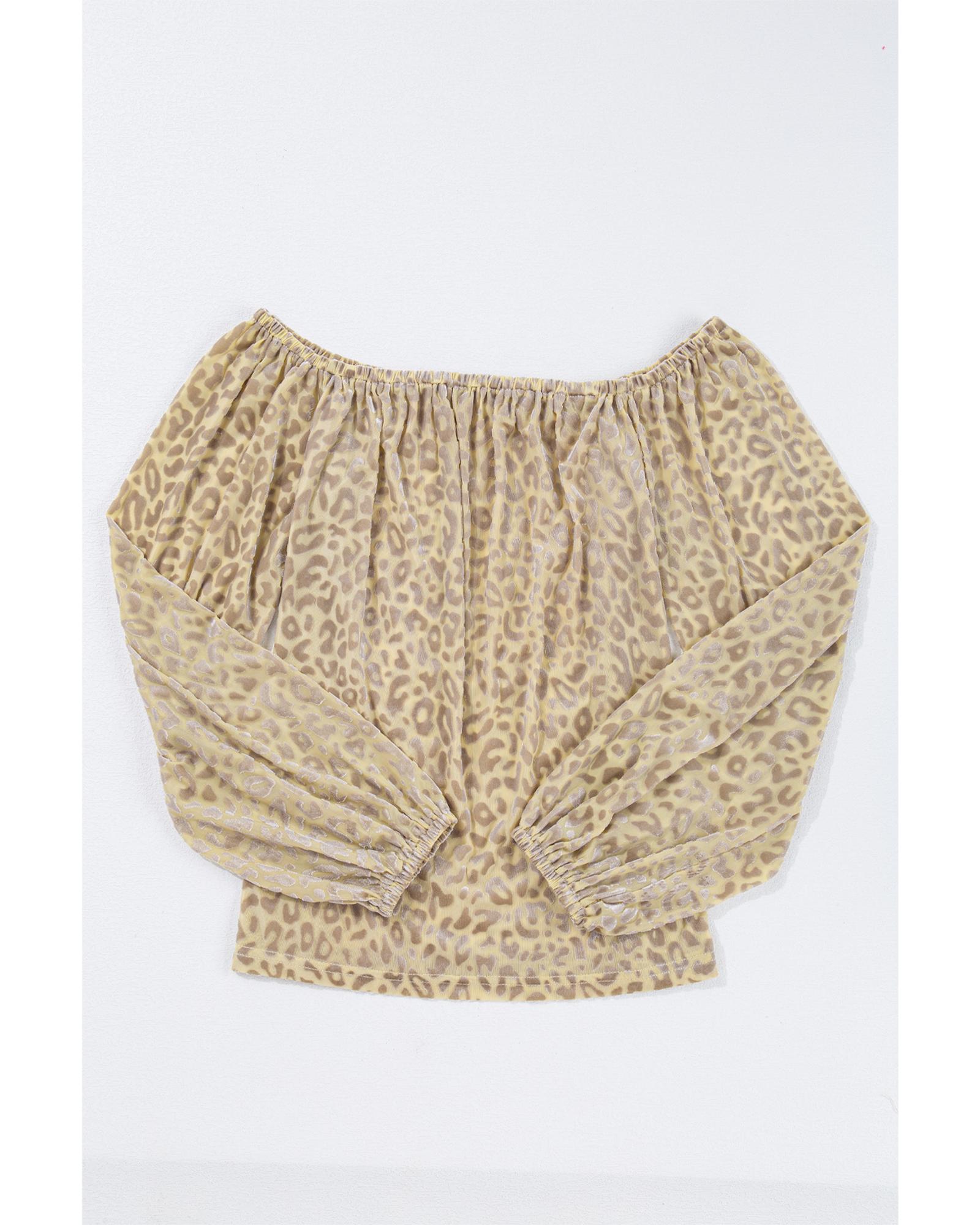 Beige Leopard Velvet Burnout Off Shoulder Long Sleeve Blouse – L