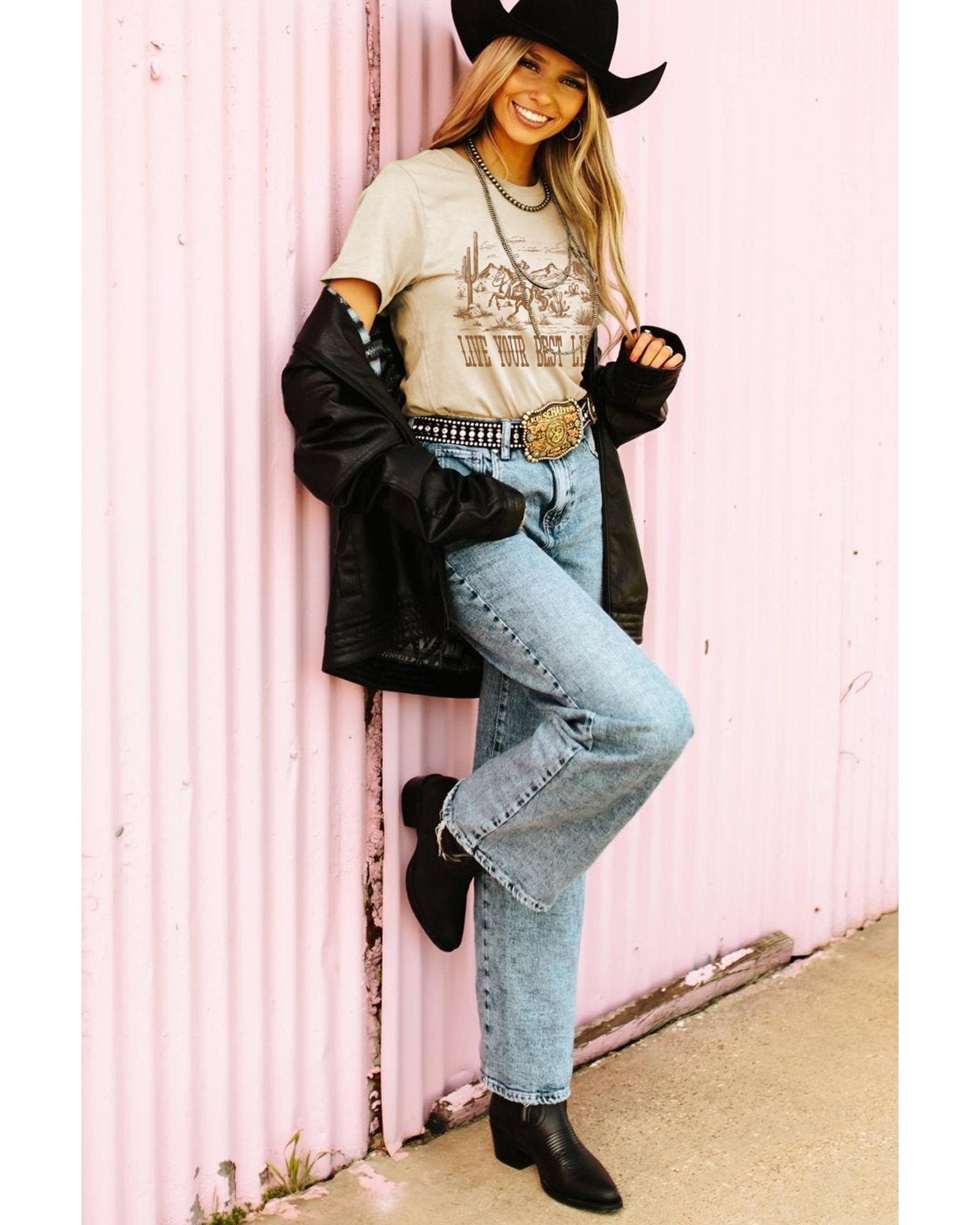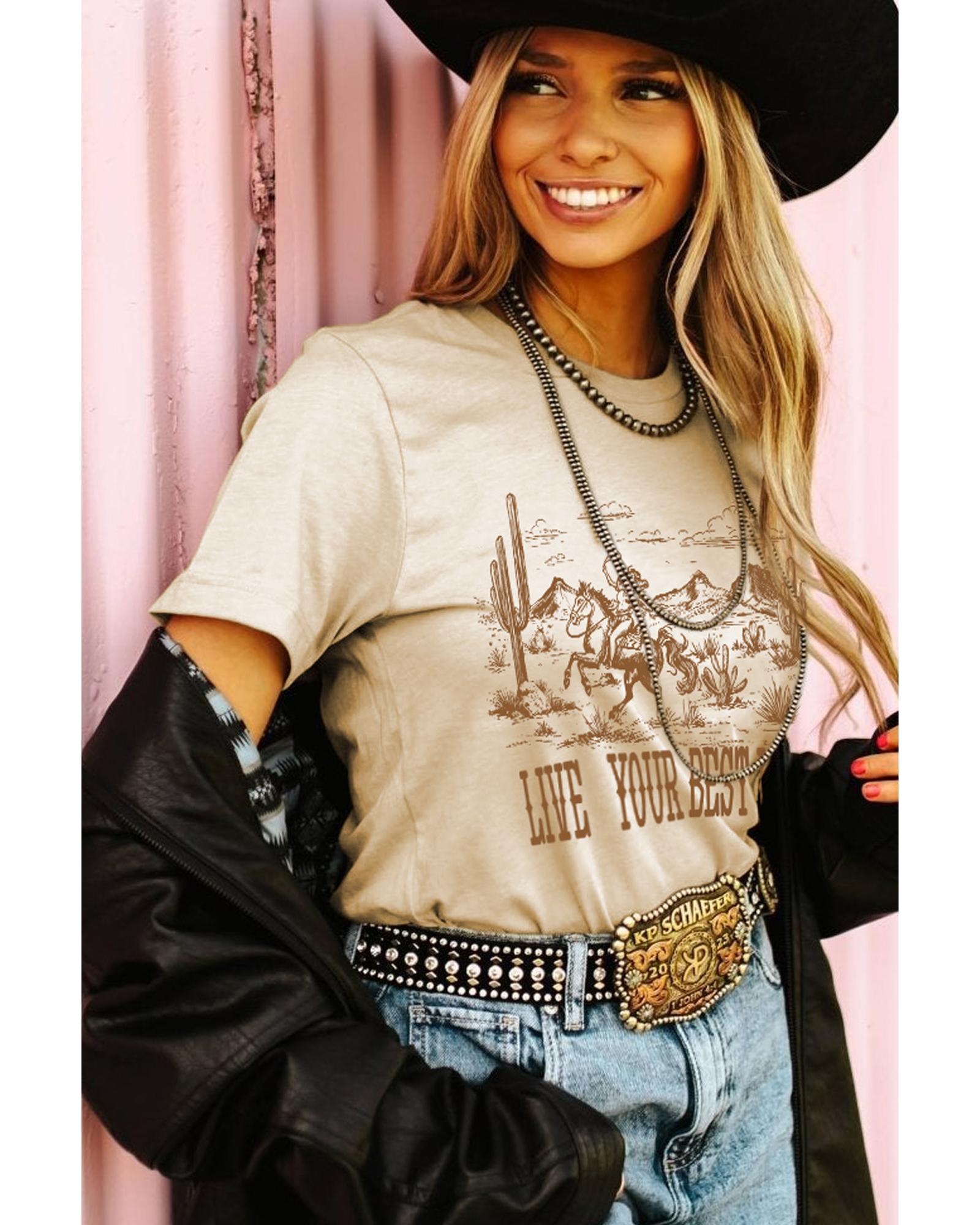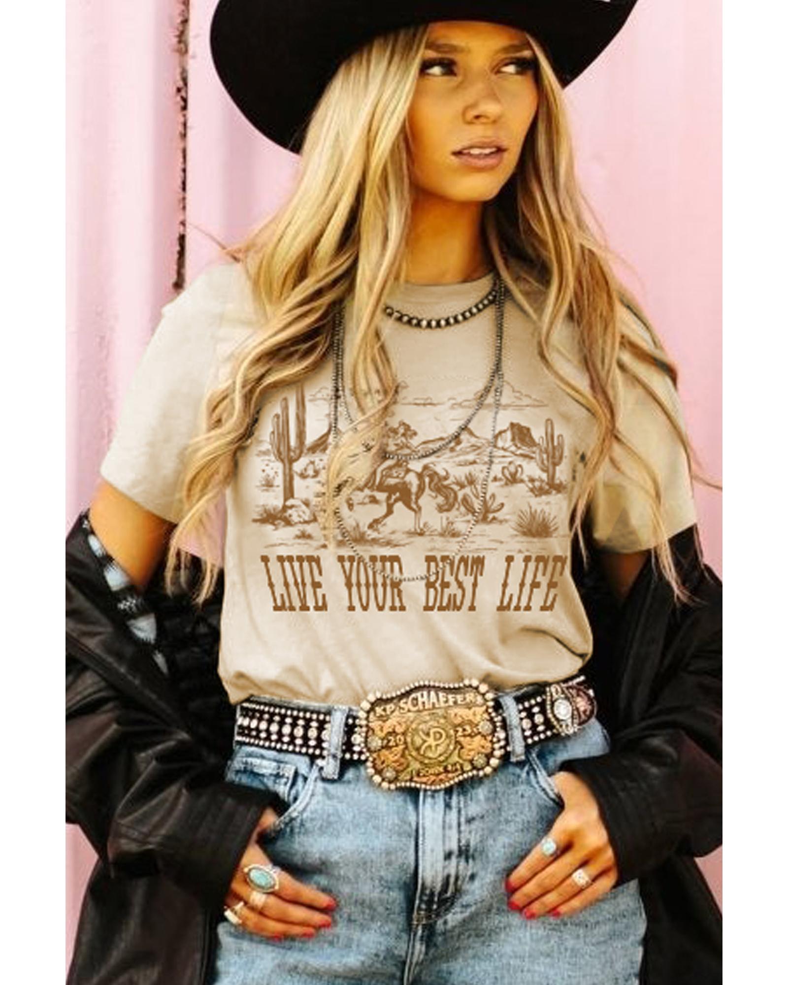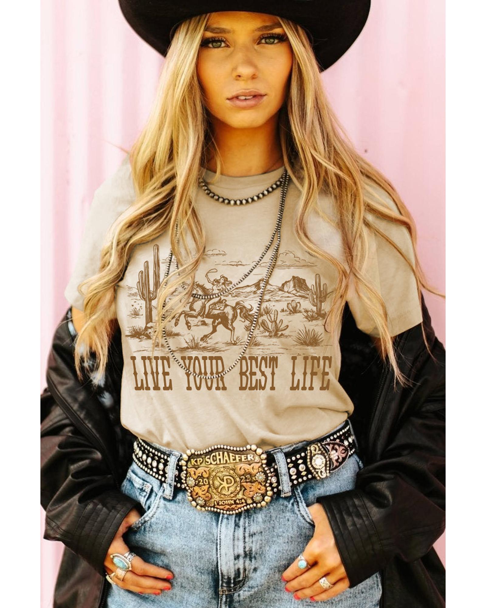 Beige LIVE YOUR BEST LIFE Crew Neck Western Graphic Tee – S