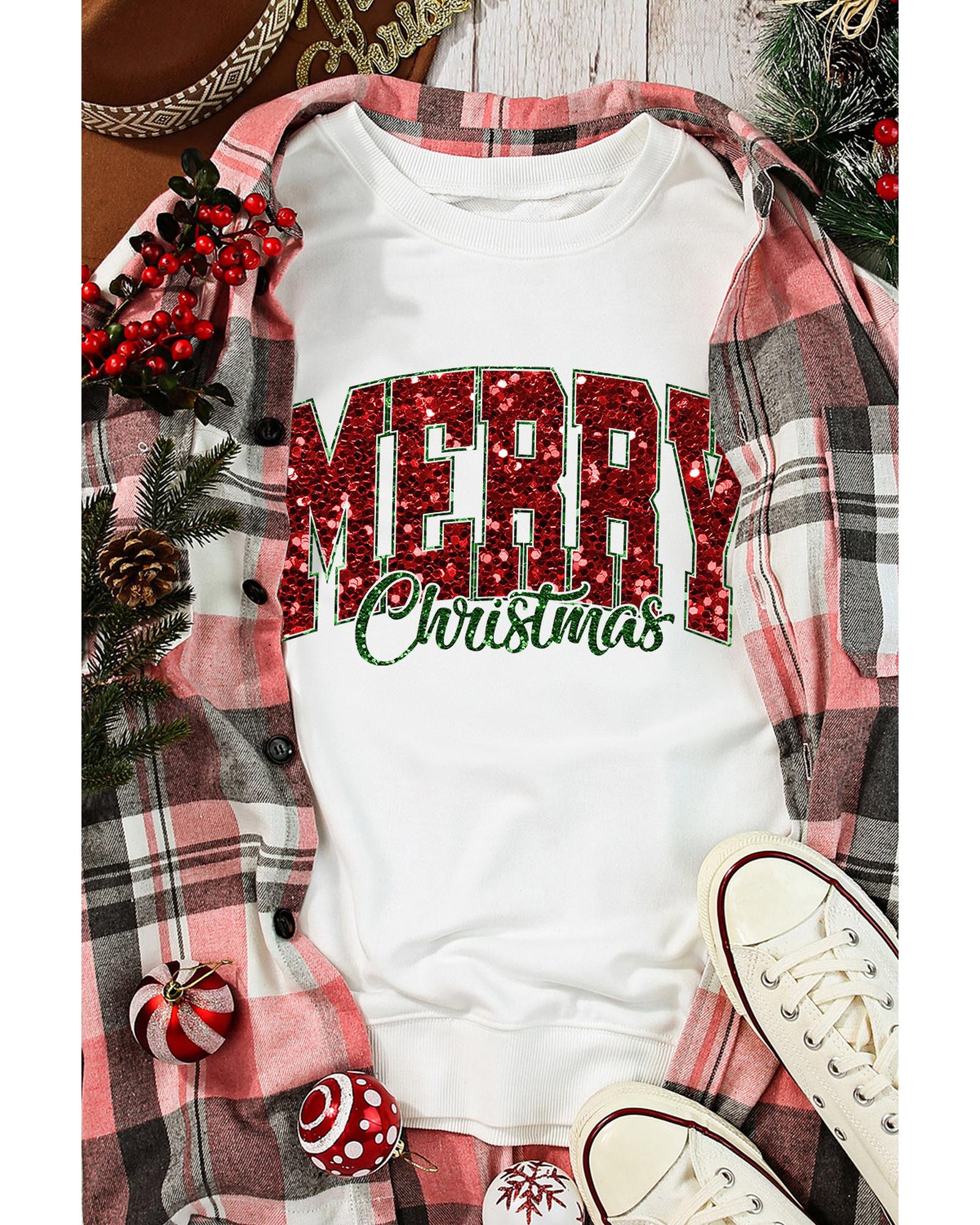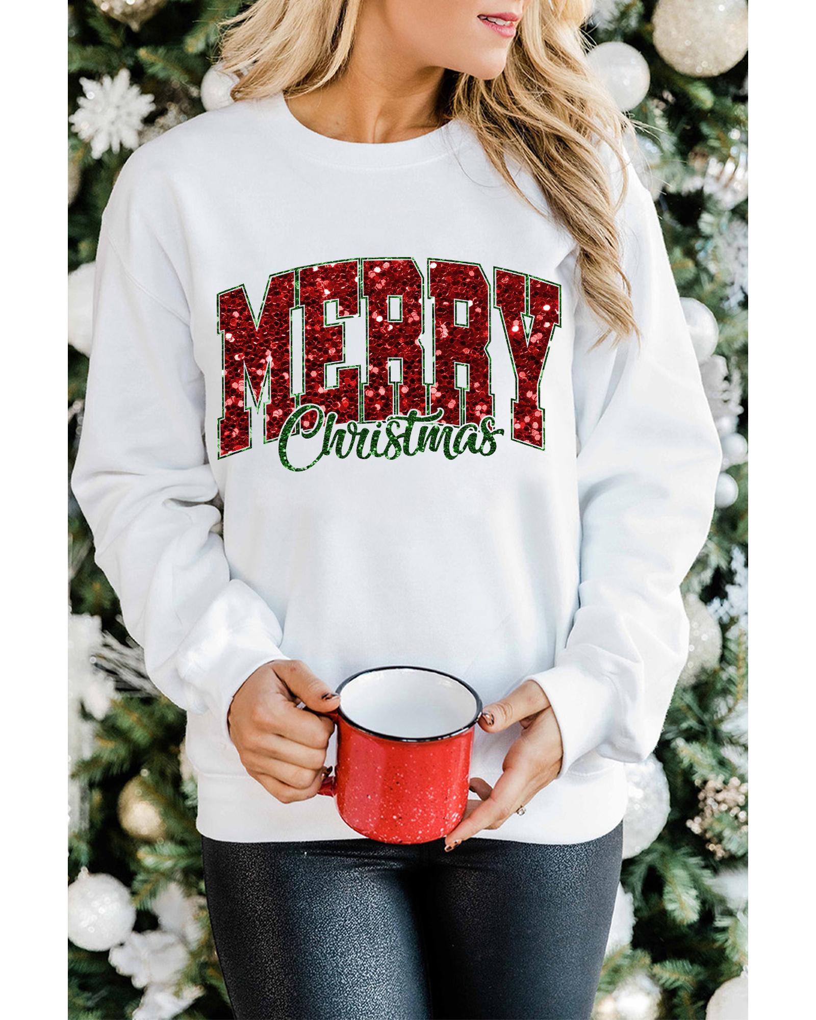 Beige MERRY Christmas Heat Transfer Printing Crewneck Pullover Sweatshirt – M