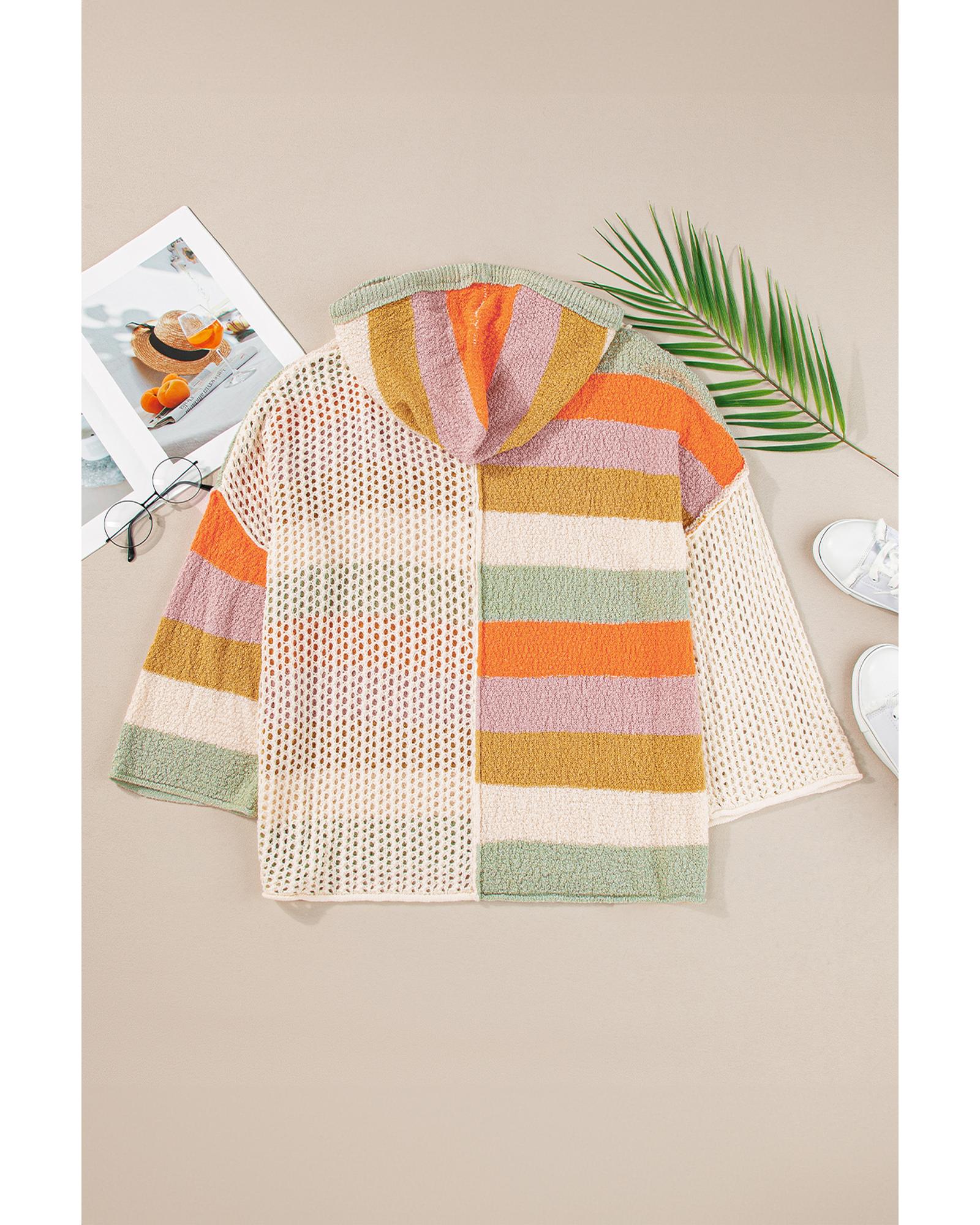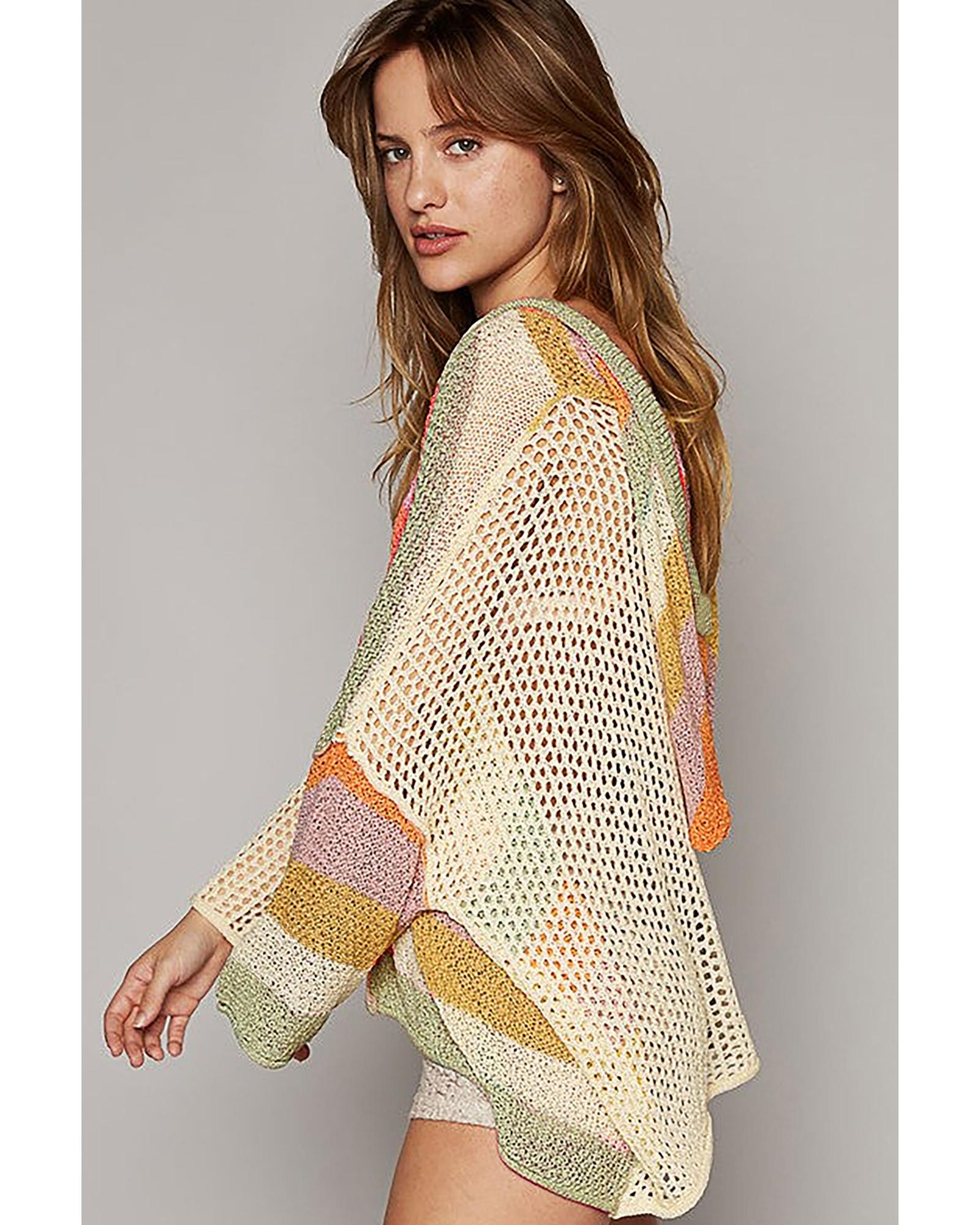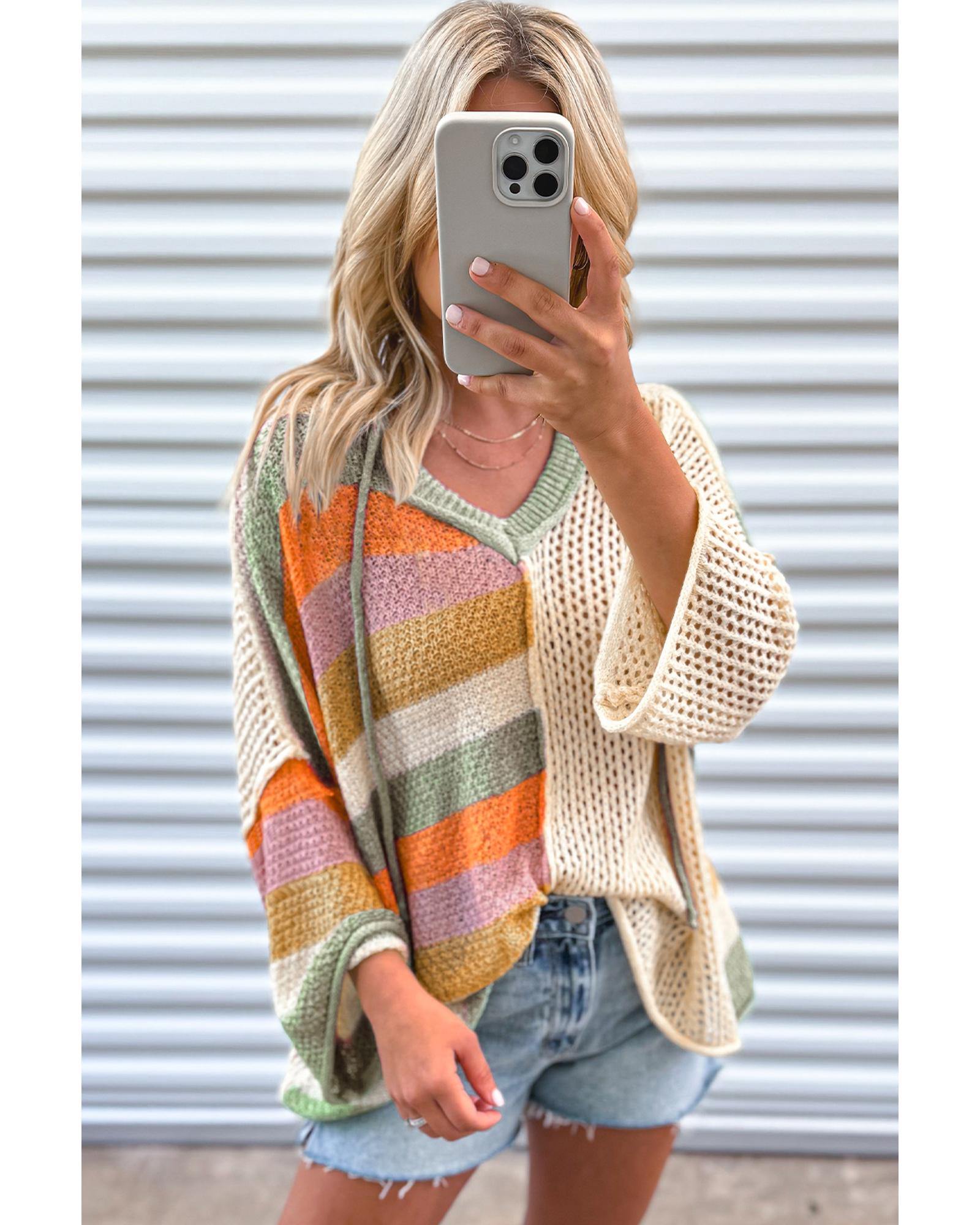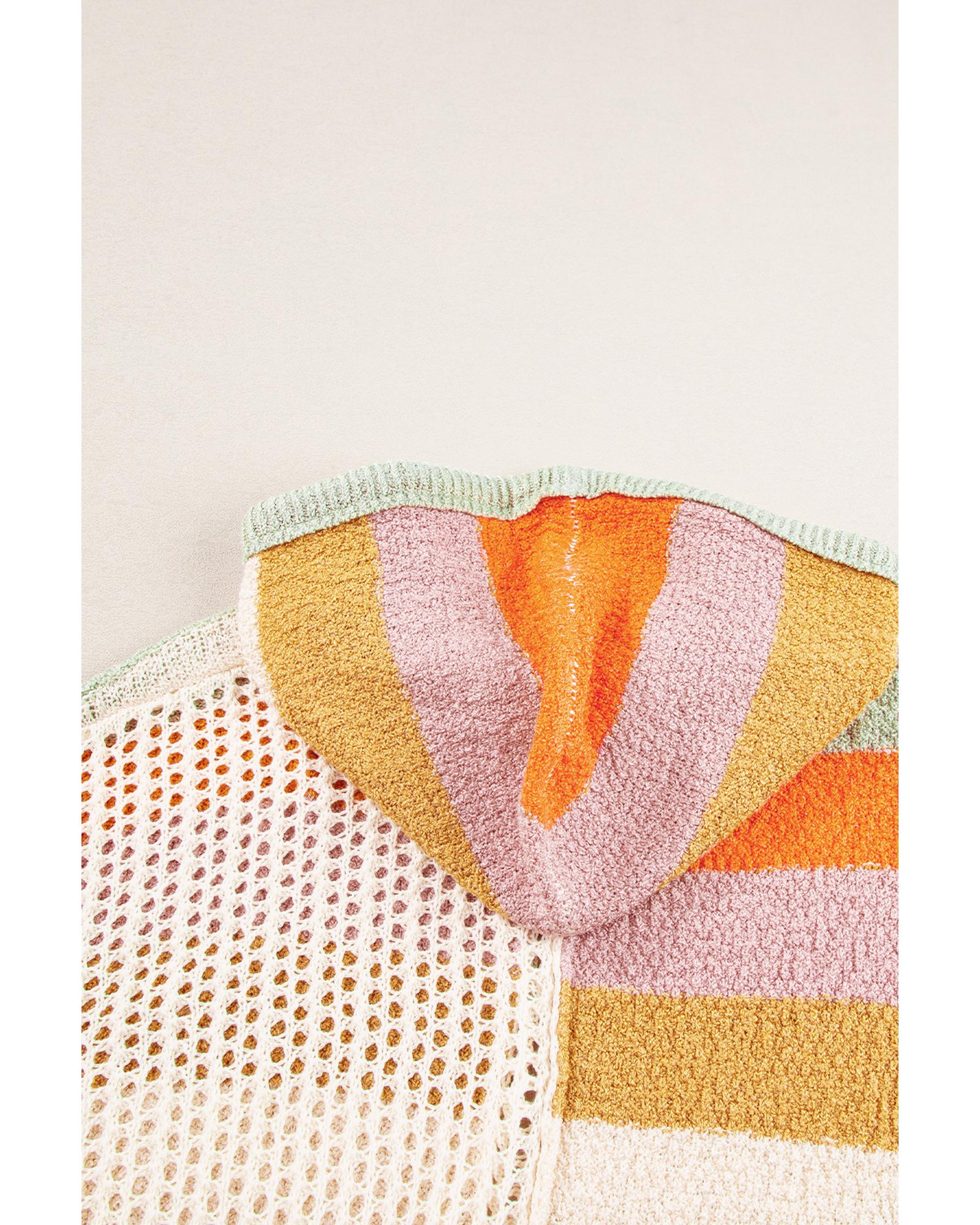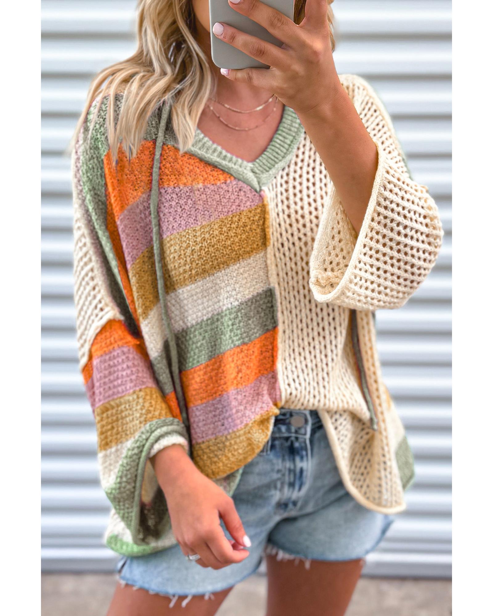 Beige Oversized Colorblock V Neck Hooded Sweater – M