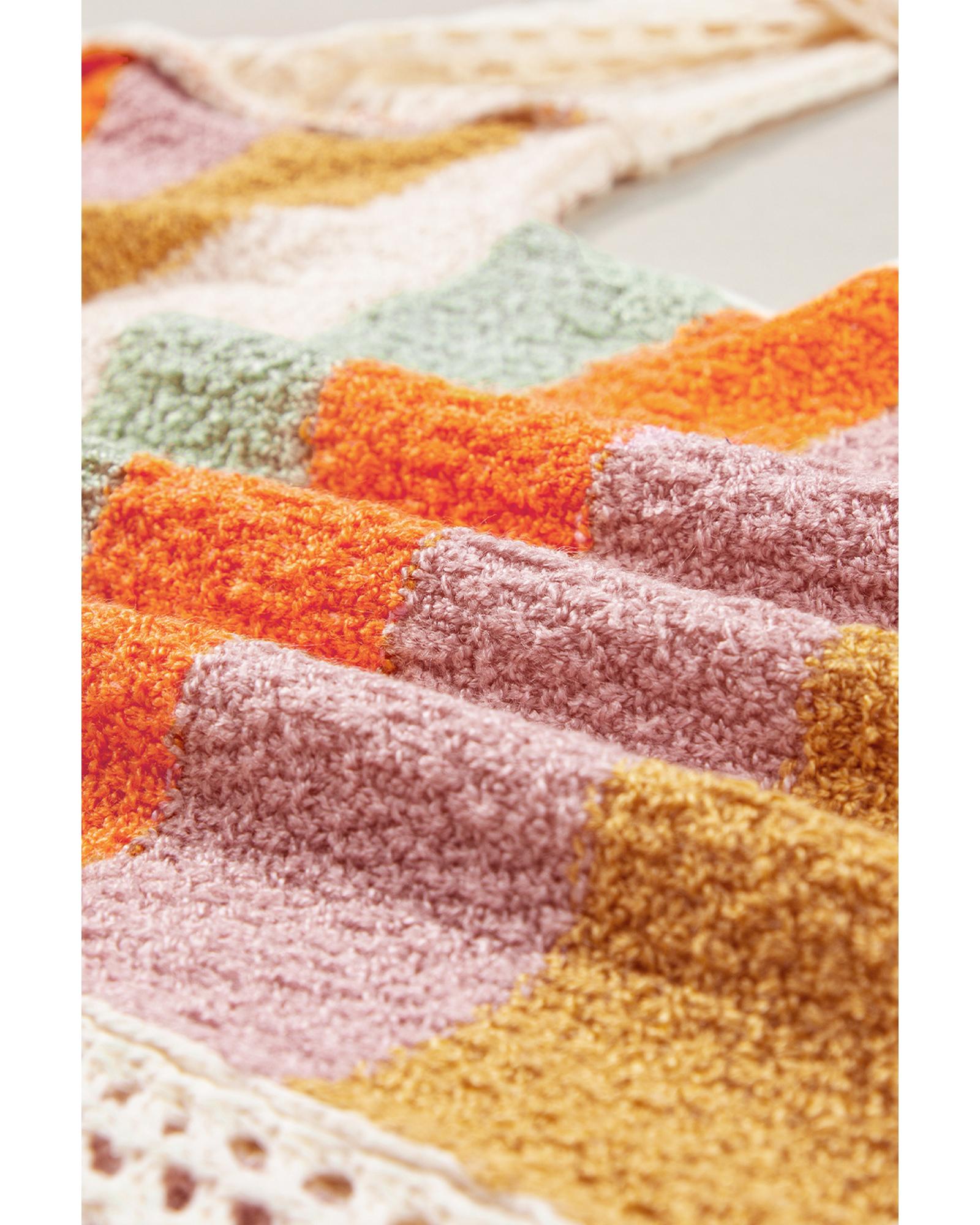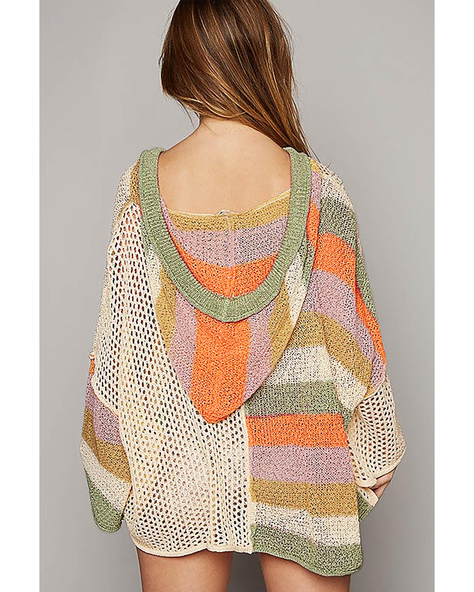 Beige Oversized Colorblock V Neck Hooded Sweater – S