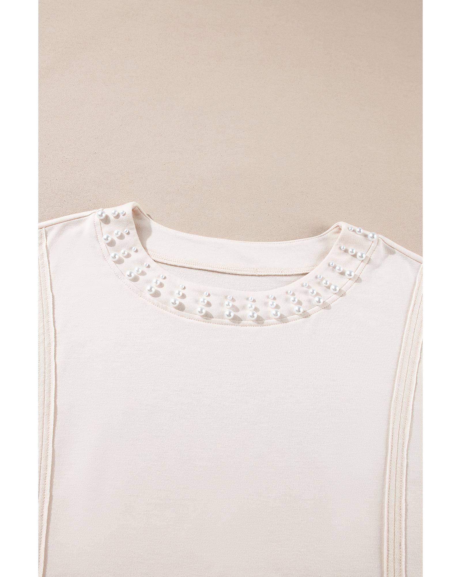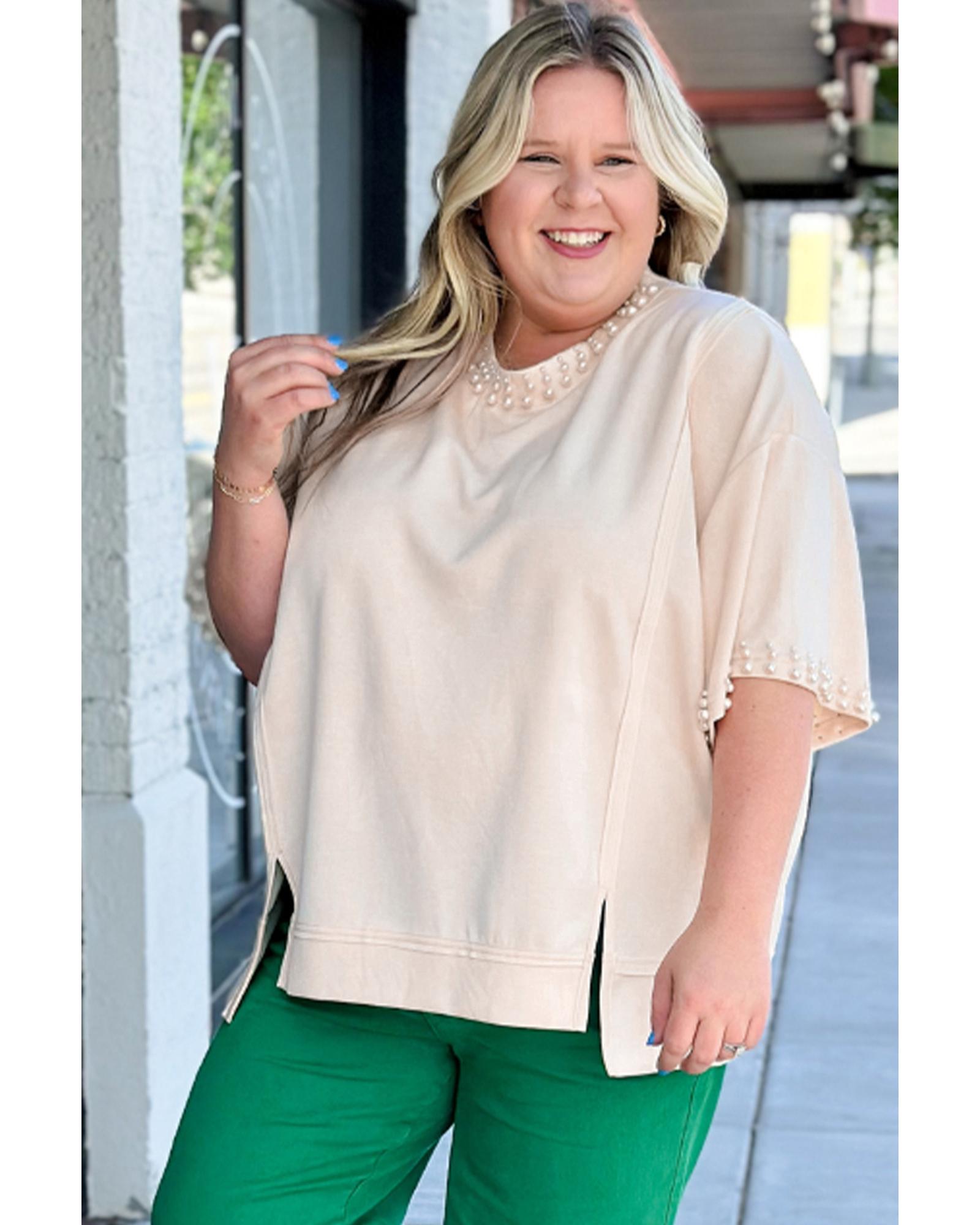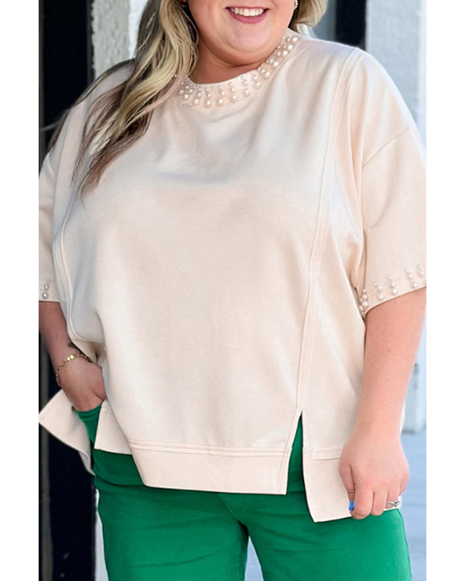 Beige Pearl Decor Crew Neck Half Sleeve Plus Size T Shirt – 2X