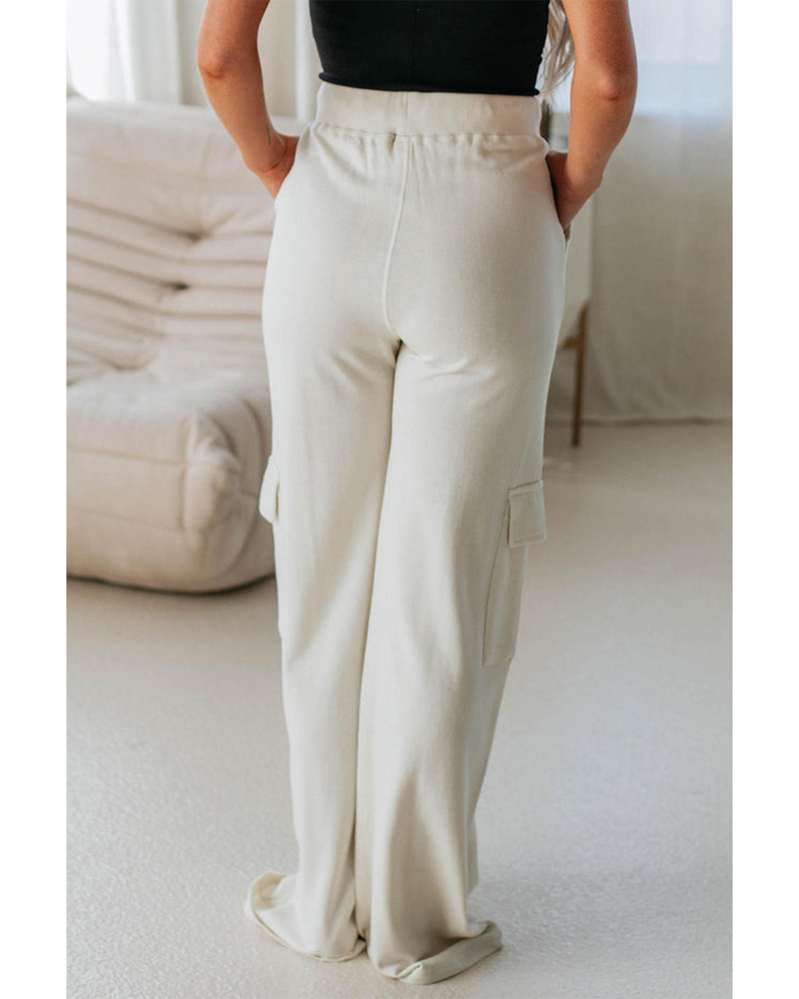 Beige Plain Cargo Pockets High Waist Casual Sweatpants – S