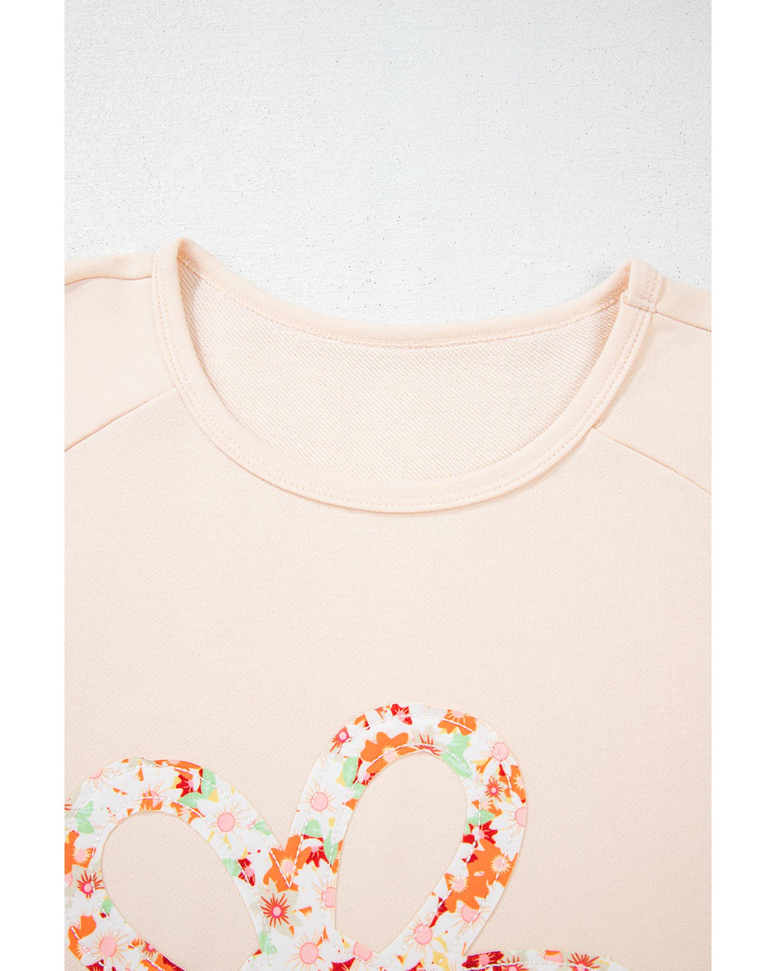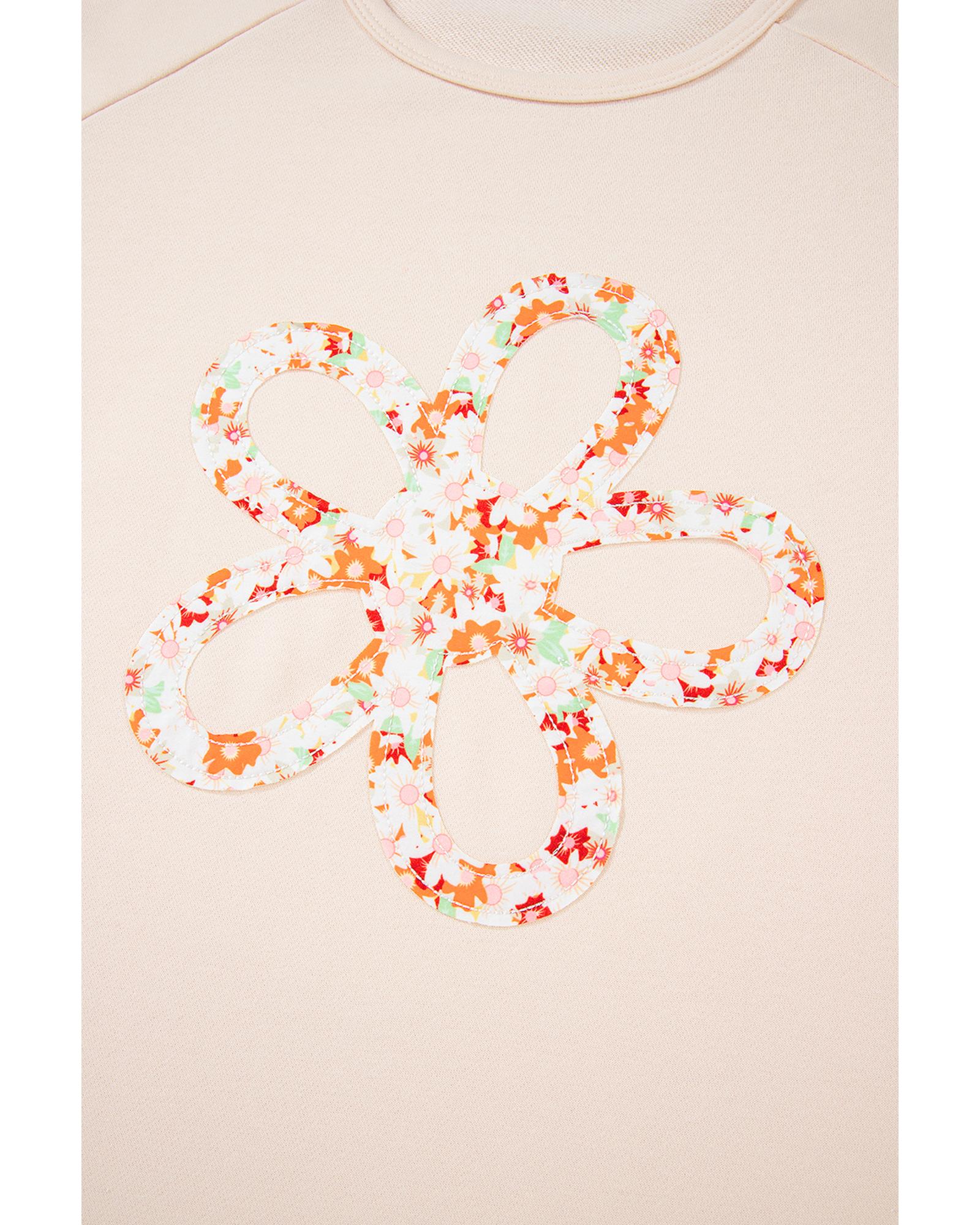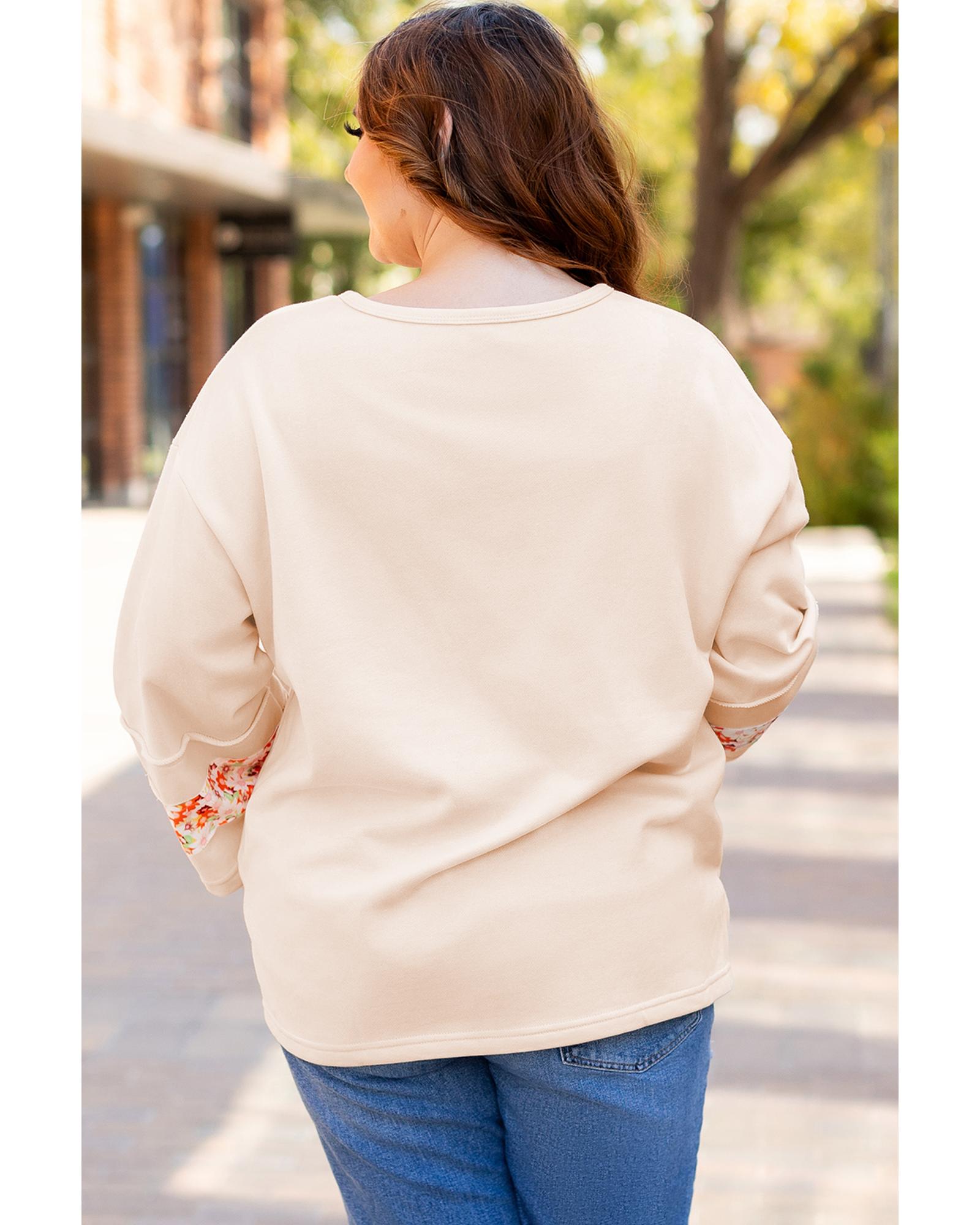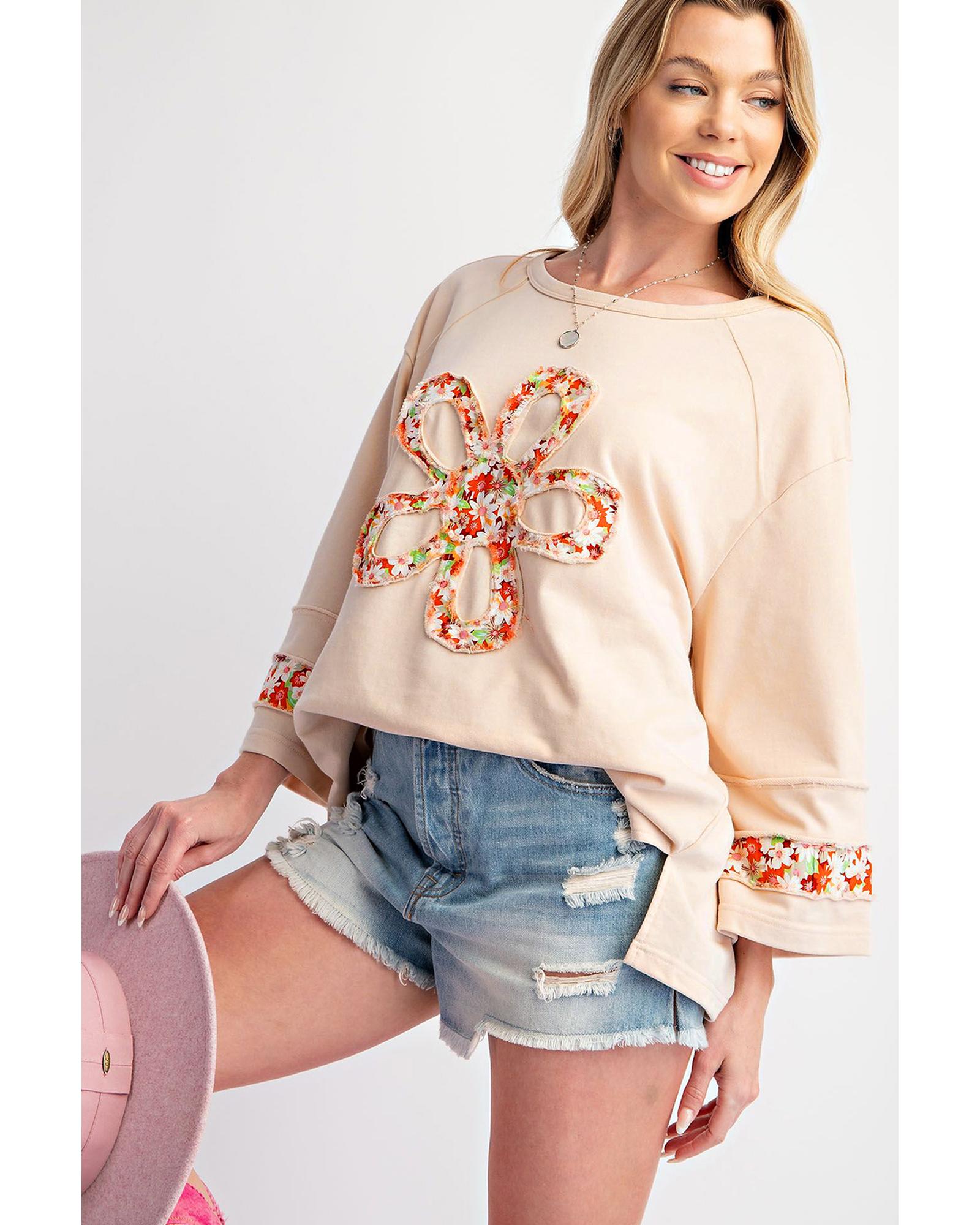 Beige Plus Size Flower Patched Side Slits Crewneck Top – 1X