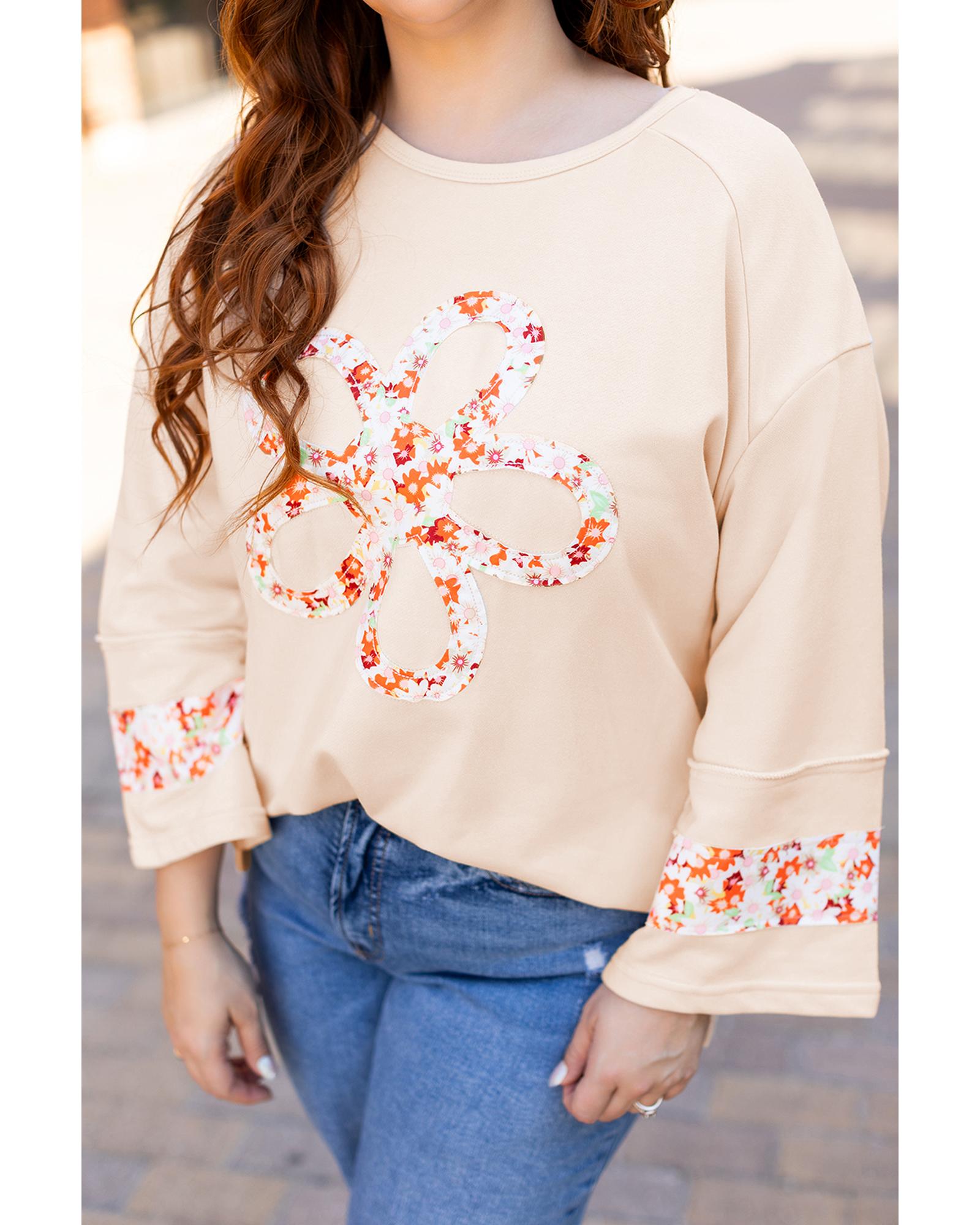 Beige Plus Size Flower Patched Side Slits Crewneck Top – 4X