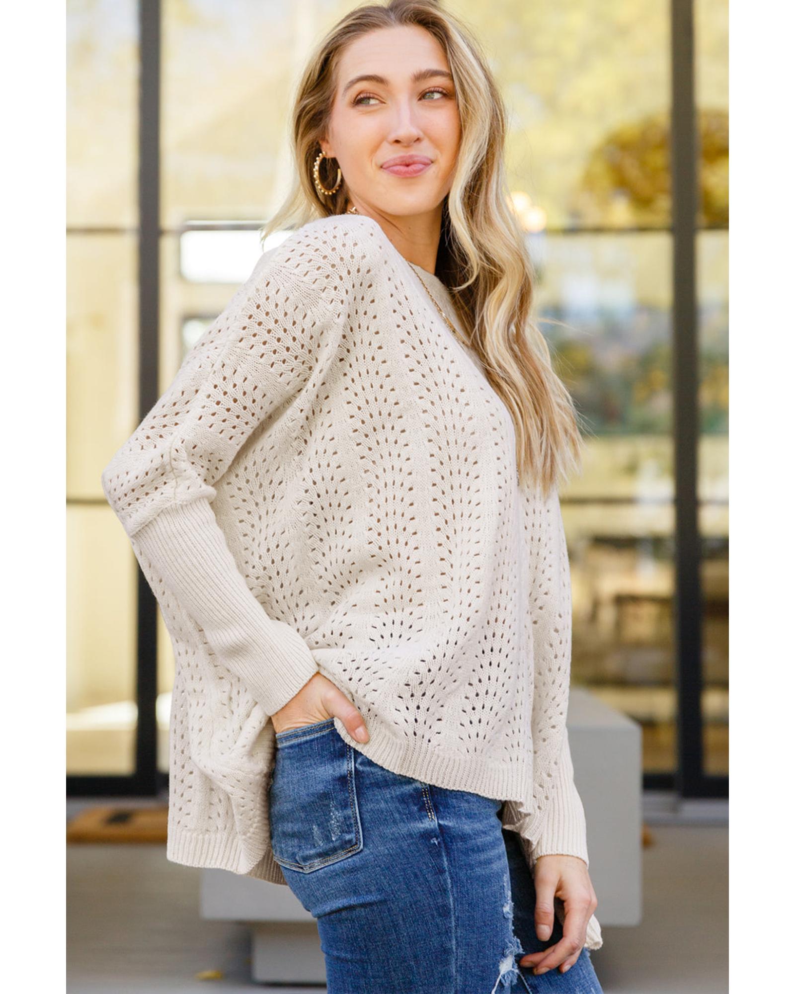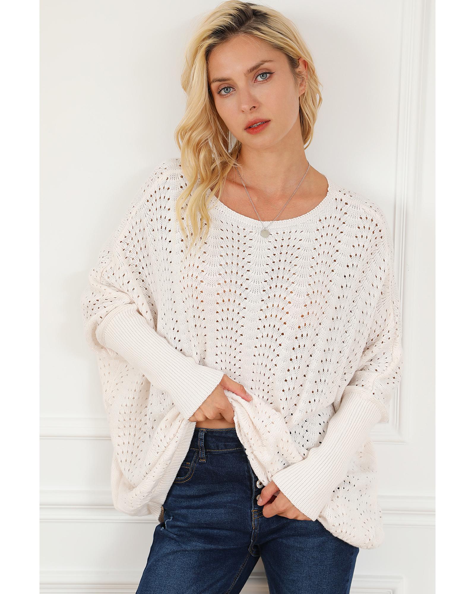 Beige Ribbed Hollow Knit Dolman Sleeve Sweater – L