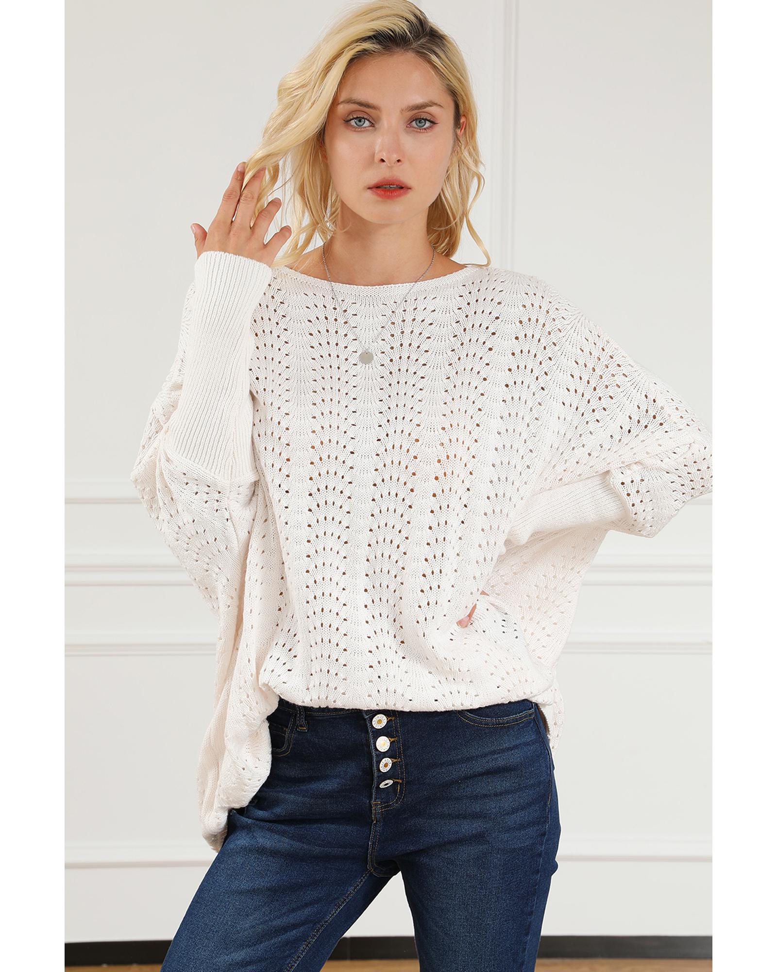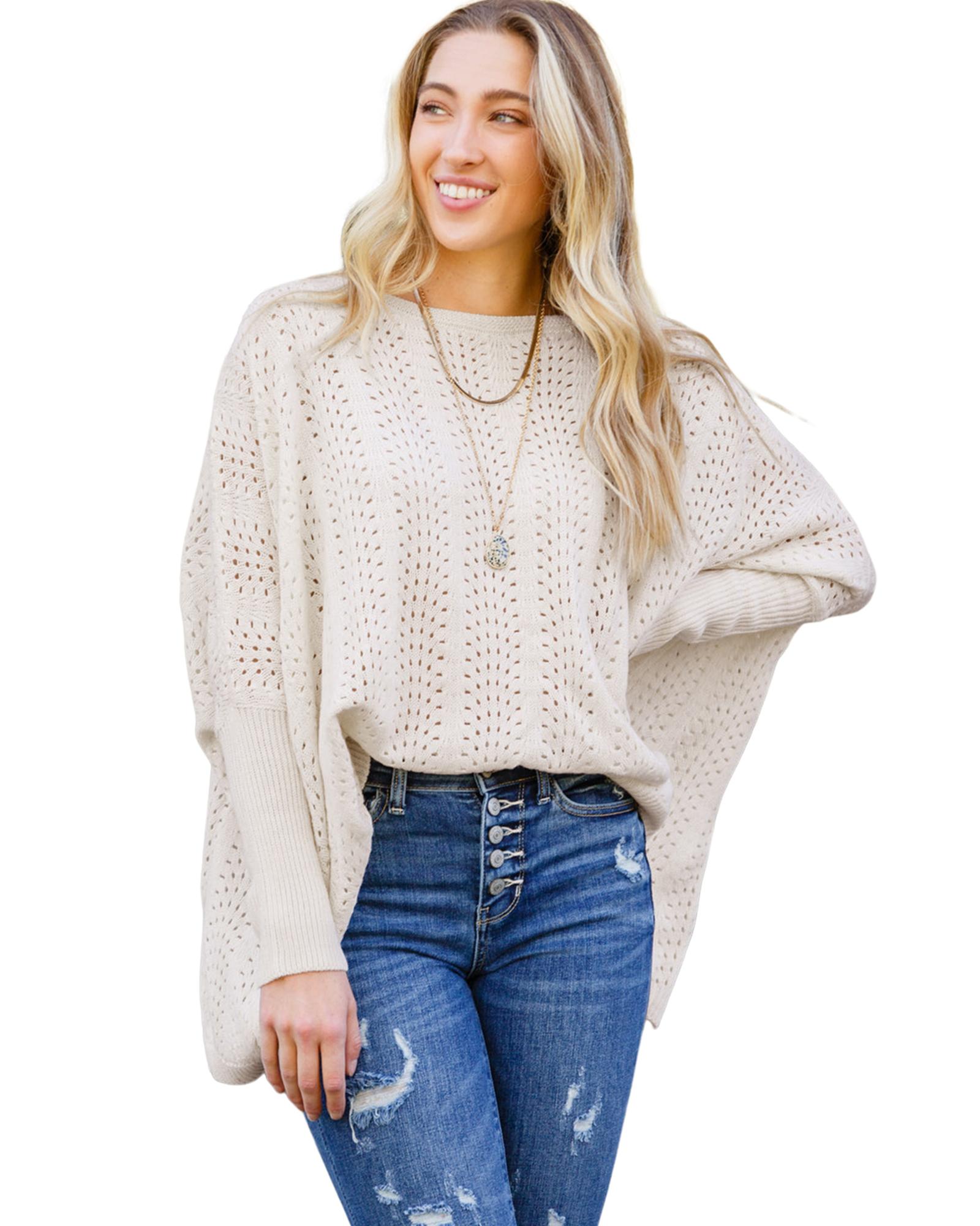Beige Ribbed Hollow Knit Dolman Sleeve Sweater – M