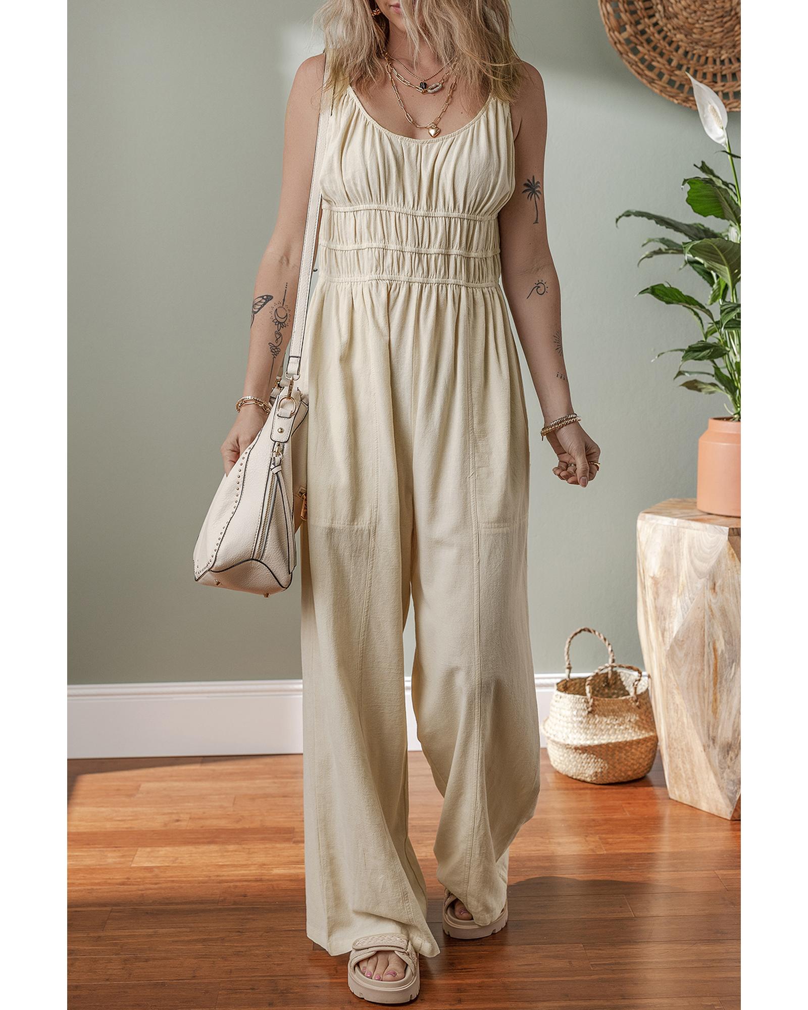 - Beige ruched high waist sleeveless wide leg jumpsuit