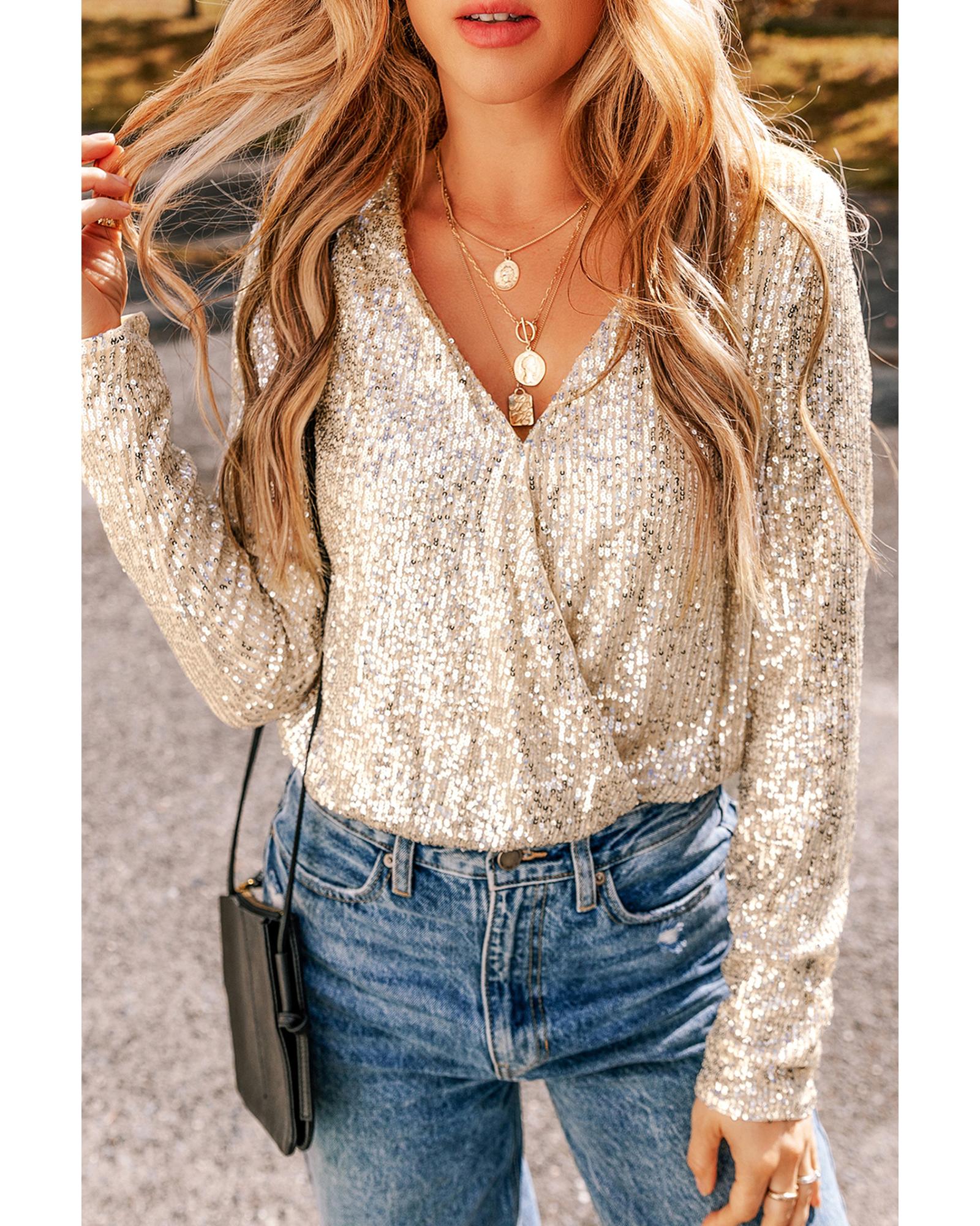 Beige Sequin Long Sleeve Wrap V Neck Bodysuit - S Original price was: $74.99.Current price is: $40.99.
