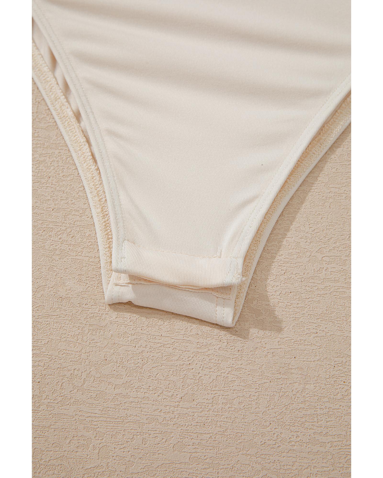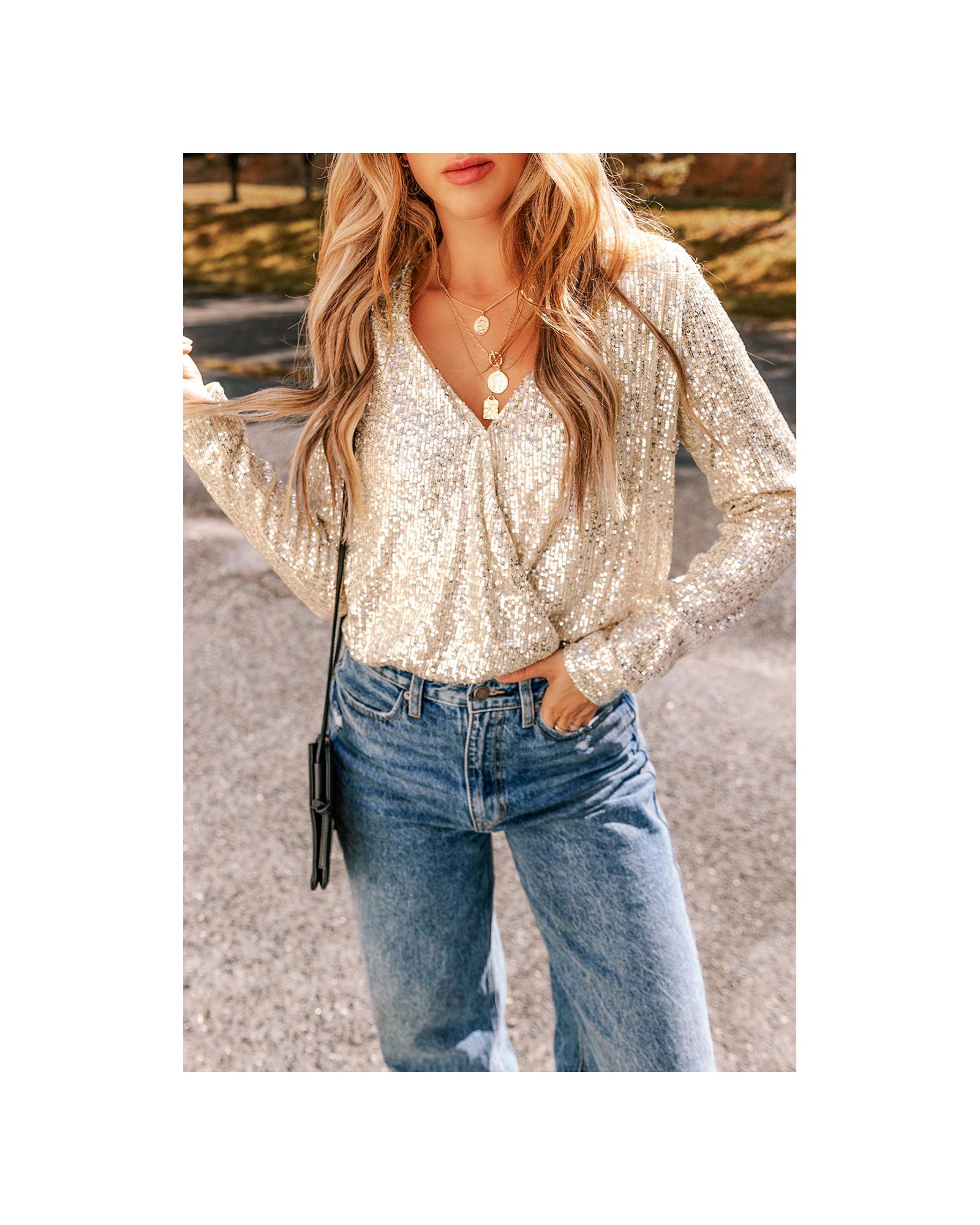 - Beige Sequin Long Sleeve Wrap V Neck Bodysuit