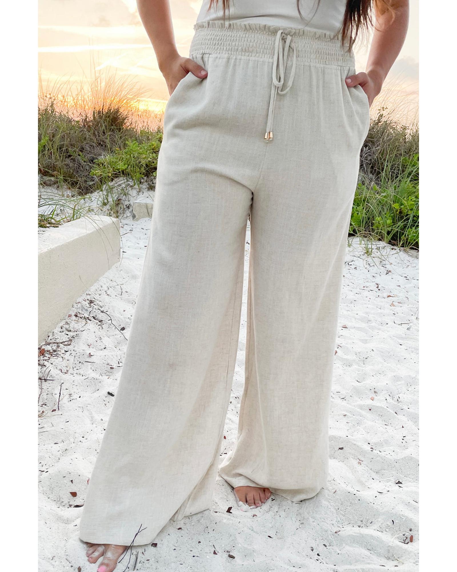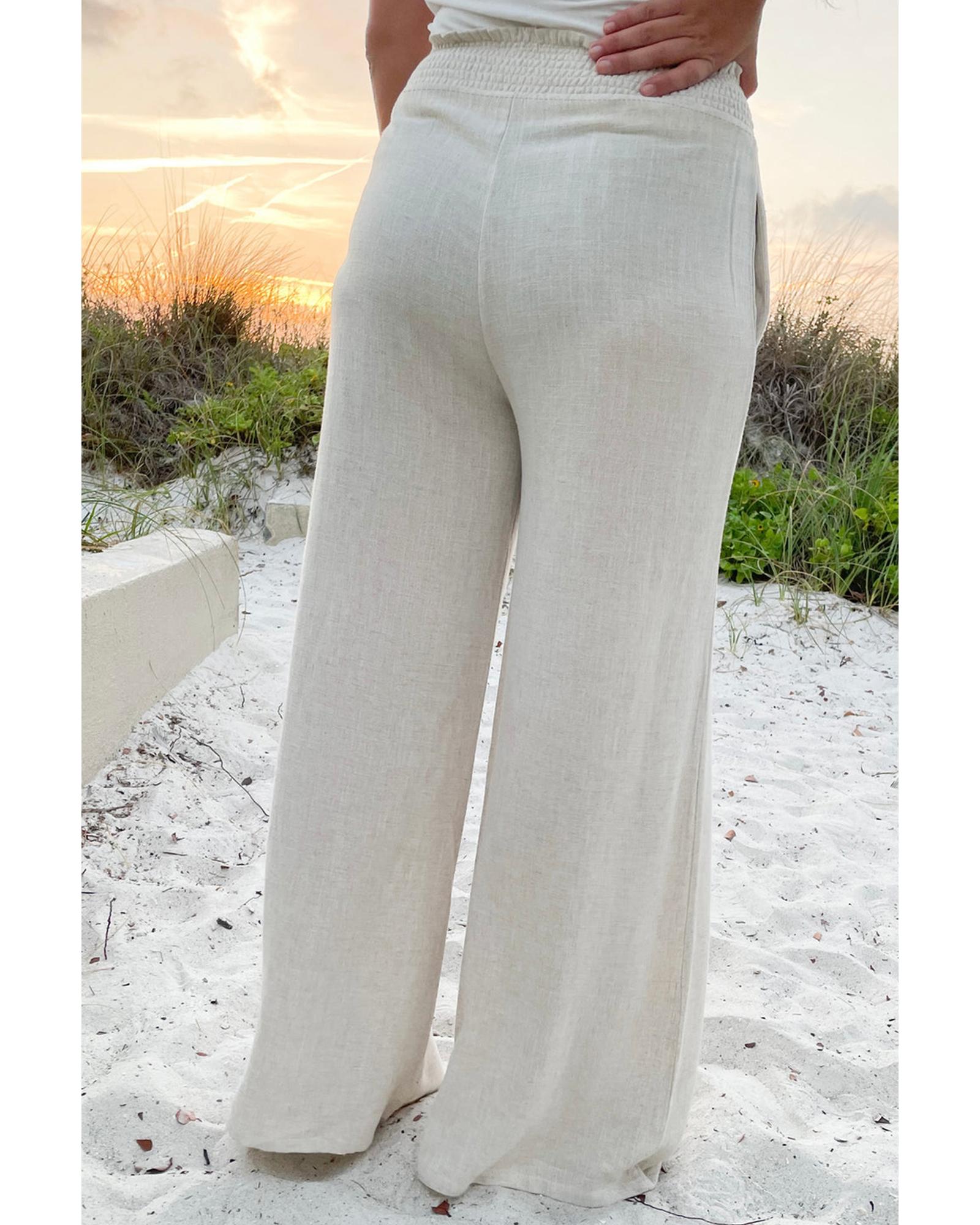 Beige Smocked High Waist Wide Leg Plus Size Pants – 2X