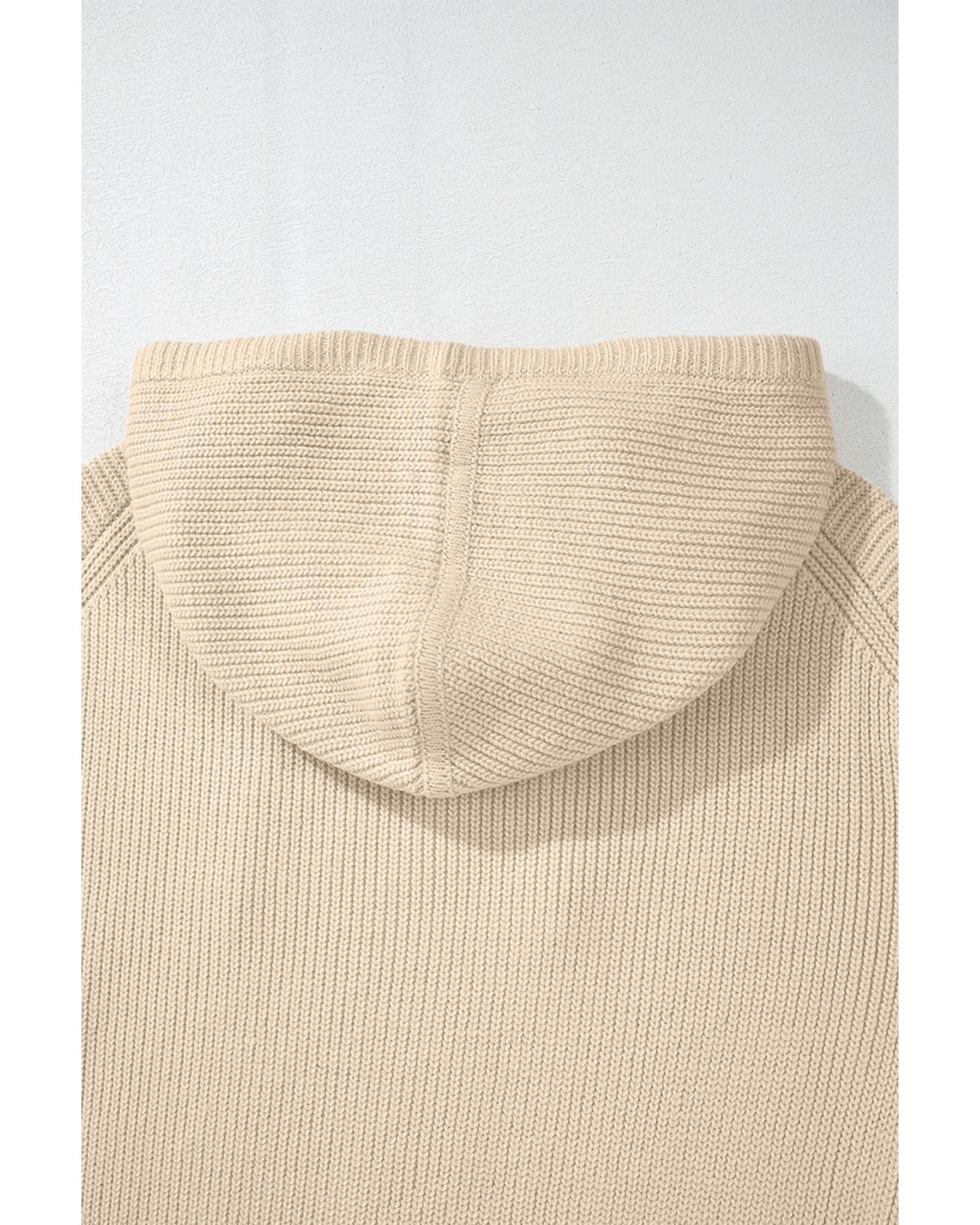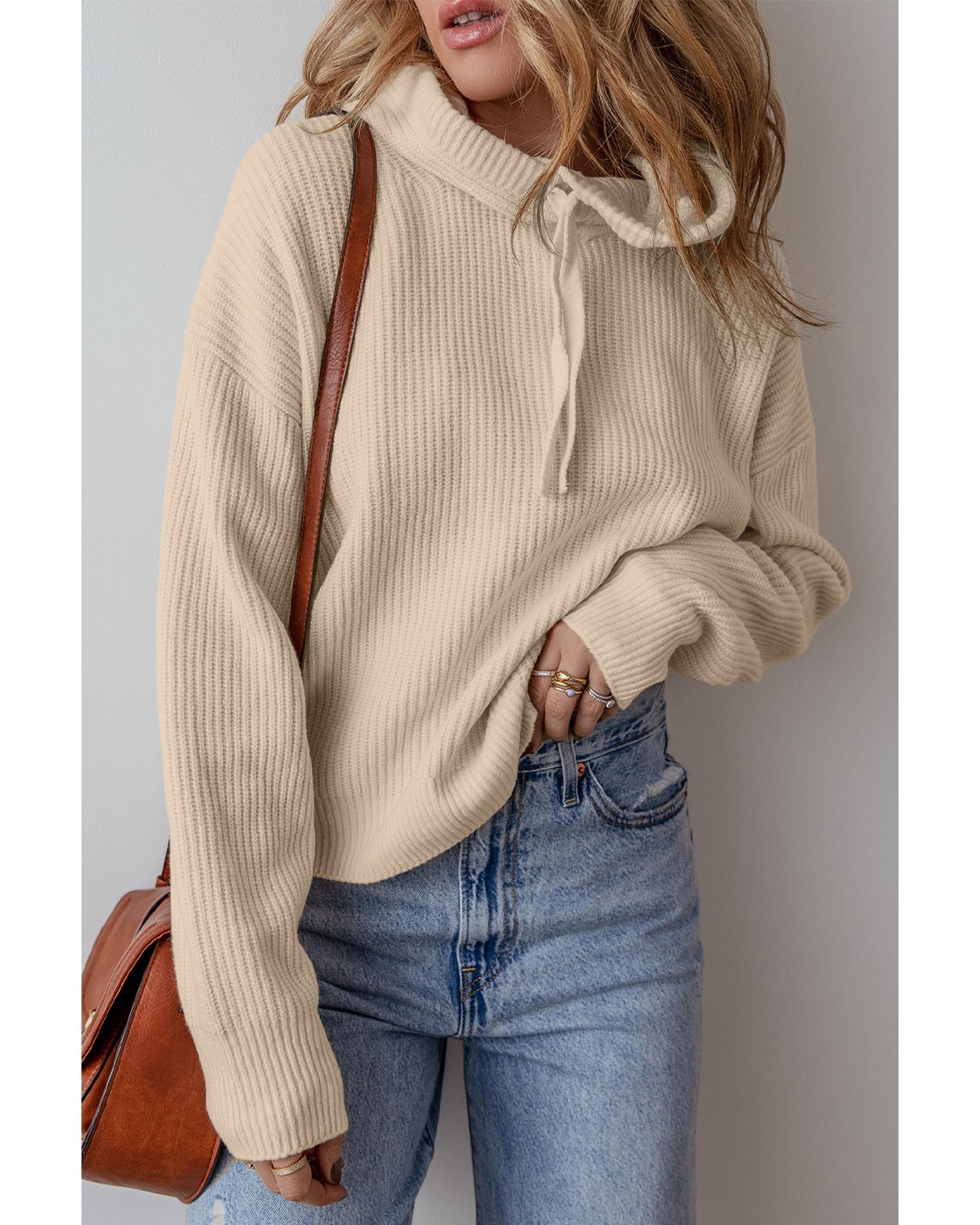 Beige Solid Color Drawstring Hooded Drop Shoulder Pullover Sweater – L