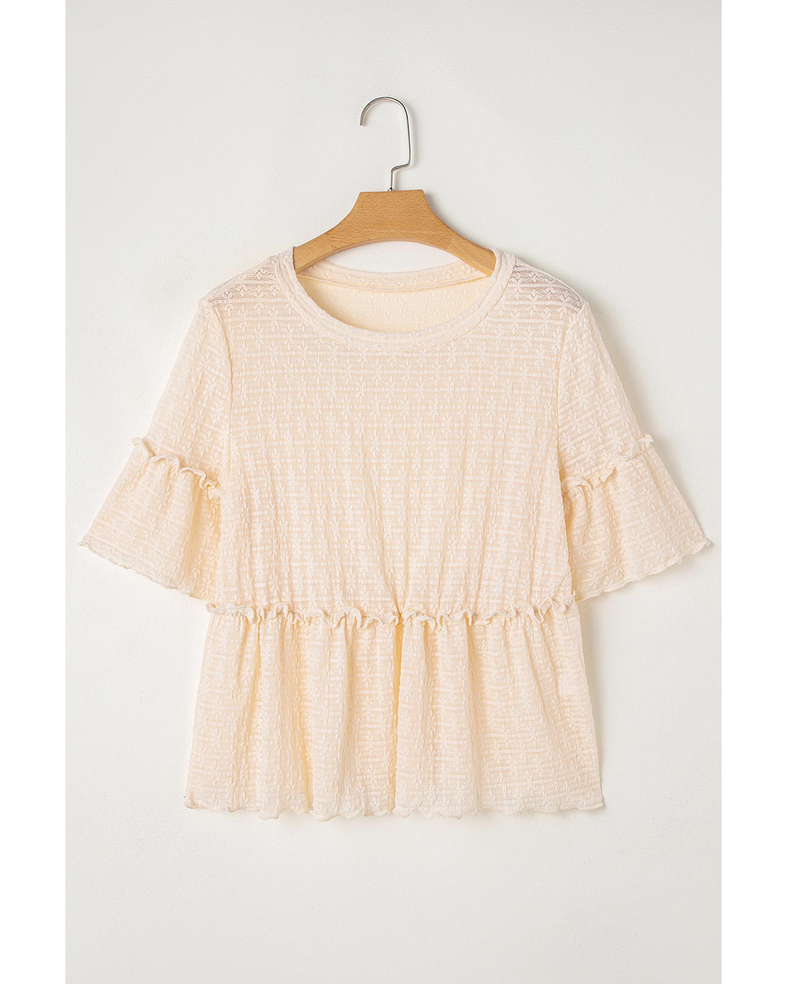 Beige Solid Color Textured Ruffled Short Sleeve Blouse – XL