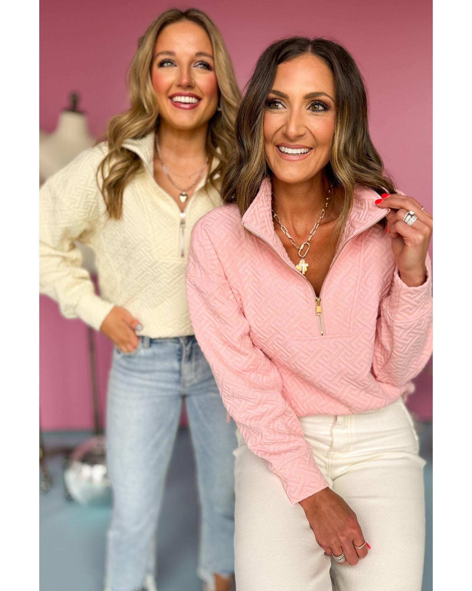 Beige Solid Textured Half Zipper Collared Sweatshirt – S