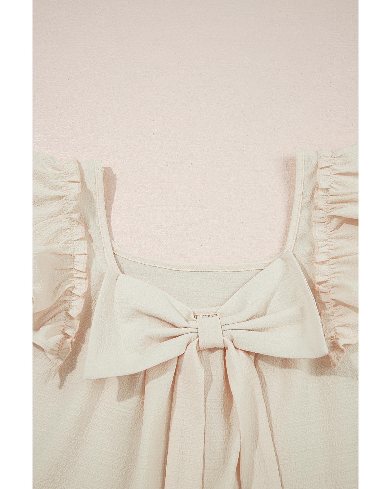Beige Textured Bow Knot Frilled Butterfly Sleeve Blouse – L