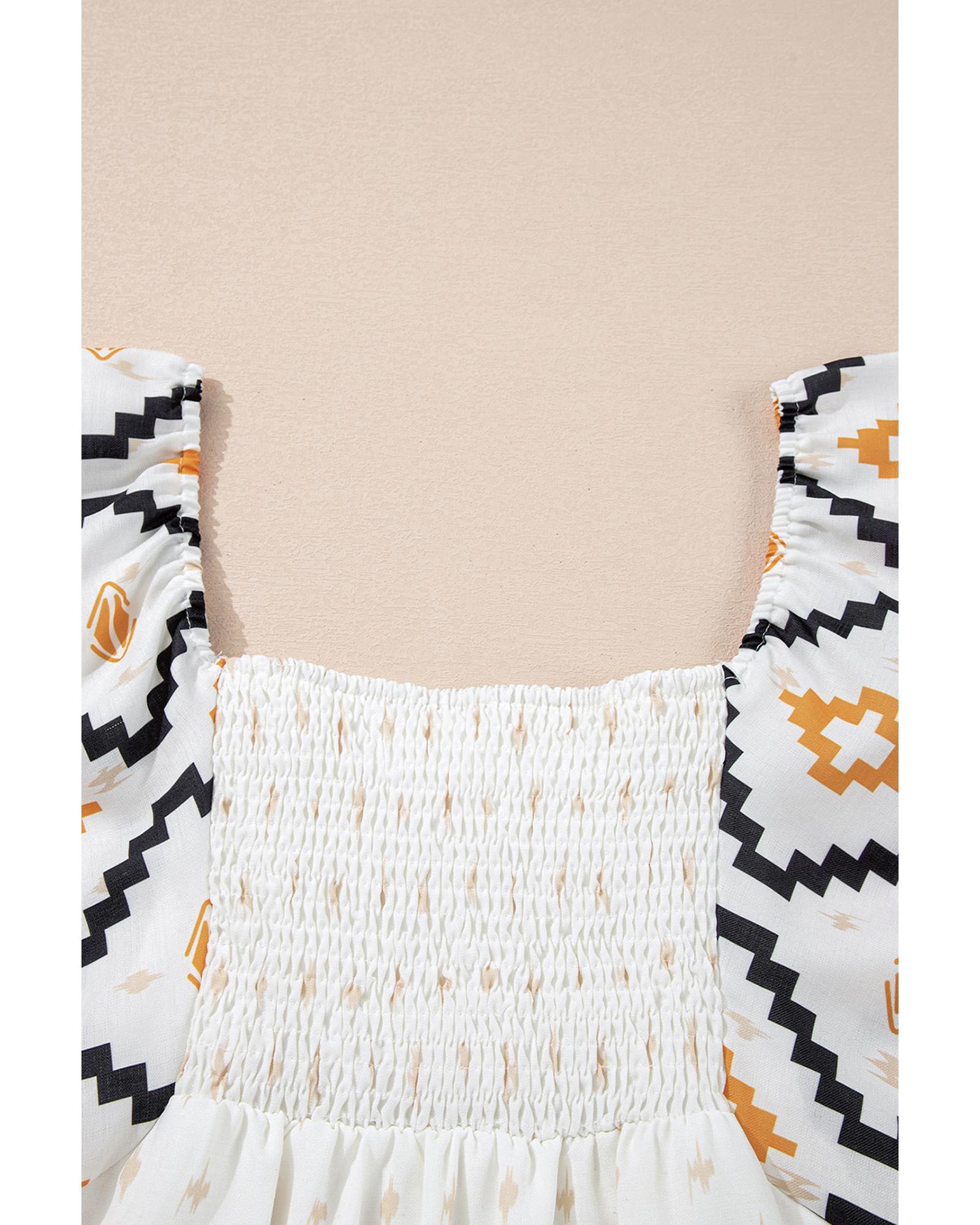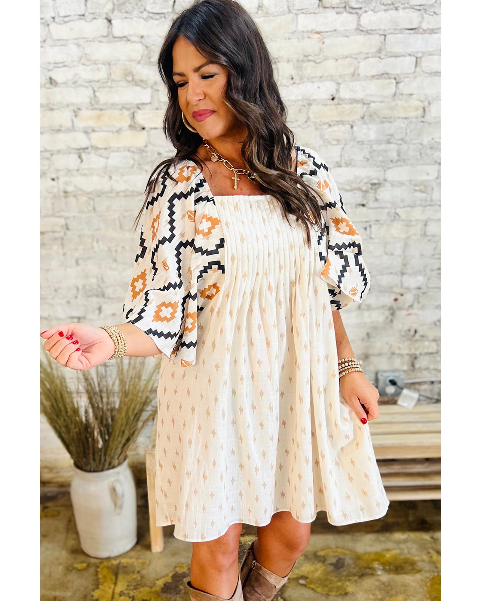 - Beige Western Aztec Print Pleated Square Neck Loose Mini Dress