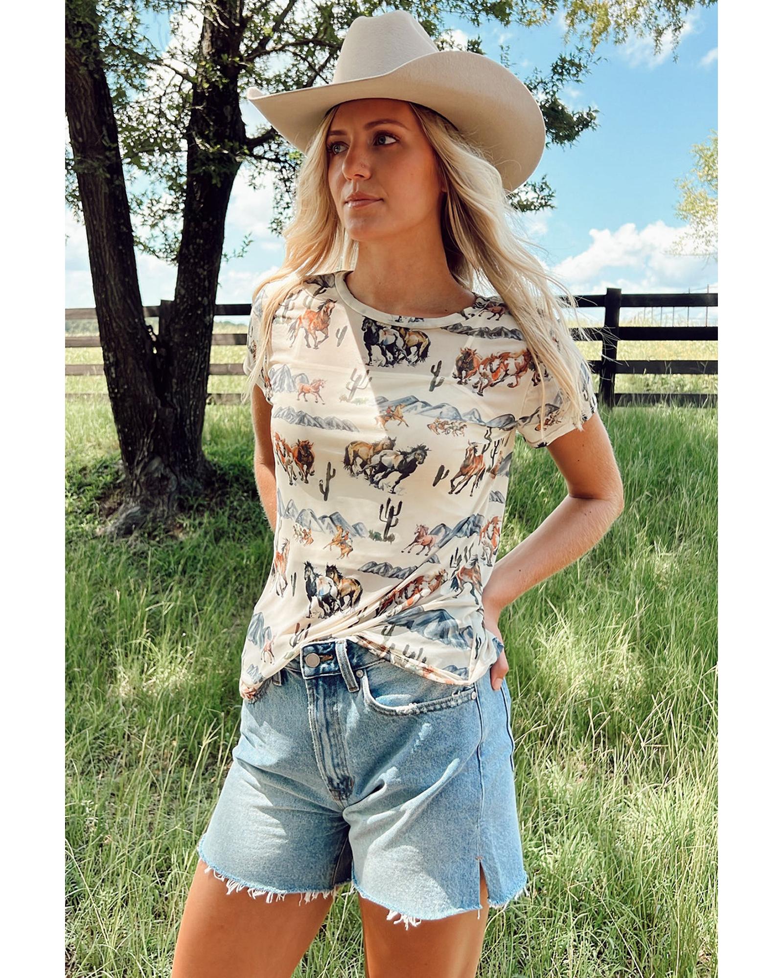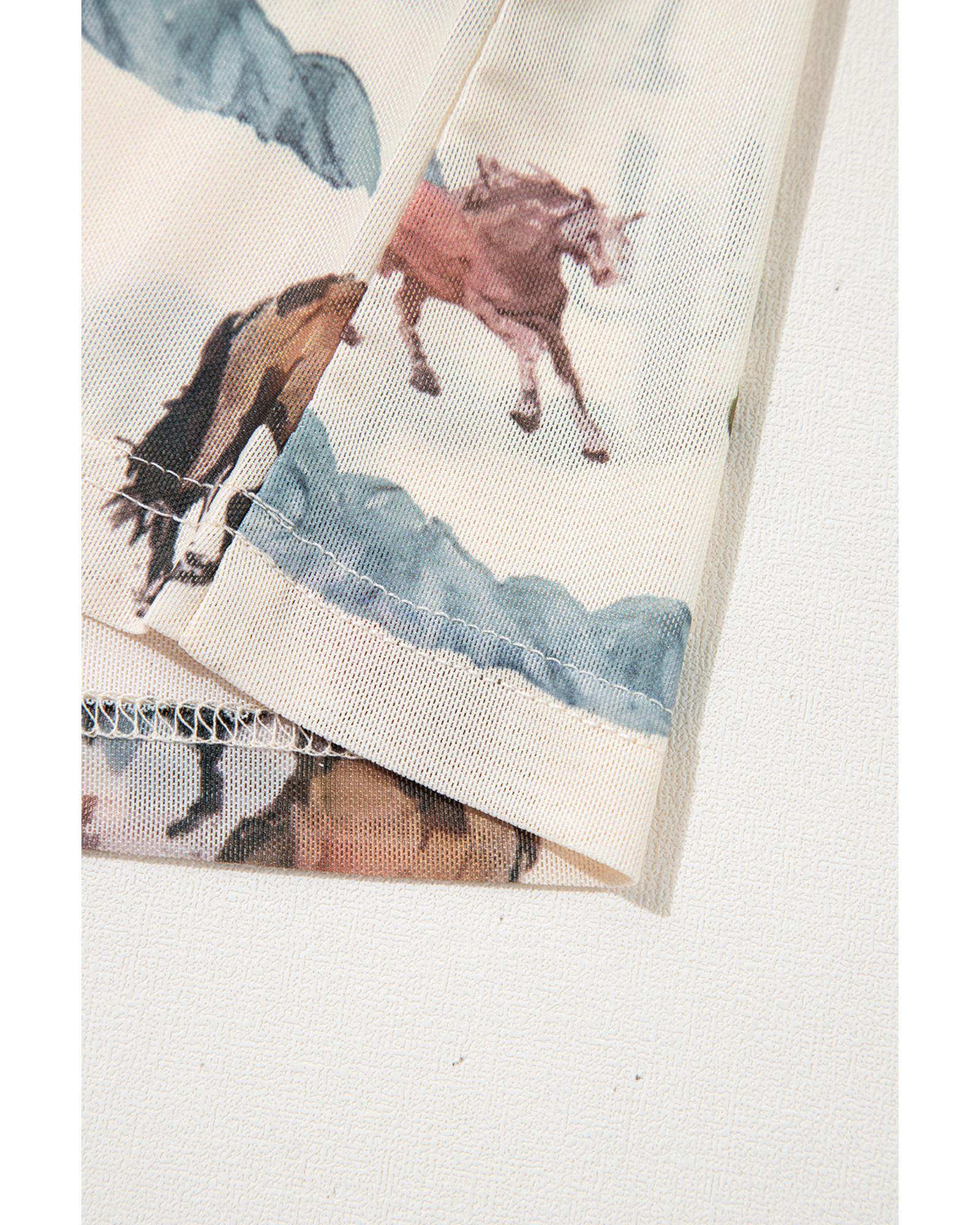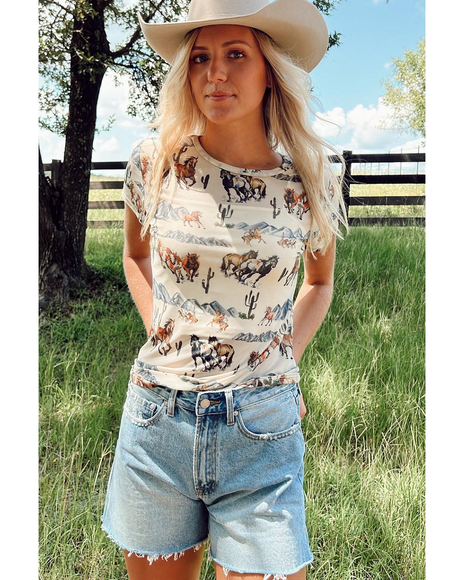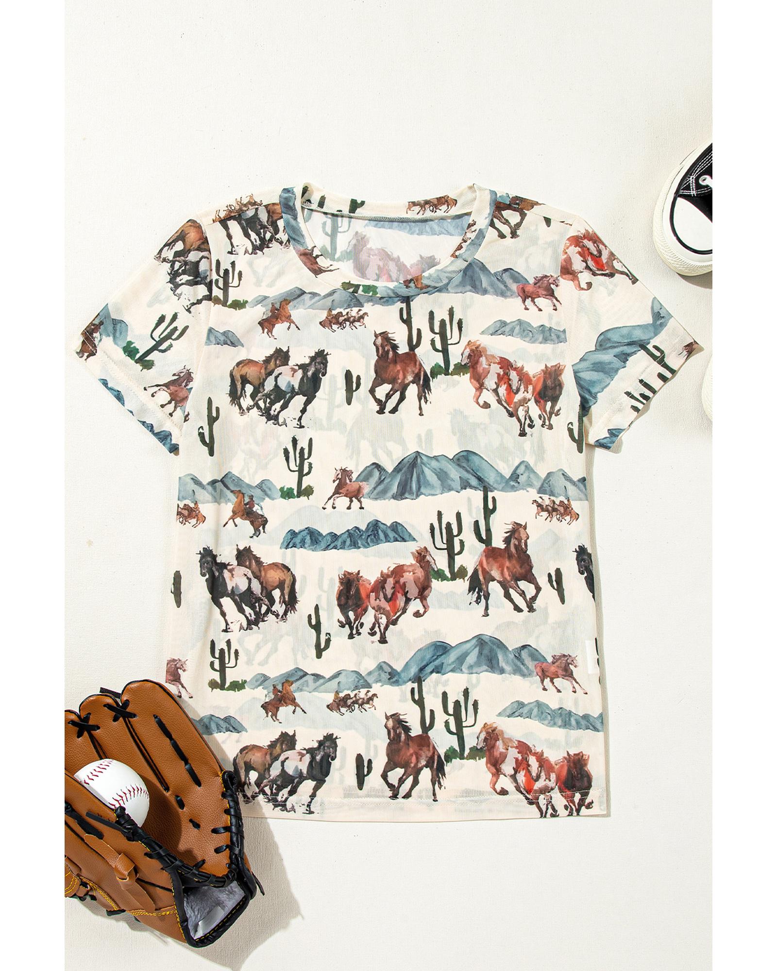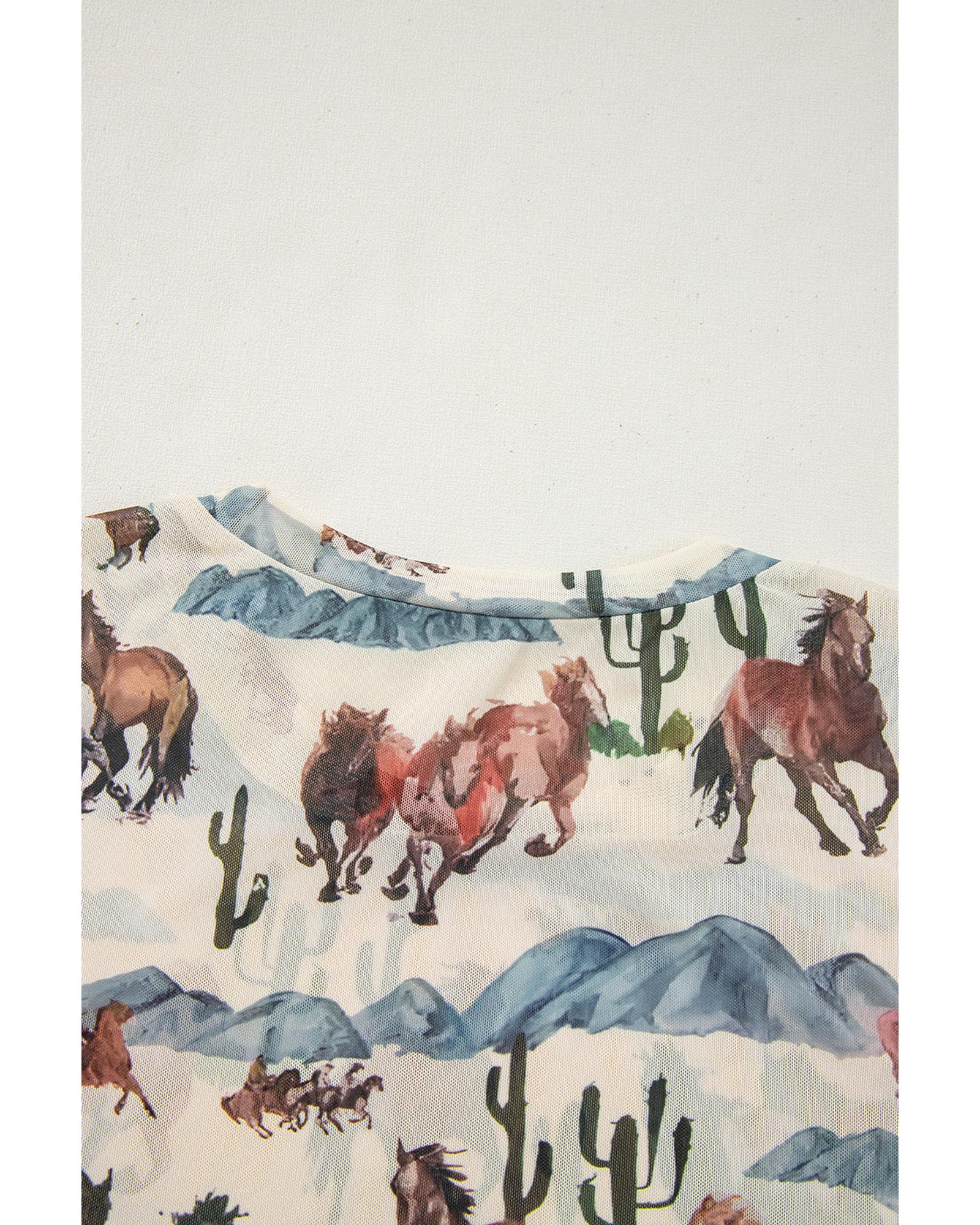 Beige Western Fashion Mustang River Printed Mesh T Shirt – L