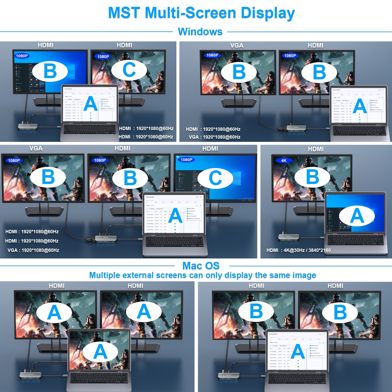 With MST feature support, BENFEI USB Type-C HUB could support up to 3 maximum screen output, 2 HDMI and VGA. The screen could be identical or different depends on your computer setting. The resolutions could be up to 3840 2160@30Hz, 1920×1080@60Hz (1080p Full HD) including 720p, 1600×1200; Please pay attention: the supported resolution is up to the output combination, please refer to the product description.