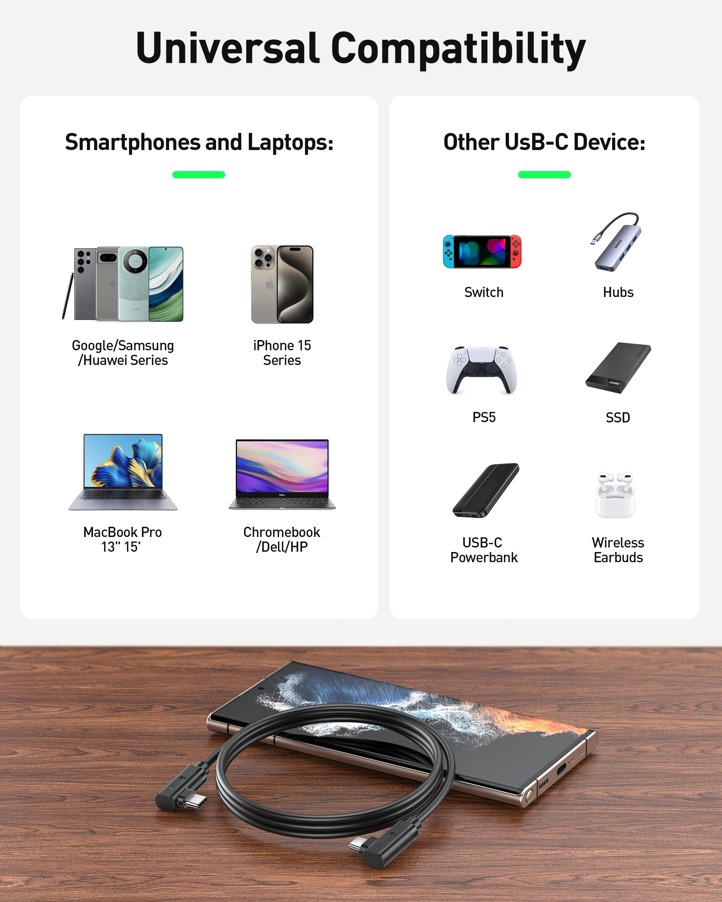 Features 90 angled connectors on both ends for a flush fit in tight spaces, reducing strain on device ports. Ideal for gaming, in-car charging, and bedside use.