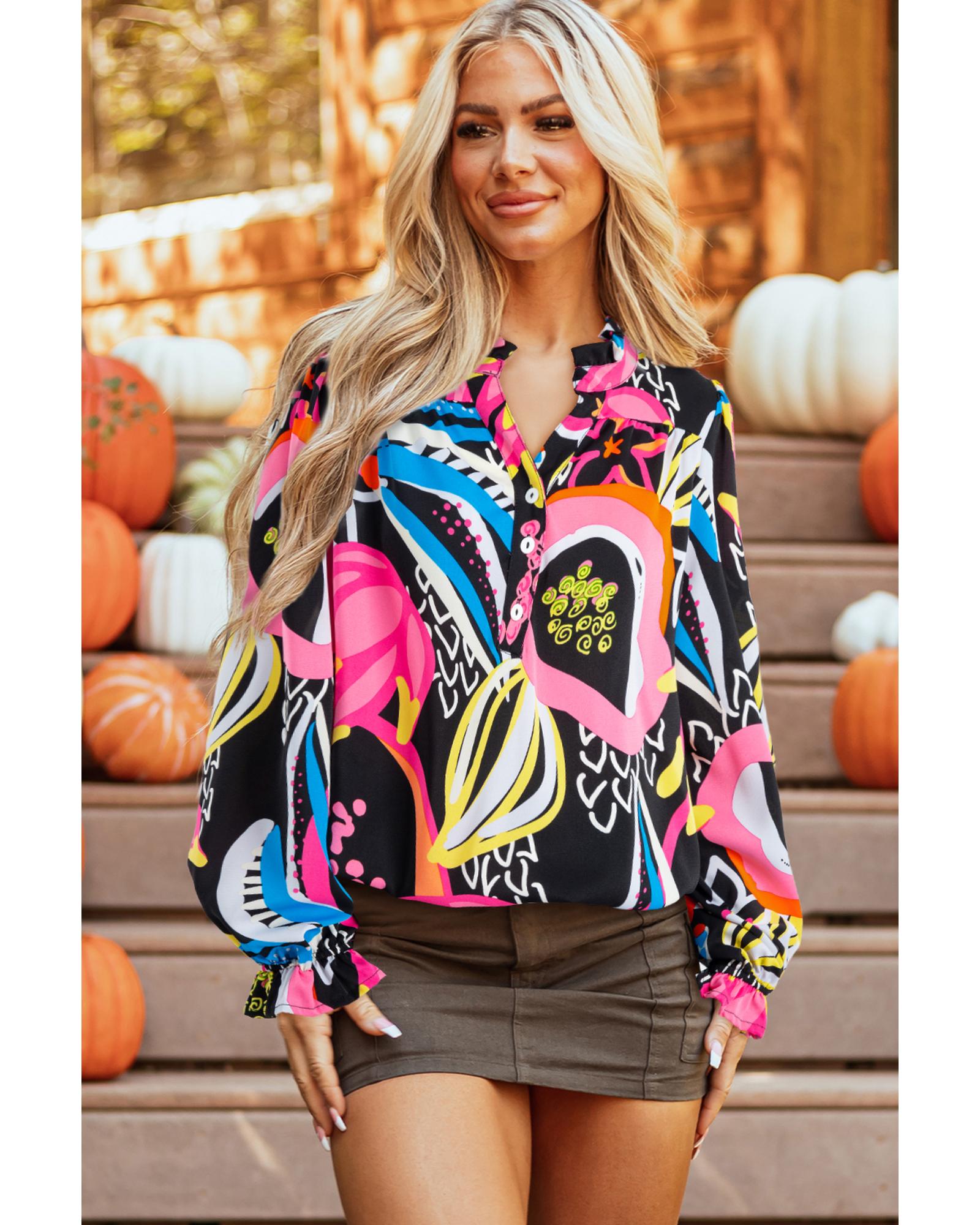 Black Abstract Print Ruffled Sleeve Buttoned V Neck Blouse – XL