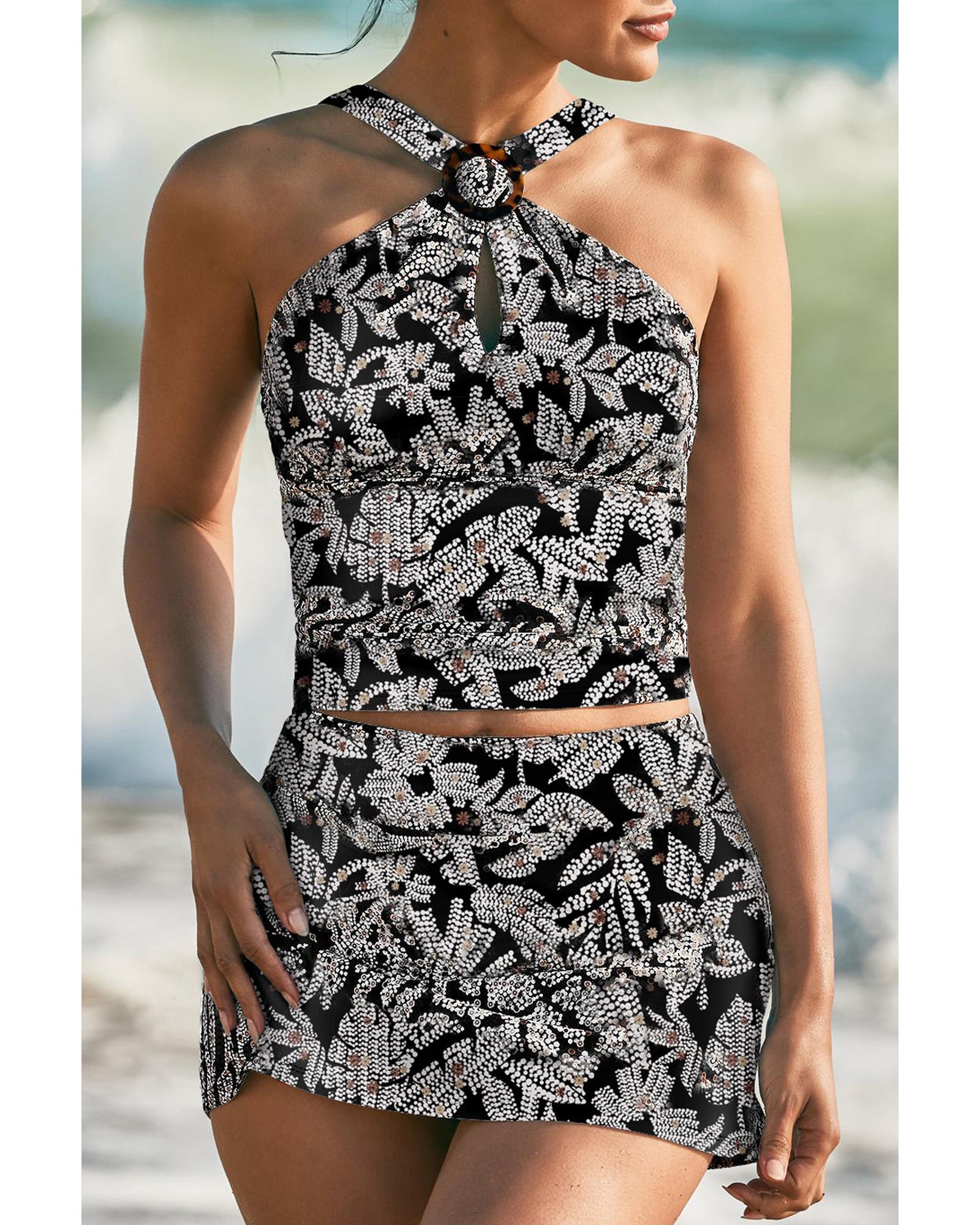 Black Abstract Printed Buckle Crossed Straps Skirted Tankini 2pcs Swimsuit – M